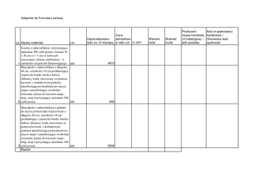 Załącznik 2a Formularz cenowy Lp. Nazwa materiału j.m. Ścierka z mikrowłókien, wytrzymująca minimum 300 cykli prania, rozmiar 30 x 30 cm (+/- 5 cm) w kolorach: czerwonym, żółtym, niebieskim – w 1 zależności od potrzeb Zamawiającego szt. Mop płaski z mikrowłókien o długości 40 cm, szerokości 10 cm pochłaniający cząsteczki brudu, bardzo dobrze chłonacy wodę, mocowany za pomocą kieszeni, z dodatkowym paskiem umożliwiającym bezdotykowe użycie mopa i umożliwiające swobodne wsuwanie stelaża do kieszeni mopa , mop, mop wytrzymujący minimum 300 2 cykli prania szt. Mop płaski z mikrowłókien z pętlami do mycia powierzchni wejściowych o długości 40 cm, szerokości 10 cm pochłaniający cząsteczki brudu, bardzo dobrze chłonacy wodę, mocowany za pomocą kieszeni, z dodatkowym paskiem umożliwiającym bezdotykowe użycie mopa i umożliwiające swobodne wsuwanie stelaża do kieszeni mopa , mop, mop wytrzymujący minimum 300 3 cykli prania szt. Razem Cena Zapotrzebowana jednostkow ilość na 12 miesięcy a netto szt. % VAT 4812 640 2000 Wartość netto Wartość brutto Producent i nazwa handlowa (nr katalogowy – jeśli posiada) Ilość w opakowaniu handlowym / Oferowana ilość opakowań