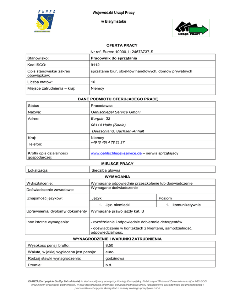 Wojewódzki Urząd Pracy w Białymstoku OFERTA PRACY Nr ref. Eures: 10000-1124673737-S Stanowisko: Pracownik do sprzątania Kod ISCO: 9112 Opis stanowiska/ zakres obowiązków: sprzątanie biur, obiektów handlowych, domów prywatnych Liczba etatów: 10 Miejsce zatrudnienia – kraj: Niemcy DANE PODMIOTU OFERUJĄCEGO PRACĘ Status Pracodawca Nazwa: Oehlschlegel Service GmbH Adres: Burgstr. 32 06114 Halle (Saale) Deutschland, Sachsen-Anhalt Kraj: Niemcy +49 (3 45) 4 78 21 27 Telefon: Krótki opis działalności gospodarczej: www.oehlschlegel-service.de – serwis sprzątający MIEJSCE PRACY Siedziba główna Lokalizacja: WYMAGANIA Wykształcenie: Doświadczenie zawodowe: Znajomość języków: Wymagane odpowiednie przeszkolenie lub doświadczenie Wymagane doświadczenie Język Poziom 1. Jęz. niemiecki 1. komunikatywnie Uprawnienia/ dyplomy/ dokumenty Wymagane prawo jazdy kat. B Inne istotne wymagania: - rozróżnianie i odpowiednie dobieranie detergentów. - doświadczenie w kontaktach z klientami, samodzielność, odpowiedzialność. WYNAGRODZENIE I WARUNKI ZATRUDNIENIA Wysokość pensji brutto: 8,50 Waluta, w jakiej wypłacana jest pensja: euro Rodzaj stawki wynagrodzenia: godzinowa Premie: b.d. EURES (Europejskie Służby Zatrudnienia) to sieć współpracy pomiędzy Komisją Europejską, Publicznymi Służbami Zatrudnienia krajów UE/ EOG oraz innych organizacji partnerskich, w celu dostarczania informacji, usług pośrednictwa pracy i poradnictwa zawodowego dla pracodawców i pracowników chcących skorzystać z zasady wolnego przepływu osób Dodatkowe świadczenia Pracodawca zapewnia zakwaterowanie Nazwa firmy, z którą zostanie podpisana umowa: Oehlschlegel Service GmbH Rodzaj umowy: Umowa o pracę. Wymiar czasu pracy Praca na pełen etat Czas trwania umowy: Początkowo na czas określony na 12 miesięcy z możliwością przedłużenia na czas nieokreślony. Liczba godzin tygodniowo: 39 Zmiany i praca w dni wolne: tak Data rozpoczęcia: Od zaraz SPOSÓB SKŁADANIA WNIOSKU Wymagane dokumenty CV Język, w którym muszą być sporządzone przedkładane dokumenty: niemiecki Do kogo należy wysłać dokumenty: do pracodawcy Gdzie należy wysłać dokumenty: Elektronicznie: [email protected] Dane teleadresowe doradcy EURES lub przedstawiciela pracodawcy: Frau Schneider +49 (3 45) 4 78 21 27 WAŻNOŚĆ Data publikacji: 02.07.2015r. Termin przedkładania podań o pracę / zakończenia ważności oferty: Do odwołania Uprzejmie informujemy, że skontaktujemy się wyłącznie z wybranymi kandydatami. UWAGA: Umowa z zagranicznym pracodawcą zostanie zawarta zgodnie z prawem kraju zatrudnienia. Oznacza to, że wszystkie roszczenia odnośnie do warunków, które obejmuje umowa, można kierować wyłącznie do odpowiedniego sądu w kraju zatrudnienia. Publiczne służby zatrudnienia (EURES) nie mogą pośredniczyć ani reprezentować pracownika w sądzie kraju zatrudnienia w przypadku sporu z pracodawcą. 1. Publiczne służby zatrudnienia (EURES) dokładają wszelkich starań, aby zapewnić rzetelność i wiarygodność ofert pracy zgłoszonych w lokalnym urzędzie pracy. Należy wyjaśnić, że oferta pracy została zgłoszona przez stronę trzecią i EURES nie odpowiada za ewentualne rozbieżności między warunkami pracy określonymi w ofercie pracy i warunkami oferowanymi przez potencjalnego pracodawcę. 2. Publiczne służby zatrudnienia (EURES) informują, że będą zbierać, przetwarzać i przekazywać potencjalnym pracodawcom zgodnie z przepisami dotyczącymi ochrony danych osobowych wszystkie dane osobowe dostarczone przez osoby poszukujące pracy. EURES (Europejskie Służby Zatrudnienia) to sieć współpracy pomiędzy Komisją Europejską, Publicznymi Służbami Zatrudnienia krajów UE/ EOG oraz innych organizacji partnerskich, w celu dostarczania informacji, usług pośrednictwa pracy i poradnictwa zawodowego dla pracodawców i pracowników chcących skorzystać z zasady wolnego przepływu osób