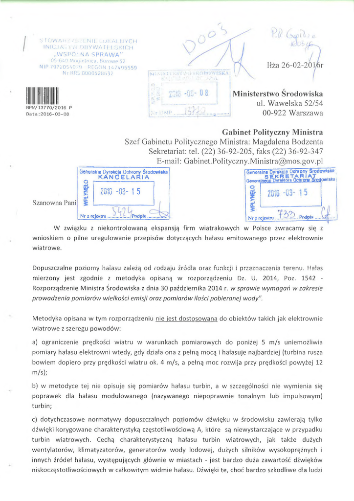 S 1'O W A H i- / S <' L N IL I- U K A l N Y C H I N I C J A i vV O B Y W A T E L S K I C H „W SPÓ ' NA S P R A W A ” 05-640 Mogielnica, Borowe 52 NIP 7972054079 REGON 147495559 Nr KR3 0000528632 R P W / 13770/2016 P Data:2016-03-08 Iłża 26-02-20 m r |VSi ¿S i ' M inisterstwo Środowiska ul. W awelska 52/54 00-922 Warszawa i>•:r i :N P ..... Gabinet Polityczny Ministra Szef Gabinetu Politycznego Ministra: M agdalena Bodzenta Sekretariat: tel. (22) 36-92-205, faks (22) 36-92-347 E-mail: [email protected] Gonoralna Dyre*o|fl Ochrony środowi**»; Q Generalojafi¡5 *r«ktor7^tTfony^rodgwtska Garrernlna Dyrekcja Ochrony środow iska Q KANCELARIA 2G1G "03- 1 5 Szanowna Pani Nr z rejestru ........i.x....fPndph Podpt* Nr z rejestru W związku z nieko ntrolow aną ekspansją firm w iatrako w ych w Polsce zw racam y się z w nioskiem o pilne uregulow anie przepisów dotyczących hałasu em itow anego przez elektro w n ie w ia tro w e . Dopuszczalne poziom y hałasu zależą od rodzaju źródła oraz funkcji i przeznaczenia te ren u . Hałas m ierzony je st zgodnie z m etodyka opisaną w rozporządzeniu Dz. U. 2014, Poz. 1542 - Rozporządzenie M inistra Środow iska z dnia 30 października 2014 r. w sp ra w ie w ym agań w za kresie p ro w a d zen ia p o m ia ró w w ielko ści em isji oraz p o m ia ró w ilości p o b iera n ej w ody". M etodyka opisana w tym rozporządzeniu nie jest dostosow ana do obiektów takich jak elektro w n ie w ia tro w e z szeregu pow odów : a) ograniczenie prędkości w iatru w w arunkach pom iarow ych do poniżej 5 m /s uniem ożliw ia pom iary hałasu elektrow ni w ted y, gdy działa ona z pełną mocą i hałasuje najbardziej (turbina rusza bowiem dopiero przy prędkości w iatru ok. 4 m /s, a pełną moc rozw ija przy prędkości powyżej 12 m /s); b) w m etodyce tej nie opisuje się pom iarów hałasu tu rb in, a w szczególności nie w ym ien ia się popraw ek dla hałasu m odulow anego (nazyw anego n iepopraw nie tonalnym lub im pulsow ym ) tu rb in ; c) dotychczasow e n orm atyw y dopuszczalnych poziom ów dźwięku w środow isku zaw ierają tylko dźwięki korygow ane charakterystyką częstotliw ościow ą A, które są n iew ystarczające w przypadku turbin w ia tro w ych . Cechą charakterystyczn ą hałasu turbin w iatro w ych , jak także dużych w e n tylato ró w , klim atyzatoró w , generato rów wody lodow ej, dużych silników w ysokoprężnych i innych źródeł hałasu, w ystępujących głównie w m iastach - jest bardzo duża zaw artość dźw ięków n iskoczęstotliw ościow ych w całkow itym w idm ie hałasu. Dźwięki te , choć bardzo szkodliw e dla ludzi i w ystępu jące w środow isku, są elim inow ane z w ynikó w pom iarów skutkiem stosow ania korekcji ch arakterystyki A (dostosow anej do charakterystyki słuchu człow ieka). Niestety szkodliw e są nie tylko dźwięki słyszalne, ale także niesłyszalne aż do infradźw ięków w łącznie. Ich zaw artość w w idm ie tu rb iny w iatro w ej je st przew ażająca (dom inują w nim częstotliw ości niesłyszalne) i dlatego w ystąpiła nagląca potrzeba ustanow ienia dodatkowych kryterió w hałasu środow iskow ego w postaci poziom ów skorygowanych charakterystyką w spółczesnej cyw ilizacji lub C, bardziej odpow iadającą urządzeniom technicznym w prow adzenia odpow iedniej popraw ki z powodu niskoczęstotliw ościow ej m odulacji hałasu. W ym agania takie są konieczne nie tylko ze względu na hałas turbin w iatro w ych , ale w ogóle na hałas generow any w środow isku przez współczesne urządzenia techniczne. Korekcja A powoduje zaniżanie wyników pomiarów hałasu o częstotliwości 50 Hz (bardzo typowego w miastach) 1000 razy, a hałasu o częstotliwości 20 Hz typowego dla turbin wiatrow ych aż 100 000 razy! Jest więc całkowicie nieprzydatna do pomiarów tego rodzaju hałasu, do którego zalicza się także hałas turbin wiatrowych. O pilnej konieczności dostosow ania przepisów w zakresie hałasu i uwzględnienie w nich hałasu niskoczęstotliw ościow ego i infradźw iękow ego napisano także w raporcie NIK N re w id . 131/2014/P/13/189/LW R ) " LOKALIZACJA I BUDOW A LĄDOWYCH FARM W IATROW YCH" W nioski do "M in istra Śro dow iska o rozw ażenie podjęcia in icjatyw y legislacyjn ej w z a kresie: m zm iany rozporządzenia M in istra Śro d ow iska z dnia 14 czerw ca 2 0 07 r. w sp ra w ie dopuszczalnych p o ziom ó w hałasu w śro d o w isku , poprzez określen ie dopuszczalnych p o zio m ó w hałasu in fra d źw ięko w eg o w śro d o w isku , ■ określenia m eto dolo gii oceny poziom u hałasu em ito w anego przez elektro w n ie w ia tro w e w czasie ich o p tym a ln ej ek sp lo a ta cji." Przyjęcie reguł, które powinny być wprowadzone w polskim prawie, aby ograniczyć patologie na etapie projektowania i uzgodnień farm wiatrow ych Pom iary hałasu turbin mogą być prowadzone dopiero po ich w yb ud o w aniu. Jeśli w ykażą przekroczenia dopuszczalnych poziom ów - pojawi się problem w praktyce n iem ożliw y do rozw iązania zgodnego z praw em . Turbina będzie m usiał być np. zatrzym yw ana nocam i. Dlatego niezw ykle w ażne są rzetelne obliczenia projektow e i prognozowanie hałasu oraz jego zasięgu m etodam i obliczeń kom puterow ych. Powinni je w ykonyw ać akustycy, a nie projektanci nie znający praw akustyki i muszą być przestrzegane następujące podstaw ow e zasady. a). Powinna zostać praw nie zakazana m anipulacja „op tym alizo w aniem '' (ograniczaniem) mocy akustycznej turbin w nocy, która jest zabiegiem w yłącznie propagandowym , aby nie pow iedzieć zwykłym oszustw em w stosunku do m ieszkańców te ren ó w zanieczyszczonych hałasem , a także -pstosunku do urzędników RDOŚ i PPIS - często bezkrytycznie to akceptujących, aby nakłonić ich do uzgadniania in w estycji, które uzgodnione nie powinny być. Nie ma bowiem w Polsce m ożliwości urzędow ej kontroli takiego "o p tym alizow an ia", a 