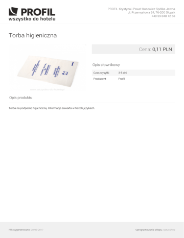 PROFIL Krystyna i Paweł Kosowicz Spółka Jawna ul. Przemysłowa 34, 76-200 Słupsk +48 59 848 12 63 Torba higieniczna Cena: 0,11 PLN Opis słownikowy Czas wysyłki 3-5 dni Producent Profil Opis produktu Torba na podpaskę higieniczną. Informacja zawarta w trzech językach. Plik wygenerowano: 08-03-2017 Powered by TCPDF (www.tcpdf.org) Oprogramowanie sklepu: AptusShop