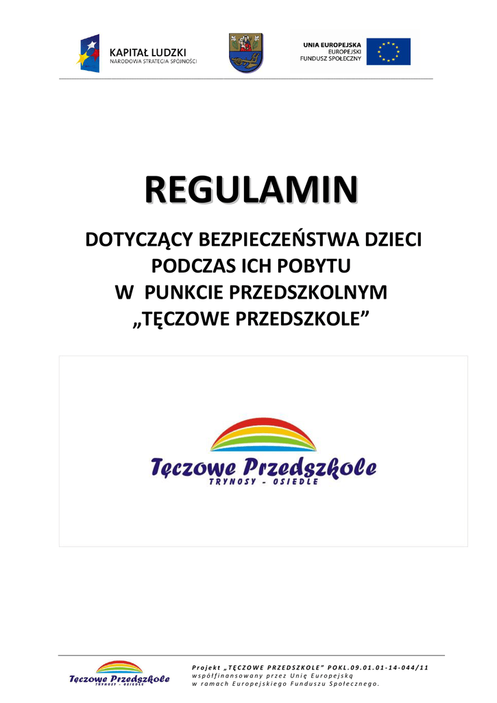 ______________________________________________________________________________________________________________________________________________________ REGULAMIN DOTYCZĄCY BEZPIECZEŃSTWA DZIECI PODCZAS ICH POBYTU W PUNKCIE PRZEDSZKOLNYM „TĘCZOWE PRZEDSZKOLE” Projekt „TĘCZOWE PRZEDSZKOLE” POKL.09.01.01-14-044/11 współfinansowany przez Unię Europejską w ramach Europejskiego Funduszu Społecznego. ______________________________________________________________________________________________________________________________________________________ 1. 2. 3. 4. 5. 6. 7. 8. 9. 10. 11. 12. 13. Przedszkole sprawuje opiekę nad dziećmi, dostosowując metody i sposoby oddziaływań do wieku dziecka i jego możliwości rozwojowych, potrzeb środowiska z uwzględnieniem istniejących warunków lokalowych, a w szczególności zapewnia bezpośrednią i stałą opiekę nad dziećmi w czasie pobytu w placówce oraz w trakcie zajęć poza jej terenem. Nauczyciel musi być świadomy odpowiedzialności za życie i zdrowie dzieci, jaka na nim spoczywa. Troska o pełne bezpieczeństwo wychowanków powinna być priorytetem wszystkich jego działań. Nauczyciel musi mieć świadomość, że odpowiada za zdrowie i życie dzieci, a REGULAMIN DOTYCZĄCY BEZPIECZEŃSTWA DZIECI PODCZAS ICH POBYTU W PUNKCIE PRZEDSZKOLNYM w przypadku ich narażenia poniesie za to pełną odpowiedzialność dyscyplinarną. Przedszkole zapewnia dzieciom pełne poczucie bezpieczeństwa zarówno pod względem fizycznym jak i psychicznym, za to poczucie bezpieczeństwa również odpowiada nauczyciel. Przedszkole w swoich działaniach stosuje obowiązujące przepisy bhp i ppoż., które są określone w Instrukcji BHP i Instrukcji Ppoż. obowiązujących na terenie punktu przedszkolnego. Dzieci są przyprowadzane do punktu przedszkolnego od godziny 7.00 przez rodziców bądź inne osoby upoważnione przez rodziców. Rodzice są poinformowani o sposobie przyprowadzania i odbierania dziecka z przedszkola. Obowiązuje zasada, że rodzice rozbierają dziecko i wprowadzają do sali grupy. Analogicznie sami odbierają dziecko bezpośrednio z grupy. Odbiór dzieci z punktu przedszkolnego jest możliwy wyłącznie przez rodziców lub inne osoby dorosłe przez nich upoważnione (pisemne upoważnienie powinno być złożone na początku roku szkolnego, a potem przechowywane w dokumentacji w przedszkola). Nauczyciel powinien nie tylko wiedzieć, ale także widzieć, kto odbiera dziecko z punktu przedszkolnego. Z terenu przedszkolnego można pozwolić dziecku odejść dopiero wtedy, gdy rodzic dotarł na miejsce pobytu grupy. W chwili odebrania dziecka za jego bezpieczeństwo odpowiada rodzic. Dzieci są objęte ciągłym dozorem i opieką. Nie mogą być pozostawione bez opieki dorosłych nawet na sekundę. Od rana są organizowane zajęcia i zabawy, aby dzieci mogły spędzać czas atrakcyjnie i aktywnie. Na nauczycielu spoczywa obowiązek takiego zajmowania się dziećmi, aby nie miały czasu tęsknić za rodzicami. Dzieciom, które już weszły do sali, nie wolno podczas dnia wychodzić z niej samodzielnie, bez pozwolenia i dozoru. Nie wolno im też samowolnie wychodzić z budynku punktu przedszkolnego. Dziecko przez cały czas powinno być otoczone opieką nauczyciela lub upoważnionego pracownika punktu przedszkolnego. Podczas zabaw dowolnych w sali zwraca się uwagę na zgodną i bezpieczną zabawę dzieci, zgodne korzystanie ze wspólnych zabawek. Nauczyciele obserwują dzieci podczas zabaw, kierują zabawą lub ją inspirują, ewentualnie interweniują w konflikty między dziećmi, jeśli te nie są w stanie same ich rozwiązać. W czasie zabaw dowolnych nauczyciel zwraca przede wszystkim uwagę na bezpieczeństwo dzieci, odpowiada za stan zabawek i sprzętu, którym bawią się dzieci. Projekt „TĘCZOWE PRZEDSZKOLE” POKL.09.01.01-14-044/11 współfinansowany przez Unię Europejską w ramach Europejskiego Funduszu Społecznego. ______________________________________________________________________________________________________________________________________________________ 14. Nauczyciel ustala wspólnie z dziećmi zasady i normy obowiązujące w grupie, wdraża dzieci 15. 16. 17. 18. 19. 20. 21. 22. 23. 24. 25. 26. systematycznie do zgodnej zabawy, do przestrzegania zasad zgodnego współżycia z rówieśnikami, uczestniczy w zabawach dzieci. Zapoznaje dzieci i ich rodziców z systemem kar i nagród obowiązujących w danej grupie. Nauczyciel nie prowadzi rozmów z innymi osobami podczas zabawy dzieci. Jego uwaga powinna być skupiona wyłącznie na podopiecznych. Nauczyciel powinien mieć świadomość, jakie mogą być konsekwencje jego nieuwagi. Podczas pobytu dzieci na terenie punktu przedszkolnego uczy się dzieci korzystania z urządzeń terenowych zgodnie z zasadami bezpieczeństwa. Ustala się normy i zasady korzystania z tego sprzętu. W czasie pobytu na terenie rekreacyjnym nie przewiduje się możliwości gromadzenia nauczycielek w jednym miejscu. Nauczyciele powinni być w bezpośrednim kontakcie ze swoimi dziećmi i przebywać w miejscach największych zagrożeń. Podczas zabawy nie wolno dzieciom oddalać się samowolnie z terenu. Dzieci wracają z terenu kolumną prowadzoną przez nauczyciela. Po ustawieniu podopiecznych w kolumnę nauczyciel powinien każdorazowo sprawdzić, czy wszystkie dzieci będące w danym dniu w jego grupie znajdują się w kolumnie. Podczas zajęć obowiązkowych zawsze należy przemyśleć organizacyjnie zajęcia, tok ćwiczeń ruchowych, przebieg zabawy pod kątem bezpieczeństwa dzieci. Nauczyciel musi przewidywać ewentualne zagrożenia i im przeciwdziałać. Przy przemieszczaniu się grupy, np. na wycieczki piesze, dzieci ustawiają się parami i tak samo się przemieszczają. Organizacja wycieczek wyjazdowych odbywa się na podstawie pisemnej zgody rodziców na udział dziecka w wycieczce. Przed wyjazdem nauczyciel powinien przygotować pisemną listę dzieci i opiekunów. O