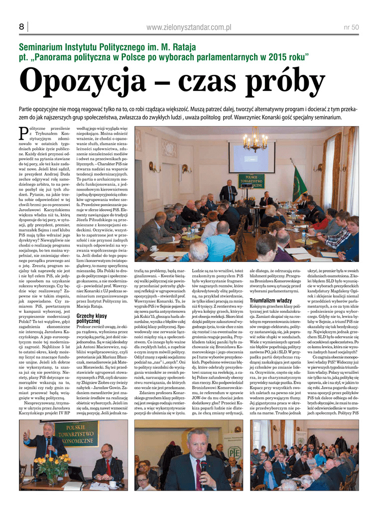 8 | www.zielonysztandar.com.pl nr 50 Seminarium Instytutu Politycznego im. M. Rataja pt. „Panorama polityczna w Polsce po wyborach parlamentarnych w 2015 roku” Opozycja – czas próby Partie opozycyjne nie mogą reagować tylko na to, co robi rządząca większość. Muszą patrzeć dalej, tworzyć alternatywny program i docierać z tym przekazem do jak najszerszych grup społeczeństwa, zwłaszcza do zwykłych ludzi , uważa politolog prof. Wawrzyniec Konarski gość specjalny seminarium. P olityczne przesilenie z Trybunałem Konstytucyjnym zdominowało w ostatnich tygodniach polskie życie publiczne. Każdy dzień przynosi odpowiedź na pytania stawiane do tej pory, ale też każe zadawać nowe. Jeżeli ktoś sądził, że prezydent Andrzej Duda zechce odgrywać rolę samodzielnego arbitra, to na pewno pozbył się już tych złudzeń. Pytanie, na jakie trzeba sobie odpowiedzieć w tej chwili brzmi: po co prezesowi Jarosławowi Kaczyńskiemu większa władza niż ta, którą dysponuje do tej pory, w sytuacji, gdy prezydent, premier, marszałek Sejmu i szef klubu PiS mają tylko wdrażać jego dyrektywy? Niewątpliwie nie chodzi o realizację programu socjalnego, bo ten można wypełniać, nie zmieniając obecnego porządku prawnego ani o jotę. Zresztą program socjalny tak naprawdę nie jest i nie był celem PiS, ale jedynie sposobem na uzyskanie sukcesu wyborczego. Czy będzie więc realizowany? Zapewne nie w takim stopniu, jak zapowiadano. Czy zamiarem PiS, powtarzanym w kampanii wyborczej, jest przyspieszenie modernizacji Polski? To też wątpliwe, gdyż zagadnienia ekonomiczne nie interesują Jarosława Kaczyńskiego. A jego eurosceptycyzm może tej modernizacji zagrozić. Najbliższe 5 lat to ostatni okres, kiedy możemy liczyć na znaczące fundusze unijne. Jeżeli ich dobrze nie wykorzystamy, ta szansa już się nie powtórzy. Niestety, plany PiS dotyczące samorządów wskazują na to, że sejmiki czy rady gmin zamiast pracować będą wciągnięte w walkę polityczną. Niesprecyzowany, trzymany w ukryciu przez Jarosława Kaczyńskiego projekt IV RP według jego wizji wygląda więc niepokojąco. Można odnieść wrażenie, że chodzi o opanowanie służb, złamanie niezależności sądownictwa, zduszenie niezależności mediów i odwet na przeciwnikach politycznych. – Charakter PiS nie stwarza nadziei na wsparcie tendencji modernizacyjnych. To partia o archaicznym modelu funkcjonowania, z jednoosobowym kierownictwem i pełną dyspozycyjnością członków ugrupowania wobec szefa. Prawdziwe pomieszanie panuje w sferze ideowej PiS. Elementy nawiązujące do tradycji Józefa Piłsudskiego są przemieszane z koncepcjami endeckimi. Oczywiście, wszystko to zapatrzone jest w przeszłość i nie przynosi żadnych ważnych odpowiedzi na wyzwania współczesnego świata. Jeśli dodać do tego populizm i konserwatyzm światopoglądowy, to mamy specyficzną mieszankę. Dla Polski to droga do politycznego i społecznego skansenu, a nie modernizacji – powiedział prof. Wawrzyniec Konarski z UJ podczas seminarium zorganizowanego przez Instytut Polityczny im. Macieja Rataja. Grzechy klasy politycznej Profesor zwrócił uwagę, że ekipa rządowa, wyłoniona przez zwycięską partię, jest dość niejednorodna. Są w niej ideolodzy jak Antoni Macierewicz, najbliżsi współpracownicy, czyli pretorianie jak Mariusz Błaszczak, menadżerowie jak Mateusz Morawiecki. Są też przedstawiciele ugrupowań stowarzyszonych z PiS, czyli skruszony Zbigniew Ziobro czy świeży nabytek – Jarosław Gowin. Zadaniem menedżerów jest znalezienie środków na realizację obietnic wyborczych. Jeżeli im się uda, mogą nawet wzmocnić swoją pozycję. Jeśli jednak na- trafią na problemy, będą marginalizowani. – Kwestie bieżącej walki politycznej nie powinny przesłaniać potrzeby głębszej refleksji w ugrupowaniach opozycyjnych – stwierdził prof. Wawrzyniec Konarski. To, że wygrało PiS i w Sejmie pojawiła się nowa partia antysystemowa jak Kukiz’15, głosząca hasła absurdalne, wynika z błędów całej polskiej klasy politycznej. Spowodowały one zerwanie łączności między nią a społeczeństwem. Co innego było ważne dla zwykłych ludzi, a zupełnie o czym innym mówili politycy. Odżył znany z epoki socjalizmu podział na „nas” i „onych”. Oni to politycy niezdolni do wyciągania wniosków ze swoich porażek, narzucający społeczeństwu rozwiązania, do których ono wcale nie jest przekonane. Zdaniem profesora Konarskiego grzechem klasy politycznej jest swojego rodzaju rentierstwo, a więc wykorzystywanie pozycji do ułożenia się w życiu. Ludzie są na to wrażliwi, toteż znakomitym pomysłem PiS było wykorzystanie fragmentów nagranych rozmów, które dyskredytowały elitę polityczną, na przykład stwierdzenie, że tylko idioci pracują za mniej niż 6 tysięcy. Z rentierstwa wypływa kolejny grzech, którym jest obsesja reelekcji. Skoro ktoś dzięki polityce zakosztował wygodnego życia, to nie chce z nim się rozstać i na ewentualne zagrożenia reaguje paniką. Przykładem takiej paniki było zachowanie się Bronisława Komorowskiego i jego otoczenia po I turze wyborów prezydenckich. Popełniono wówczas błędy, które odebrały prezydentowi szansę na reelekcję, a całej Polsce zafundowały obecny stan rzeczy. Kto podpowiedział Bronisławowi Komorowskiemu, że referendum w sprawie JOW-ów da mu chociaż jeden dodatkowy głos? Przecież Kukiza poparli ludzie nie dlatego, że chcą zmiany ordynacji, ale dlatego, że odrzucają establishment polityczny. Przegrana Bronisława Komorowskiego stworzyła nową sytuację przed wyborami parlamentarnymi. Triumfalizm władzy Kolejnym grzechem klasy politycznej jest także sondażokracja. Zamiast skupiać się na rzetelnym reprezentowaniu interesów swojego elektoratu, politycy zastanawiają się, jak poprawić sobie słupki w sondażach. Wiele z wymienionych uprzednio błędów popełniają politycy zarówno