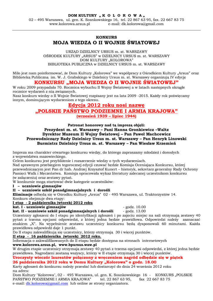 DOM KULTURY „ K O L O R O W A „ 02 – 495 Warszawa, ul. gen. K. Sosnkowskiego 16, tel. 22 867 63 95, fax. 22 667 83 75 www.kolorowa.arsus.pl e-mail: [email protected] KONKURS MOJA WIEDZA O II WOJNIE ŚWIATOWEJ URZĄD DZIELNICY URSUS m. st. WARSZAWY OŚRODEK KULTURY „ARSUS” w DZIELNICY URSUS m. st. WARSZAWY DOM KULTURY „KOLOROWA” BIBLIOTEKA PUBLICZNA w DZIELNICY URSUS m. st. WARSZAWY Miło jest nam poinformować, że Dom Kultury „Kolorowa” we współpracy z Ośrodkiem Kultury „Arsus” oraz Biblioteką Publiczną im. W. J. Grabskiego w Dzielnicy Ursus m. st. Warszawy organizują IV edycję KONKURSU „MOJA WIEDZA O II WOJNIE ŚWIATOWEJ” W roku 2009 przypadała 70. Rocznica wybuchu II Wojny Światowej a w latach następnych okrągłe rocznice wydarzeń z nią związanych. Nasz konkurs wiedzy o II Wojnie Światowej rozpisany jest na lata 2009 -2015. Każdy rok poświęcamy innym, dominującym wydarzeniom z tego okresu. Edycja 2012 roku nosi nazwę „POLSKIE PAŃSTWO PODZIEMNE I ARMIA KRAJOWA” (wrzesień 1939 – lipiec 1944) Patronat honorowy nad tą imprezą objęli: Prezydent m. st. Warszawy – Pani Hanna Gronkiewicz –Waltz Dyrektor Muzeum II Wojny Światowej – Pan Paweł Machcewicz Przewodniczący Rady Dzielnicy Ursus m. st. Warszawy – Pan Henryk Linowski Burmistrz Dzielnicy Ursus m. st. Warszawy – Pan Wiesław Krzemień Impreza ma charakter otwartego konkursu wiedzy, do którego zapraszamy młodzież i dorosłych z województwa mazowieckiego. Celem konkursu jest przybliżenie i rozszerzenie wiedzy o tych wydarzeniach. Nad sprawnym przebiegiem tegorocznej edycji czuwać będzie Komisja Oceniająca Konkursu, której przewodniczącym jest Pan dr hab. Andrzej Krzysztof Kunert – historyk, sekretarz generalny Rady Ochrony Pamięci Walk i Męczeństwa. Komisja opracowała wykaz literatury zalecanej uczestnikom konkursu (w załączeniu) oraz zestawy pytań. W konkursie mogą startować dwie kategorie uczestników: I – uczniowie gimnazjów II – uczniowie szkół ponadgimnazjalnych i dorośli Eliminacje odbędą się w Ośrodku Kultury „Arsus” 02 - 495 Warszawa, ul. Traktorzystów 14. Konkurs obejmuje dwa etapy: I etap - 2 października (wtorek) 2012 roku kat. I - uczniowie gimnazjów - godz. 10.00 kat. II - uczniowie szkół ponadgimnazjalnych i dorośli - godz. 13.00 Uczestnicy zgłoszeni do I etapu po identyfikacji zgłoszeń i po zajęciu miejsc na sali otrzymają zestawy 40 pytań z trzema opcjami odpowiedzi, z której jedna będzie prawidłowa. Odpowiedzi należy zaznaczać znakiem „X”. Na wypełnienie zestawu uczestnicy konkursu będą dysponowali 60 minutami. Każda prawidłowa odpowiedź daje 1 punkt. Do II etapu zakwalifikują się uczestnicy, którzy otrzymają 30 i więcej punktów. II etap - 16 października (wtorek) 2012 roku. Informacja o zakwalifikowanych do II etapu będzie dostępna na stronach internetowych www.kolorowa.arsus.pl, www.bpursus.waw.pl W drugim etapie uczestnicy otrzymają zestawy 40 pytań z trzema opcjami odpowiedzi, z której jedna będzie prawidłowa. Nagrodzeni zostaną wszyscy, którzy w II etapie otrzymają 30 i więcej punktów. Uroczysty wieczór laureatów połączony z wręczeniem nagród odbędzie się w piątek 26 października 2012 roku w Domu Kultury „Kolorowa” o godz. 18.00 Karty zgłoszeń do konkursu należy przesłać lub dostarczyć do dnia 24 września 2012 roku na adres: Dom Kultury "Kolorowa", 02 - 495 Warszawa, ul. gen. K. Sosnkowskiego 16 - KONKURS „POLSKIE PAŃSTWO PODZIEMNE I ARMIA KRAJOWA” tel. 22 867 63 95, fax 22 667 83 75 e-mail: [email protected] lub online ze strony organizatora. Szczegółowych informacji o konkursie udziela: Dom Kultury „ Kolorowa ”, 02 – 495 Warszawa, ul. gen. K. Sosnkowskiego 16, Sekretariat II piętro, pokój 227 lub Janusz Łukaszewicz pokój 230 - tel. 22 867 63 95. Powyższa informacja będzie dostępna również na stronach internetowych www.kolorowa.arsus.pl, www.bpursus.waw.pl LITERATURA ZALECANA UCZESTNIKOM IV EDYCJI KONKURSU „POLSKIE PAŃSTWO PODZIEMNE I ARMIA KRAJOWA” 1. 2. 3. 4. 5. 6. 7. 8. 9. 10. 11. 12. 13. 14. 15. 16. 17. 18. Borodziej Włodzimierz, Chmielarz Andrzej, Friszke Andrzej, Kunert Andrzej K. : Polska Podziemna 1939 – 1945. Warszawa: Wydaw. Szkolne i Pedagogiczne, 1991. Bór-Komorowski Tadeusz: Armia podziemna. Wyd.8 popr. i uzup. Warszawa: Bellona: Oficyna Wydawnicza Rytm, 2009. Garliński Józef: Polska w drugiej wojnie światowej. Warszawa: Volumen: Bellona, 1994. Górski Grzegorz: Polskie Państwo Podziemne 1939 – 1945. Toruń: Fundacja „Archiwum Pomorskie Armii Krajowej”, 1998. Górski Grzegorz: Administracja Polski Podziemnej w latach 1939 – 1945. Toruń: Fundacja Inicjatyw Lokalnych „Pomerania”, 1995. Grabowski Waldemar: Delegatura Rządu Rzeczypospolitej Polskiej na Kraj. Warszawa: Inst.Wydaw. Pax, 1995. Karski Jan: Wielkie mocarstwa wobec Polski 1919 – 1945: od Wersalu do Jałty. Lublin: Wydaw. Uniwersytetu Marii Curie-Skłodowskiej, 1998. Korboński Stefan: Polskie Państwo Podziemne: Przewodnik po Podziemiu z lat 1939 – 1945. Warszawa: Świat Książki – Bertelsmann Media, 2008. Kunert Andrzej K. (oprac.): Generał Tadeusz Bór-Komorowski w relacjach i dokumentach. Warszawa: Oficyna Wydawnicza Rytm, 2000. Kunert Andrzej K. : Ilustrowany przewodnik po Polsce Podziemnej: 1939 – 1945. Warszawa: Wydaw. Naukowe PWN, 1996. Kunert Andrzej K.: Słownik biograficzny konspiracji warszawskiej; 1939 – 1944. T. 1-3. Warszawa: Inst. Wydaw. Pax, 1987. Machcewicz Paweł, Persak Krzysztof: II wojna światowa. Warszawa: Muzeum Historii Polski: Bellona, 2010. Ney-Krwawicz Marek: Komenda Główna Armii Krajowej 1939 – 1945. Warszawa; Inst. Wydaw. Pax, 1990. Nowak-Jeziorański Jan: Kurier z Warszawy. Wyd. 4. Kraków: Wydaw. Znak, 2005. Polskie podziemie na terenach Zachodniej Ukrainy i Zachodniej Białorusi w latach 1939 – 1941. Warszawa: Archiwum Ministerstwa Spraw Wewnętrznych i Administracji; Oficyna Wy