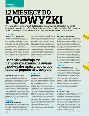 KARIERA 12 MIESIĘCY DO PODWYŻKI Prognozy ekonomiczne na rok 2012 są, co tu dużo ukrywać, takie sobie. Ale czy to koniecznie musi dotyczyć Ciebie? Aby osiągnąć sukces, trzeba mieć plan. Oto, co możesz zrobić przez najbliższe 12 miesięcy, by zdobyć awans i podwyżkę. Izabela Kielczyk STYCZEŃ ZNAJDŹ COŚ, CO CIĘ WYRÓŻNIA To znana psychologiczna zasada – to, co unikatowe, wydaje się innym wartościowsze. Dotyczy to również pracowników – ci, którzy mogą się pochwalić jakąś wyjątkową umiejętnością, nawet jeżeli nie ma to bezpośredniego przełożenia na pracę, wydają się szefom bardziej wartościowi. Zastanów się, czy masz umiejętności, zdolności, unikalne kompetencje, którymi wyróżniasz się pośród innych pracowników. Zajdź coś, co Cię wyróżnia . Może znasz język chiński albo robisz fantastyczne zdjęcia? To wszystko stanowi Twoje atuty. horyzonty. Kompetencje, które pomagają awansować, to nie tylko te stricte zawodowe. To także szerokie zainteresowania, niebanalne hobby oraz inne walory, które pozwalają zabłysnąć w wielu zawodowych sytuacjach. Oczywiście życzymy Ci jak najdłuższej kariery w Twojej obecnej firmie, jeżeli jesteś z niej zadowolony, ale fakty są takie, że każdy 30-latek najprawdopodobniej kilka razy w życiu zmieni pracę oraz profil zawodowy. Bądź przygotowany na zmiany, a zdobędziesz pewność siebie, która da Ci przewagę w przyszłych negocjacjach z szefem. O wiele lepiej startować z pozycji osoby, która ma wiele możliwości, niż przerażonej utratą pracy. Badania wskazują, że największe szanse na awans i podwyżkę mają pracownicy lubiani i popularni w zespole. LUTY KWIECIEŃ Badania psychologów z University of Hertfordshire wskazują, że nawet ludzie nieobeznani z modą oceniają innych po stroju. Właściciela garnituru na miarę dwukrotnie częściej ocenia się jako kompetentnego, bardziej pewnego siebie, elastycznego, odnoszącego sukcesy. Specjaliści od wizerunku są zgodni: „Jeżeli chcesz zarabiać milion dolarów, to musisz wyglądać jak milion dolarów”. Warto zatem zainwestować w dobry garnitur, teczkę, buty, zegarek. Dobrze dobrane ubrania sprawiają, że wyglądamy na osoby kompetentne i wiarygodne. Zobacz na menshealth.pl/styl, jak dobrać idealny garnitur. Co dzisiaj robiłeś? Z pewnością byłeś zajęty, w pośpiechu starałeś się załatwić wiele spraw, żeby zdążyć ze wszystkim na czas. Nic dziwnego, że jesteś zmęczony i wyczerpany. Wyznacz sobie każdego dnia 20-30 minut tylko dla siebie. Niech to będzie czas na odpoczynek, medytacje, spacer, czytanie lub na „nic nierobienie”. Staraj się to robić regularnie, a docenisz, jak ważna jest chwila oddechu, oderwania się od spraw i problemów zawodowych. Zdaniem naukowców nawet taka mała zmiana w Twoim planie dnia sprawi, że staniesz się mniej podatny na syndrom wypalenia zawodowego i niszczące skutki stresu. Jeżeli możesz sobie na to pozwolić, kup sobie psa – nie ma lepszego sposobu na zmuszenie się do codziennych spacerów na świeżym powietrzu, niezależnie od pogody. A psia radość, gdy wychodzcie razem, pozwala sobie uświadomić właściwą hierarchię spraw w życiu. JAK CIĘ WIDZĄ, TAK CIĘ PISZĄ MARZEC ROZWIJAJ SIĘ NIEUSTANNIE Kształć się. Zapisz się na kursy i szkolenia, dzięki którym poszerzysz swoją wiedzę, a także rozwiniesz nowe umiejętności zawodowe. Podnoś kwalifikacje, ucz się języków, rozwijaj, poszerzaj 46 ZATRZYMAJ SIĘ MAJ POKAŻ SIĘ Z DOBREJ STRONY W każdej firmie znajdziesz ten charakterystyczny typ cichego bohatera. Pracowity, niezawodny, nigdy się nie spóźnia, ale jakoś dziwnie od lat tkwi w tym samym miejscu swojej kariery. Być może jest to podejście szlachetne, ale powiedzmy sobie – za wiele w ten sposób nie osiągniesz. Nie idź tą drogą. Niektórzy psychologowie pracy twierdzą, że na sukces zawodowy tylko w 10% wpływa wykonywanie pracy, w 30% wizerunek, a aż w 60% zaznaczanie swej obecności. Czyli robienie wokół siebie trochę szumu. No bo na dobrą sprawę skąd szef ma wiedzieć, jaki jesteś świetny, skoro zlewasz się z tłem? Pokaż, że istniejesz, nie wstydź się mówić o swoich sukcesach, mocnych stronach i umiejętościach. Tylko oczywiście z wyczuciem, żeby koledzy Cię nie znienawidzili. CZERWIEC BIERZ ODPOWIEDZIALNOŚĆ Staraj się zwiększyć zakres odpowiedzialności za wykonywane zadania. To stanowi oczywiście pewne wyzwanie, bo odpowiedzialność dotyczy nie tylko sukcesów, ale i porażek. Bierz na siebie również odpowiedzialność za swoje codzienne postępowanie, zamiast obwiniać kolegów, klientów czy szefa. Człowiek, który przyznaje się do błędów i wykazuje chęć ich naprawienia, może liczyć na wyższe noty w drodze do awansu niż nieomylny perfekcjonista. Dodatkowo osoba, która zawsze obwinia innych za swoje niepowodzenia, jest nielubiana i wywołuje konflikty. LIPIEC UCZ SIĘ NEGOCJOWAĆ W razie konfliktów zadbaj o siebie stanowczo, ale kulturalnie – spokojnie wyjaśnij motywy postępowania. Wyrażaj swoje zdanie spokojnie i stanowczo, ale bez usprawiedliwiania się. Bądź gotowy do negocjacji – nie odpowiadaj „nie” lub „tak”. W konflikcie skupiaj się na rozwiązaniu, nie na problemie. Zastanów się, co możesz zrobić w zaistniałej sytuacji, zamiast narzekać. Zajrzyj do książki „Zasady negocjacji” Roya J. Lewickiego, Davida M. Saundersa, Bruce Barry’ego, wyd. Rebis 2011. S T YC Z E Ń 2 0 1 2 / M E N ’ S H E A LT H Sama droga na szczyt może okazać się bardziej interesująca niż zdobycie go. WRZESIEŃ ZADBAJ O SOJUSZNIKÓW Być może z porady sierpniowej wyciągnąłeś mylny wniosek, że masz się lansować w firmie kosztem nieobecnych współpracowników. Nic z tych rzeczy. Lojalność to cecha, która przysporzy Ci znacznie więcej korzyści. Bez względu na to, ile się słyszy o wyścigu szczurów i bezwzględnej rywalizacji w firma