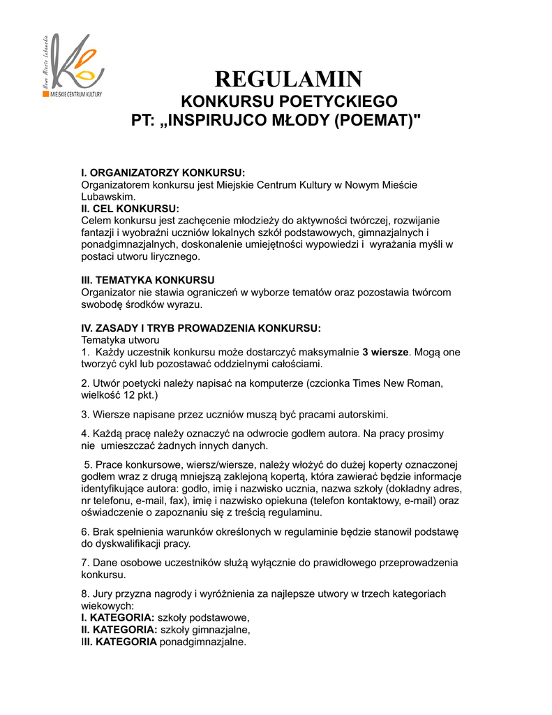 REGULAMIN KONKURSU POETYCKIEGO PT: „INSPIRUJCO MŁODY (POEMAT)" I. ORGANIZATORZY KONKURSU: Organizatorem konkursu jest Miejskie Centrum Kultury w Nowym Mieście Lubawskim. II. CEL KONKURSU: Celem konkursu jest zachęcenie młodzieży do aktywności twórczej, rozwijanie fantazji i wyobraźni uczniów lokalnych szkół podstawowych, gimnazjalnych i ponadgimnazjalnych, doskonalenie umiejętności wypowiedzi i wyrażania myśli w postaci utworu lirycznego. III. TEMATYKA KONKURSU Organizator nie stawia ograniczeń w wyborze tematów oraz pozostawia twórcom swobodę środków wyrazu. IV. ZASADY I TRYB PROWADZENIA KONKURSU: Tematyka utworu 1. Każdy uczestnik konkursu może dostarczyć maksymalnie 3 wiersze. Mogą one tworzyć cykl lub pozostawać oddzielnymi całościami. 2. Utwór poetycki należy napisać na komputerze (czcionka Times New Roman, wielkość 12 pkt.) 3. Wiersze napisane przez uczniów muszą być pracami autorskimi. 4. Każdą pracę należy oznaczyć na odwrocie godłem autora. Na pracy prosimy nie umieszczać żadnych innych danych. 5. Prace konkursowe, wiersz/wiersze, należy włożyć do dużej koperty oznaczonej godłem wraz z drugą mniejszą zaklejoną kopertą, która zawierać będzie informacje identyfikujące autora: godło, imię i nazwisko ucznia, nazwa szkoły (dokładny adres, nr telefonu, e-mail, fax), imię i nazwisko opiekuna (telefon kontaktowy, e-mail) oraz oświadczenie o zapoznaniu się z treścią regulaminu. 6. Brak spełnienia warunków określonych w regulaminie będzie stanowił podstawę do dyskwalifikacji pracy. 7. Dane osobowe uczestników służą wyłącznie do prawidłowego przeprowadzenia konkursu. 8. Jury przyzna nagrody i wyróżnienia za najlepsze utwory w trzech kategoriach wiekowych: I. KATEGORIA: szkoły podstawowe, II. KATEGORIA: szkoły gimnazjalne, III. KATEGORIA ponadgimnazjalne. 10. Prace konkursowe należy nadesłać lub dostarczyć / w ostatecznym terminie/ do 4 kwietnia 2014 roku na adres: MIEJSKIE CENTRUM KULTURY ul. 19 stycznia 17A, 13-300 NOWE MIASTO LUBAWSKIE 11. Szkoły nagrodzonych i wyróżnionych uczniów zostaną powiadomione telefonicznie lub drogą elektroniczną 8 kwietnia 2014 roku 12. Uroczyste wręczenie nagród nastąpi dnia 11 kwietnia 2014 roku w Miejskim Centrum Kultury podczas "Wieczoru z Poezją". Tego dnia laureaci konkursu będą mieli możliwość zaprezentować swoją twórczość szerszemu gronu odbiorców. 13. Nagrody nieodebrane przez laureatów w okresie 30 dni od uroczystego ogłoszenia wyników przechodzą do puli nagród przyznawanych w kolejnych konkursach i festiwalach organizowanych przez Miejskie Centrum Kultury w Nowym Mieście Lubawskim.