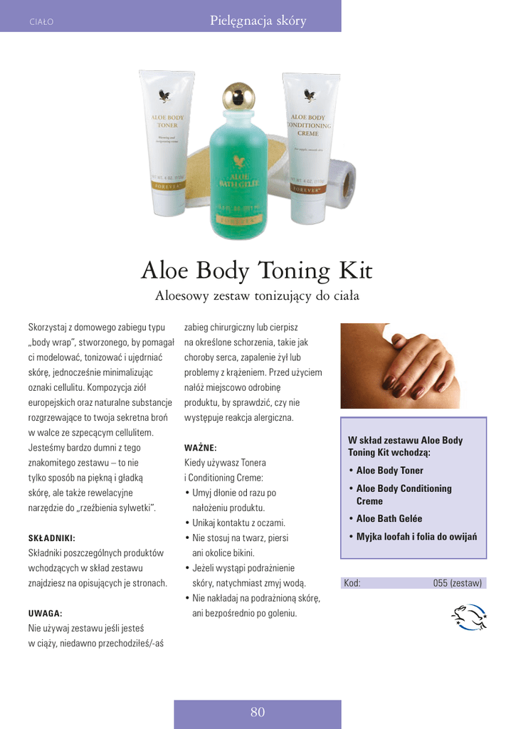 CIAŁO Piel´gnacja skóry Aloe Body Toning Kit Aloesowy zestaw tonizujàcy do cia∏a Skorzystaj z domowego zabiegu typu „body wrap”, stworzonego, by pomagał ci modelowaç, tonizowaç i uj´drniaç skór´, jednoczeÊnie minimalizujàc oznaki cellulitu. Kompozycja ziół europejskich oraz naturalne substancje rozgrzewajàce to twoja sekretna broƒ w walce ze szpecàcym cellulitem. JesteÊmy bardzo dumni z tego znakomitego zestawu – to nie tylko sposób na pi´knà i gładkà skór´, ale tak˝e rewelacyjne narz´dzie do „rzeêbienia sylwetki”. SKŁADNIKI: Składniki poszczególnych produktów wchodzàcych w skład zestawu znajdziesz na opisujàcych je stronach. UWAGA: zabieg chirurgiczny lub cierpisz na okreÊlone schorzenia, takie jak choroby serca, zapalenie ˝ył lub problemy z krà˝eniem. Przed u˝yciem nałó˝ miejscowo odrobin´ produktu, by sprawdziç, czy nie wyst´puje reakcja alergiczna. WA˚NE: Kiedy u˝ywasz Tonera i Conditioning Creme: • Umyj dłonie od razu po nało˝eniu produktu. • Unikaj kontaktu z oczami. • Nie stosuj na twarz, piersi ani okolice bikini. • Je˝eli wystàpi podra˝nienie skóry, natychmiast zmyj wodà. • Nie nakładaj na podra˝nionà skór´, ani bezpoÊrednio po goleniu. Nie u˝ywaj zestawu jeÊli jesteÊ w cià˝y, niedawno przechodziłeÊ/-aÊ 80 W skład zestawu Aloe Body Toning Kit wchodzà: • Aloe Body Toner • Aloe Body Conditioning Creme • Aloe Bath Gelée • Myjka loofah i folia do owijaƒ Kod: 055 (zestaw) Piel´gnacja skóry CIAŁO Korzystanie z Aloe Body Toning Kit ETAP 1 Oczyszczanie z ˝elem do kàpieli Aloe Bath Gelée i myjkà loofah Poznaj ekskluzywny ˝el do kàpieli Aloe Bath Gelee. U˝ywany z myjkà loofah myje, oczyszcza, rewitalizuje, pieÊci, masuje i relaksuje skór´. NanieÊ ˝el na myjk´ i łagodnie wmasowuj w skór´, a˝ do uzyskania obfitej piany; nast´pnie spłucz. Stosuj codziennie, by twoja skóra była mi´kka i gładka. ETAP 1 Zaznaczanie i mierzenie Je˝eli jesteÊ ciekawa, ile centymetrów stracisz, mo˝esz zmierzyç tonizowane cz´Êci ciała. Podczas mierzenia przed tonizacjà zaznacz niezmywalnym markerem skór´ przy górnej i dolnej kraw´dzi miarki. Dzi´ki temu zyskasz pewnoÊç, ˝e po zabiegu dokonasz pomiaru dokładnie w tym samym miejscu. ETAP 3 Nakładanie Aloe Body Toner Zanim zastosujesz Aloe Body Toner, nanieÊ jego odrobin´ miejscowo, aby sprawdziç, czy nie wyst´puje reakcja alergiczna. Je˝eli po upływie doby nie wystàpiło zaczerwienienie ani sw´dzenie, nałó˝ krem obficie na tonizowane cz´Êci ciała. Aloe Body Toner działa na skór´ rozgrzewajàco i stymulujàco. Ułó˝ si´ wygodnie i pozostaw foli´ na około jednà godzin´. Nie anga˝uj si´ w tym czasie w ˝adnà intensywnà aktywnoÊç fizycznà, ale te˝ nie zaÊnij. U˝ywajàc no˝yczek o zaokràglonych koƒcówkach, rozetnij i wyrzuç zu˝ytà foli´. Zmierz ponownie tonizowane cz´Êci ciała, przykładajàc miark´ mi´dzy znakami, jakie naniosłaÊ niezmywalnym markerem. Odejmij wynik od wartoÊci sprzed tonizacji, aby zobaczyç ile centymetrów ci ubyło. Ewentualne pozostałoÊci Aloe Body Toner wmasuj w skór´. Nakładaj krem bezpoÊrednio na skór´ na miejsca nie owini´te folià podczas zabiegu tonizacji, lub na całe ciało jako codzienny krem piel´gnacyjny, gdy nie stosujesz tonizacji. Aloe Body Conditioning Creme pomaga stymulowaç krà˝enie podskórne, wpływajàc na wierzchnià warstw´ tkanki tłuszczowej. Nie nakładaj kremu na podra˝nionà lub Êwie˝o ogolonà skór´ ani od razu po kàpieli. Nie stosuj na piersi, twarz, okolice bikini ani błony Êluzowe. Unikaj kontaktu z oczami. W przypadku podra˝nienia skóry, obficie zmyj ciepłà wodà. KONTYNUACJA Od razu po nało˝eniu kremu dokładnie umyj r´ce, starannie zamknij tubk´ z kremem i przechowuj poza zasi´giem dzieci. Aloe Body Conditioning Creme Mi´dzy sesjami z owijaniem, na całe ciało nakładaj obficie krem od˝ywczy Aloe Body Conditioning Creme, by twoja skóra była mi´kka i gładka. Aloe Body Conditioning Creme doskonale uzupełnia działanie Aloe Body Toner, sprawiajàc, ˝e skóra jest wygładzona i j´drna. Wszystkie elementy zestawu Aloe Body Toning Kit, połàczone z odpowiednià dietà i regularnà gimnastykà, mogà pomóc ci w walce z cellutitem. Uwagi ogólne: Zabiegi „body wrap” stosuje si´, by uj´drniç skór´ lub zeszczupleç. Efekty b´dà mniej widoczne w przypadku osób o długotrwale skumulowanej tkance tłuszczowej, poniewa˝ nagromadzony pod skórà tłuszcz z czasem twardnieje. Dla uzyskania trwałych efektów potrzebne b´dà regularna gimnastyka i odpowiednia dieta. U osób o wyrzeêbionej masie mi´Êniowej efekty te˝ b´dà mniej widocznej. Najbardziej widoczne efekty mogà uzyskaç osoby, które w krótkim czasie przybrały na wadze lub majà słabo napi´tà skór´. W pierwszym tygodniu mo˝na wykonaç dwie, trzy sesje z owijaniem, a w kolejnych tygodniach zmniejszyç ich cz´stotliwoÊç zgodnie ze swoimi potrzebami. ETAP 4 Nakładanie folii Owiƒ foli´ wokół tych cz´Êci ciała, na które naniesiono Toner. NIE ZAWIJAJ TWARZY, SZYI, KLATKI PIERSIOWEJ, BARKÓW, PRZEDRAMION, ŁYDEK ANI OKOLIC BIKINI. Dla twojego bezpieczeƒstwa, Aloe Body Toning Kit jest przeznaczony wyłàcznie do u˝ycia na ramiona, brzuch i uda. W razie potrzeby mo˝esz u˝yç podwójnej warstwy folii. Po zabiegu mo˝esz byç spragniona, co jest normalne, poniewa˝ nastàpiła utrata wody z organizmu. Zalecane jest picie wi´kszej iloÊci wody, co wspiera przemian´ materii i przyspiesza eliminacj´ wody i tłuszczu. 81