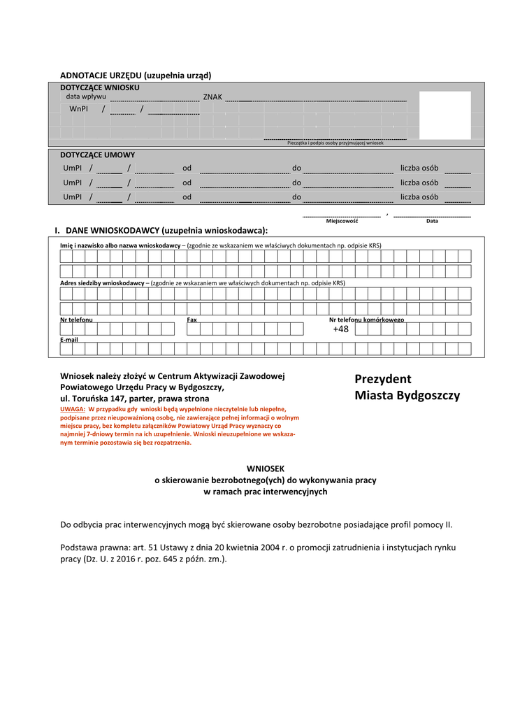 ADNOTACJE URZĘDU (uzupełnia urząd) DOTYCZĄCE WNIOSKU ZNAK data wpływu WnPI / / Pieczątka i podpis osoby przyjmującej wniosek DOTYCZĄCE UMOWY UmPI / / od do liczba osób UmPI / / od do liczba osób UmPI / / od do liczba osób , Miejscowość Data I. DANE WNIOSKODAWCY (uzupełnia wnioskodawca): Imię i nazwisko albo nazwa wnioskodawcy – (zgodnie ze wskazaniem we właściwych dokumentach np. odpisie KRS) Adres siedziby wnioskodawcy – (zgodnie ze wskazaniem we właściwych dokumentach np. odpisie KRS) Nr telefonu Fax Nr telefonu komórkowego +48 E-mail Wniosek należy złożyć w Centrum Aktywizacji Zawodowej Powiatowego Urzędu Pracy w Bydgoszczy, ul. Toruńska 147, parter, prawa strona Prezydent Miasta Bydgoszczy UWAGA: W przypadku gdy wnioski będą wypełnione nieczytelnie lub niepełne, podpisane przez nieupoważnioną osobę, nie zawierające pełnej informacji o wolnym miejscu pracy, bez kompletu załączników Powiatowy Urząd Pracy wyznaczy co najmniej 7-dniowy termin na ich uzupełnienie. Wnioski nieuzupełnione we wskazanym terminie pozostawia się bez rozpatrzenia. WNIOSEK o skierowanie bezrobotnego(ych) do wykonywania pracy w ramach prac interwencyjnych Do odbycia prac interwencyjnych mogą być skierowane osoby bezrobotne posiadające profil pomocy II. Podstawa prawna: art. 51 Ustawy z dnia 20 kwietnia 2004 r. o promocji zatrudnienia i instytucjach rynku pracy (Dz. U. z 2016 r. poz. 645 z późn. zm.). UWAGA: 1. W celu właściwego wypełnienia wniosku, prosimy o staranne jego przeczytanie, wypełnienie i dołożenie wszelkich starań, aby precyzyjnie odpowiedzieć na postawione pytania. Tylko wtedy będziemy mogli prawidłowo ocenić Państwa przedsięwzięcie i pomóc w jego realizacji. 2. Pracodawca składa wniosek o organizowanie prac interwencyjnych do Powiatowego Urzędu Pracy w Bydgoszczy lub w Filiach w Koronowie, w Solcu Kujawskim. 3. Złożony wniosek wraz z dokumentacją nie podlega zwrotowi. 4. Do wykonywania prac interwencyjnych mogą zostać skierowane osoby bezrobotne posiadające profil pomocy II. 5. Prezydent Miasta Bydgoszczy reprezentowany(-e) przez Dyrektora Powiatowego Urzędu Pracy w Bydgoszczy / Kierownictwo CAZ w terminie 30 dni od dnia złożenia wniosku wraz z załącznikami powiadamia pisemnie wnioskodawcę o jego rozpatrzeniu. 6. Prezydent Miasta Bydgoszczy zawiera z pracodawcą umowę, w której zobowiązuje się w szczególności do zrefundowania przez okres do 6 miesięcy kosztów wynagrodzeń i składek na ubezpieczenia społeczne zatrudnionego(ych) bezrobotnego(ych), a pracodawca zobowiązuje się zatrudnić w pełnym wymiarze czasu pracy na podstawie umowy o pracę na okres 6 miesięcy oraz utrzymania w zatrudnieniu przez okres 3 miesięcy po zakończeniu refundacji. 7. Pracodawca zobowiązany jest do zwrotu kwoty udzielonej refundacji wraz z odsetkami naliczonymi od całości kwoty udzielonej pomocy od dnia wypłaty pierwszej kwoty udostępnionych środków, w terminie 30 dni od dnia otrzymania wezwania Prezydenta Miasta Bydgoszczy w przypadku: 1) złożenia niezgodnych z prawdą oświadczeń dotyczących pomocy de minimis, o których mowa w § 5 ust. 5 rozporządzenia w sprawie organizowania prac interwencyjnych i robót publicznych, 2) niewywiązania się z warunku utrzymania w zatrudnieniu skierowanego bezrobotnego przez okres 3 miesięcy po zakończeniu refundacji wynagrodzeń i składek na ubezpieczenia społeczne lub 3) naruszenia innych warunków umowy. 8. W przypadku rozwiązania umowy o pracę przez skierowanego bezrobotnego, rozwiązania z nim umowy o pracę na podstawie art. 52 ustawy z dnia 26 czerwca 1974 r. - Kodeks pracy lub wygaśnięcia stosunku pracy skierowanego bezrobotnego w trakcie okresu objętego refundacją albo przed upływem okresu 3 miesięcy, o którym mowa w ust. 6, starosta kieruje na zwolnione stanowisko pracy innego bezrobotnego. 9. W przypadku odmowy przyjęcia skierowanego bezrobotnego na zwolnione stanowisko pracy, pracodawca zwraca uzyskaną pomoc w całości wraz z odsetkami ustawowymi naliczonymi od dnia otrzymania pierwszej refundacji, w terminie 30 dni od dnia doręczenia wezwania starosty. W przypadku braku możliwości skierowania bezrobotnego przez urząd pracy na zwolnione stanowisko pracy, pracodawca nie zwraca uzyskanej pomocy za okres, w którym uprzednio skierowany bezrobotny pozostawał w zatrudnieniu. 10. Udzielona pomoc stanowi pomoc de minimis spełniającą warunki określone w rozporządzeniu Komisji (UE) nr 1407/2013 z dnia 18 grudnia 2013 r. w sprawie stosowania art. 107 i 108 Traktatu o funkcjonowaniu Unii Europejskiej do pomocy de minimis (Dz. Urz. UE L 352 z 24.12.2013, str. 1), rozporządzeniu Komisji (UE) nr 1408/2013 z dnia 18 grudnia 2013 r. w sprawie stosowania art. 107 i 108 Traktatu o funkcjonowaniu Unii Europejskiej do pomocy de minimis w sektorze rolnym (Dz. Urz. UE L 352 z 24.12.2013, str. 9) lub we właściwych przepisach prawa Unii Europejskiej dotyczących pomocy de minimis w sektorze rybołówstwa i akwakultury. 11. Powiatowy Urząd Pracy uzna współpracę z pracodawcą za efektywną, jeżeli skierowana osoba bezrobotna przepracuje u pracodawcy co najmniej 30 dni od dnia zakończenia umowy z urzędem zgodnie z definicją Ministerstwa Rodziny, Pracy i Polityki Społecznej, o której mowa w wyjaśnieniach z dnia 30 kwietnia 2015r. w zakresie definicji wskaźnika efektywności zatrudnieniowej. 2 1. Miejsce prowadzenia działalności 2. Nazwisko, imię i stanowisko osoby, na którą ma być sporządzona umowa na zatrudnienie w ramach prac interwencyjnych Imię i nazwisko (zgodnie ze wskazaniem we właściwych dokumentach, np. odpisie KRS). Stanowisko 3. Dane identyfikacyjne NIP REGON - - - PKD Data rozpoczęcia działalności dd mm rrrr 4. Forma prawna prowadzonej działalności 5. Rodzaj działalności 6. Krótki opis prowadzonej działalności 7. Nazwa Banku 8. Numer rachunku bankowego - - - - - - (Prosimy o zwrócenie szczególnej uwagi przy wskazaniu numeru 