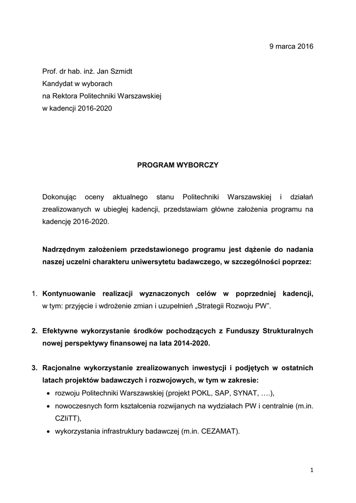 9 marca 2016 Prof. dr hab. inż. Jan Szmidt Kandydat w wyborach na Rektora Politechniki Warszawskiej w kadencji 2016-2020 PROGRAM WYBORCZY Dokonując oceny aktualnego stanu Politechniki Warszawskiej i działań zrealizowanych w ubiegłej kadencji, przedstawiam główne założenia programu na kadencję 2016-2020. Nadrzędnym założeniem przedstawionego programu jest dążenie do nadania naszej uczelni charakteru uniwersytetu badawczego, w szczególności poprzez: 1. Kontynuowanie realizacji wyznaczonych celów w poprzedniej kadencji, w tym: przyjęcie i wdrożenie zmian i uzupełnień „Strategii Rozwoju PW”. 2. Efektywne wykorzystanie środków pochodzących z Funduszy Strukturalnych nowej perspektywy finansowej na lata 2014-2020. 3. Racjonalne wykorzystanie zrealizowanych inwestycji i podjętych w ostatnich latach projektów badawczych i rozwojowych, w tym w zakresie: rozwoju Politechniki Warszawskiej (projekt POKL, SAP, SYNAT, ….), nowoczesnych form kształcenia rozwijanych na wydziałach PW i centralnie (m.in. CZIiTT), wykorzystania infrastruktury badawczej (m.in. CEZAMAT). 1 4. Skuteczne wykorzystanie potencjału kadrowego i infrastrukturalnego Uczelni w procesie badawczym i pracach rozwojowych, m.in. poprzez konstruowanie i opracowywanie wieloletnich, programów interdyscyplinarnych badawczych, łączących zespoły naukowe wielu wydziałów PW, również w powiązaniu z partnerami biznesowymi, zarówno krajowymi jaki i zagranicznymi. 5. Zdecydowanie ściślejsze powiązanie procesu dydaktycznego (zwłaszcza II i III stopnia) z badaniami naukowymi i pracami rozwojowymi. 6. Tworzenie warunków do szybszego rozwoju najzdolniejszych i najbardziej aktywnych studentów, doktorantów i młodej kadry naukowej i naukowodydaktycznej, między innymi poprzez udział w projektach badawczych, bliższą współpracę z najlepszymi uczelniami krajowymi i zagranicznymi oraz system staży i stypendiów celowych, itp. Istotną rolę mają do odegrania w tym zakresie: Centrum Studiów Zaawansowanych (CSZ), Centrum Laboratoryjne Kół Naukowych, Interdyscyplinarne Projekty dla Kół Naukowych, Fundacja PW, Fundacja Młodej Nauk. 7. Dokonanie zmian w strukturze funkcjonowania Uczelni oraz uruchamianie nowych inicjatyw wspomagających współpracę z otoczeniem społeczno- gospodarczym (m.in. efektywniejsze wykorzystanie Konwentu PW): Szkół (patrz Statut PW), Centrów badawczo-dydaktycznych i badawczych, Platform współdziałania, Zespołów interdyscyplinarnych. 8. Podjęcie realizacji Wieloletniego Programu Inwestycyjnego PW przy wykorzystaniu partnerstwa prywatno-publicznego. 2 9. Wdrażanie systemów i narzędzi informatycznych i teleinformatycznych racjonalizujących organizację procesów badawczych, dydaktycznych i zarządczych na każdym etapie ich realizacji. 10. Promowanie wszystkich aspektów działalności PW, w szczególności osiągnięć badawczych i edukacyjnych, a także zaangażowania na rzecz szeroko pojętego rozwoju społecznego i kulturalnego Polski. Warunkiem skutecznej realizacji wymienionych zadań jest przekonanie nas wszystkich o ich niezbędności dla pomyślnego rozwoju naszej uczelni. Politechnika Warszawska - niech to zawsze brzmi dumnie. 3
