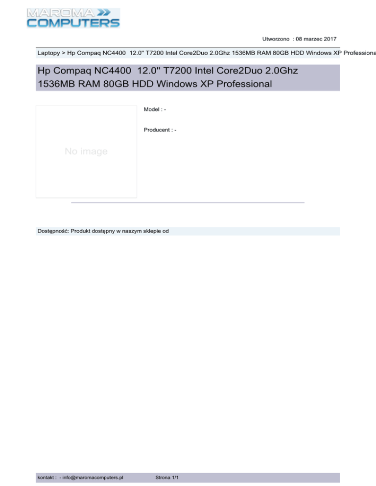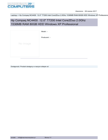Utworzono : 08 marzec 2017 Laptopy > Hp Compaq NC4400 12.0'' T7200 Intel Core2Duo 2.0Ghz 1536MB RAM 80GB HDD Windows XP Professiona Hp Compaq NC4400 12.0'' T7200 Intel Core2Duo 2.0Ghz 1536MB RAM 80GB HDD Windows XP Professional Model : - s r te Producent : - No image C a Dostępność: Produkt dostępny w naszym sklepie od m ro a M kontakt : - [email protected] Strona 1/1 m o u p