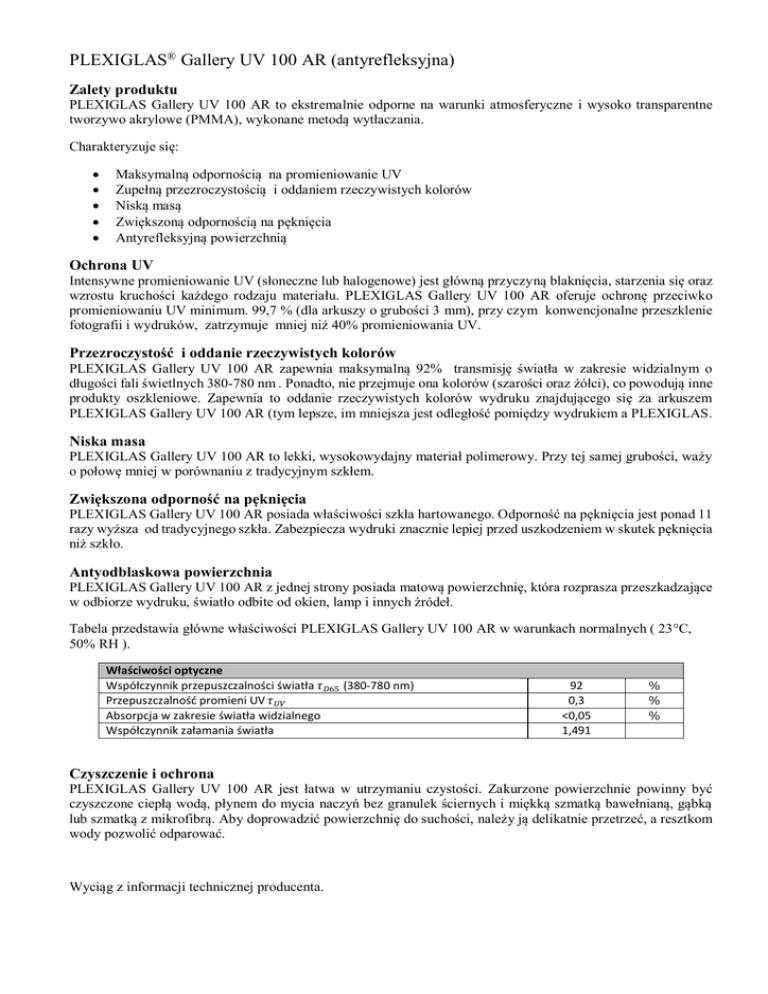 PLEXIGLAS® Gallery UV 100 AR (antyrefleksyjna) Zalety produktu PLEXIGLAS Gallery UV 100 AR to ekstremalnie odporne na warunki atmosferyczne i wysoko transparentne tworzywo akrylowe (PMMA), wykonane metodą wytłaczania. Charakteryzuje się: Maksymalną odpornością na promieniowanie UV Zupełną przezroczystością i oddaniem rzeczywistych kolorów Niską masą Zwiększoną odpornością na pęknięcia Antyrefleksyjną powierzchnią Ochrona UV Intensywne promieniowanie UV (słoneczne lub halogenowe) jest główną przyczyną blaknięcia, starzenia się oraz wzrostu kruchości każdego rodzaju materiału. PLEXIGLAS Gallery UV 100 AR oferuje ochronę przeciwko promieniowaniu UV minimum. 99,7 % (dla arkuszy o grubości 3 mm), przy czym konwencjonalne przeszklenie fotografii i wydruków, zatrzymuje mniej niż 40% promieniowania UV. Przezroczystość i oddanie rzeczywistych kolorów PLEXIGLAS Gallery UV 100 AR zapewnia maksymalną 92% transmisję światła w zakresie widzialnym o długości fali świetlnych 380-780 nm . Ponadto, nie przejmuje ona kolorów (szarości oraz żółci), co powodują inne produkty oszkleniowe. Zapewnia to oddanie rzeczywistych kolorów wydruku znajdującego się za arkuszem PLEXIGLAS Gallery UV 100 AR (tym lepsze, im mniejsza jest odległość pomiędzy wydrukiem a PLEXIGLAS. Niska masa PLEXIGLAS Gallery UV 100 AR to lekki, wysokowydajny materiał polimerowy. Przy tej samej grubości, waży o połowę mniej w porównaniu z tradycyjnym szkłem. Zwiększona odporność na pęknięcia PLEXIGLAS Gallery UV 100 AR posiada właściwości szkła hartowanego. Odporność na pęknięcia jest ponad 11 razy wyższa od tradycyjnego szkła. Zabezpiecza wydruki znacznie lepiej przed uszkodzeniem w skutek pęknięcia niż szkło. Antyodblaskowa powierzchnia PLEXIGLAS Gallery UV 100 AR z jednej strony posiada matową powierzchnię, która rozprasza przeszkadzające w odbiorze wydruku, światło odbite od okien, lamp i innych źródeł. Tabela przedstawia główne właściwości PLEXIGLAS Gallery UV 100 AR w warunkach normalnych ( 23°C, 50% RH ). Właściwości optyczne Współczynnik przepuszczalności światła 𝜏𝐷65 (380-780 nm) Przepuszczalność promieni UV 𝜏𝑈𝑉 Absorpcja w zakresie światła widzialnego Współczynnik załamania światła 92 0,3 <0,05 1,491 % % % Czyszczenie i ochrona PLEXIGLAS Gallery UV 100 AR jest łatwa w utrzymaniu czystości. Zakurzone powierzchnie powinny być czyszczone ciepłą wodą, płynem do mycia naczyń bez granulek ściernych i miękką szmatką bawełnianą, gąbką lub szmatką z mikrofibrą. Aby doprowadzić powierzchnię do suchości, należy ją delikatnie przetrzeć, a resztkom wody pozwolić odparować. Wyciąg z informacji technicznej producenta.