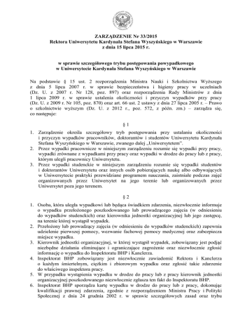 ZARZĄDZENIE Nr 33/2015 Rektora Uniwersytetu Kardynała Stefana Wyszyńskiego w Warszawie z dnia 15 lipca 2015 r. w sprawie szczegółowego trybu postępowania powypadkowego w Uniwersytecie Kardynała Stefana Wyszyńskiego w Warszawie Na podstawie § 15 ust. 2 rozporządzenia Ministra Nauki i Szkolnictwa Wyższego z dnia 5 lipca 2007 r. w sprawie bezpieczeństwa i higieny pracy w uczelniach (Dz. U. z 2007 r. Nr 128, poz. 897) oraz rozporządzenia Rady Ministrów z dnia 1 lipca 2009 r. w sprawie ustalenia okoliczności i przyczyn wypadków przy pracy (Dz. U. z 2009 r. Nr 105, poz. 870) oraz art. 66 ust. 2 ustawy z dnia 27 lipca 2005 r. – Prawo o szkolnictwie wyższym (Dz. U. z 2012 r., poz. 572, z późn. zm.) – zarządza się, co następuje: §1 1. Zarządzenie określa szczegółowy tryb postępowania przy ustalaniu okoliczności i przyczyn wypadków pracowników, doktorantów i studentów Uniwersytetu Kardynała Stefana Wyszyńskiego w Warszawie, zwanego dalej „Uniwersytetem”. 2. Przez wypadki pracownicze w niniejszym zarządzeniu rozumie się wypadki przy pracy, wypadki zrównane z wypadkami przy pracy oraz wypadki w drodze do pracy lub z pracy, którym ulegli pracownicy Uniwersytetu. 3. Przez wypadki studenckie w niniejszym zarządzeniu rozumie się wypadki studentów i doktorantów Uniwersytetu oraz innych osób pobierających naukę albo odbywających w Uniwersytecie praktyki przewidziane programem nauczania, zaistniałe podczas zajęć organizowanych przez Uniwersytet na jego terenie lub organizowanych przez Uniwersytet poza jego terenem. §2 1. Osoba, która uległa wypadkowi lub będąca świadkiem zdarzenia, niezwłocznie informuje o wypadku przełożonego poszkodowanego lub prowadzącego zajęcia (w odniesieniu do wypadków studenckich) oraz kierownika jednostki organizacyjnej lub jego zastępcę, na terenie której wystąpił wypadek. 2. Przełożony lub prowadzący zajęcia (w odniesieniu do wypadków studenckich) zapewnia udzielenie pierwszej pomocy, wezwanie fachowej pomocy medycznej oraz zabezpiecza miejsce wypadku. 3. Kierownik jednostki organizacyjnej, w której wystąpił wypadek, zobowiązany jest podjąć niezbędne działania eliminujące i ograniczające zagrożenie oraz niezwłocznie zgłosić informację o wypadku do Inspektoratu BHP i Kanclerza. 4. Inspektorat BHP zobowiązany jest niezwłocznie zawiadomić Rektora i Kanclerza o każdym śmiertelnym, ciężkim i zbiorowym wypadku oraz zgłosić takie zdarzenie do właściwego inspektora pracy. 5. W przypadku wystąpienia wypadku w drodze do pracy lub z pracy kierownik jednostki organizacyjnej poszkodowanego niezwłocznie zgłasza ten fakt do Inspektoratu BHP. 6. Inspektorat BHP sporządza kartę wypadku w drodze do pracy lub z pracy, dokonując kwalifikacji prawnej zdarzenia, zgodnie z rozporządzeniem Ministra Pracy i Polityki Społecznej z dnia 24 grudnia 2002 r. w sprawie szczegółowych zasad oraz trybu uznawania zdarzenia za wypadek w drodze do pracy lub z pracy, sposobu jego dokumentowania, wzoru karty wypadku w drodze do pracy lub z pracy oraz terminu jej sporządzania (Dz. U. z 2013 r., poz. 924). 7. Kartę wypadku w drodze do pracy lub z pracy zatwierdza: 1) Prorektor właściwy ds. nauki, w przypadku wypadku nauczyciela akademickiego; 2) Kanclerz, w przypadku wypadku pracownika administracyjnego. §3 1. Okoliczności wypadków przy pracy, wypadków zrównanych z wypadkami przy pracy oraz wypadków studenckich ustala zespół powypadkowy w skład, którego wchodzi pracownik Inspektoratu BHP oraz Społeczny Inspektor Pracy. 2. Niezwłocznie po otrzymaniu wiadomości o wypadku przy pracy lub wypadku zrównanym z wypadkiem przy pracy zespół powypadkowy jest obowiązany przystąpić do ustalenia przyczyn i okoliczności wypadku oraz sporządzenia protokołu według wzoru określonego w rozporządzeniu Ministra Gospodarki i Pracy z dnia 16 września 2004 r. w sprawie wzoru protokołu ustalenia okoliczności i przyczyn wypadku przy pracy (Dz. U. z 2004 r. Nr 227, poz. 2298). 3. W przypadku wypadków studenckich zespół powypadkowy jest obowiązany do ustalenia okoliczności i przyczyn wypadków oraz sporządzenia protokołu zgodnie z Załącznikiem do niniejszego Zarządzenia. 4. W protokole zespół powypadkowy dokonuje kwalifikacji prawnej wypadku kierując się zasadami określonymi w art. 3 ust. 1 i 2 ustawy z dnia 30 października 2002 r. o ubezpieczeniu społecznym z tytułu wypadków przy pracy i chorób zawodowych (Dz. U. z 2009 r. Nr 167, poz. 1322, z późn. zm.) oraz określa środki profilaktyczne i wnioski w szczególności wynikające z oceny ryzyka zawodowego na stanowisku pracy, na którym nastąpił wypadek. 5. Zespół powypadkowy obowiązany jest zapoznać poszkodowanego lub członków rodziny zmarłego wskutek wypadku z treścią protokołu powypadkowego przed jego zatwierdzeniem. 6. Protokół powypadkowy zatwierdza nie później niż w ciągu 5 dni od daty sporządzenia protokołu: 1) Prorektor właściwy ds. nauki, w przypadku wypadku nauczyciela akademickiego; 2) Prorektor właściwy ds. studenckich, w przypadku wypadków studentów i doktorantów; 3) Kanclerz, w przypadku wypadku pracownika administracyjnego. 7. Protokół powypadkowy dotyczący wypadków śmiertelnych, ciężkich i zbiorowych zatwierdza Rektor, nie później niż w ciągu 5 dni od daty sporządzenia protokołu. 8. Protokół powypadkowy, o którym mowa w ust. 7, jest niezwłocznie dostarczany przez Inspektorat BHP do właściwego inspektora pracy. 9. Ustalenie okoliczności i przyczyn wypadku, który miał miejsce na terenie innego zakładu pracy, dokonuje zespół powypadkowy powołany przez pracodawcę poszkodowanego, w obecności przedstawiciela pracodawcy, na terenie którego miał miejsce wypadek. §4 1. Inspektorat BHP prowadzi rejestr wypadków na podstawie protokołów powypadkowych zgodnie z § 16 rozporządzenia Rady Ministrów z dnia 1 lipca 2009 r. w sprawie ustalenia okoliczności i przyczyn w