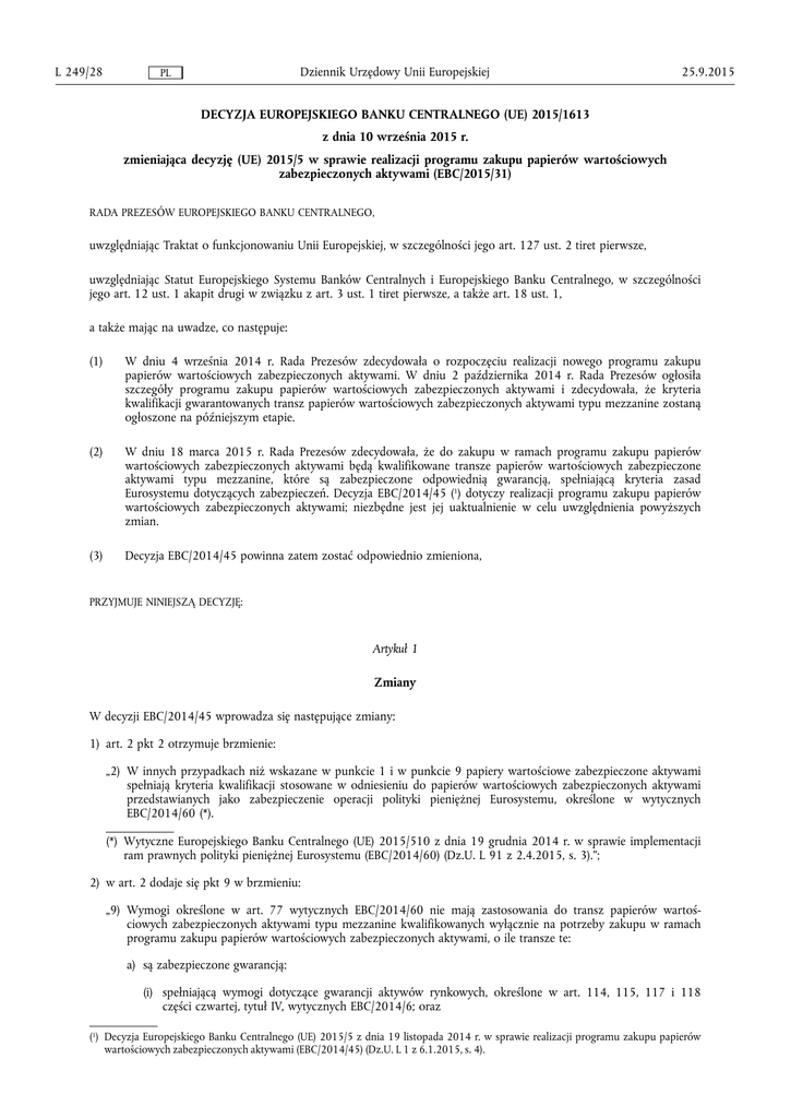 L 249/28 Dziennik Urzędowy Unii Europejskiej PL 25.9.2015 DECYZJA EUROPEJSKIEGO BANKU CENTRALNEGO (UE) 2015/1613 z dnia 10 września 2015 r. zmieniająca decyzję (UE) 2015/5 w sprawie realizacji programu zakupu papierów wartościowych zabezpieczonych aktywami (EBC/2015/31) RADA PREZESÓW EUROPEJSKIEGO BANKU CENTRALNEGO, uwzględniając Traktat o funkcjonowaniu Unii Europejskiej, w szczególności jego art. 127 ust. 2 tiret pierwsze, uwzględniając Statut Europejskiego Systemu Banków Centralnych i Europejskiego Banku Centralnego, w szczególności jego art. 12 ust. 1 akapit drugi w związku z art. 3 ust. 1 tiret pierwsze, a także art. 18 ust. 1, a także mając na uwadze, co następuje: (1) W dniu 4 września 2014 r. Rada Prezesów zdecydowała o rozpoczęciu realizacji nowego programu zakupu papierów wartościowych zabezpieczonych aktywami. W dniu 2 października 2014 r. Rada Prezesów ogłosiła szczegóły programu zakupu papierów wartościowych zabezpieczonych aktywami i zdecydowała, że kryteria kwalifikacji gwarantowanych transz papierów wartościowych zabezpieczonych aktywami typu mezzanine zostaną ogłoszone na późniejszym etapie. (2) W dniu 18 marca 2015 r. Rada Prezesów zdecydowała, że do zakupu w ramach programu zakupu papierów wartościowych zabezpieczonych aktywami będą kwalifikowane transze papierów wartościowych zabezpieczone aktywami typu mezzanine, które są zabezpieczone odpowiednią gwarancją, spełniającą kryteria zasad Eurosystemu dotyczących zabezpieczeń. Decyzja EBC/2014/45 (1) dotyczy realizacji programu zakupu papierów wartościowych zabezpieczonych aktywami; niezbędne jest jej uaktualnienie w celu uwzględnienia powyższych zmian. (3) Decyzja EBC/2014/45 powinna zatem zostać odpowiednio zmieniona, PRZYJMUJE NINIEJSZĄ DECYZJĘ: Artykuł 1 Zmiany W decyzji EBC/2014/45 wprowadza się następujące zmiany: 1) art. 2 pkt 2 otrzymuje brzmienie: „2) W innych przypadkach niż wskazane w punkcie 1 i w punkcie 9 papiery wartościowe zabezpieczone aktywami spełniają kryteria kwalifikacji stosowane w odniesieniu do papierów wartościowych zabezpieczonych aktywami przedstawianych jako zabezpieczenie operacji polityki pieniężnej Eurosystemu, określone w wytycznych EBC/2014/60 (*). (*) Wytyczne Europejskiego Banku Centralnego (UE) 2015/510 z dnia 19 grudnia 2014 r. w sprawie implementacji ram prawnych polityki pieniężnej Eurosystemu (EBC/2014/60) (Dz.U. L 91 z 2.4.2015, s. 3).”; 2) w art. 2 dodaje się pkt 9 w brzmieniu: „9) Wymogi określone w art. 77 wytycznych EBC/2014/60 nie mają zastosowania do transz papierów wartoś ciowych zabezpieczonych aktywami typu mezzanine kwalifikowanych wyłącznie na potrzeby zakupu w ramach programu zakupu papierów wartościowych zabezpieczonych aktywami, o ile transze te: a) są zabezpieczone gwarancją: (i) spełniającą wymogi dotyczące gwarancji aktywów rynkowych, określone w art. 114, 115, 117 i 118 części czwartej, tytuł IV, wytycznych EBC/2014/6; oraz (1) Decyzja Europejskiego Banku Centralnego (UE) 2015/5 z dnia 19 listopada 2014 r. w sprawie realizacji programu zakupu papierów wartościowych zabezpieczonych aktywami (EBC/2014/45) (Dz.U. L 1 z 6.1.2015, s. 4). 25.9.2015 PL Dziennik Urzędowy Unii Europejskiej L 249/29 (ii) udzieloną przez gwaranta posiadającego ocenę kredytową określoną w art. 83 lit. c) wytycznych EBC/2014/60, przyznaną przez co najmniej jeden zaakceptowany system ECAI, wyrażoną w formie publicznego ratingu kredytowego na poziomie co najmniej stopnia 3 w zharmonizowanej skali ratingowej Eurosystemu; oraz b) spełniają wszystkie pozostałe kryteria kwalifikacji do zakupów w ramach programu zakupu papierów wartoś ciowych zabezpieczonych aktywami. Na potrzeby niniejszej decyzji »transza typu mezzanine« oznacza transzę papierów wartościowych zabezpie czonych aktywami, która, zgodnie z zawartą w prospekcie kolejnością wypłat określoną po egzekucji spłaty (post-enforcement) lub przyspieszeniu spłaty (post-acceleration): a) jest klasyfikowana niżej niż niepodporządkowana transza lub subtransze tej samej emisji papierów wartoś ciowych zabezpieczonych aktywami, zgodnie z art. 77 wytycznych EBC/2014/60; oraz b) jest klasyfikowana wyżej niż najbardziej podporządkowana transza lub subtransze, które są pierwsze w kolejności ponoszenia strat z tytułu sekurytyzowanych ekspozycji i tym samym zapewniają ochronę transzy drugiej straty oraz, w stosownych przypadkach, ochronę transz lub subtransz mających wyższy stopień uprzywilejowania.”. Artykuł 2 Wejście w życie Niniejsza decyzja wchodzi w życie dwudziestego dnia po jej opublikowaniu w Dzienniku Urzędowym Unii Europejskiej. Sporządzono we Frankfurcie nad Menem dnia 10 września 2015 r. Mario DRAGHI Prezes EBC