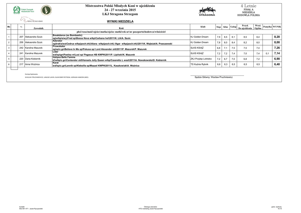 4 Letnie Mistrzostwa Polski Młodych Koni w ujeżdżeniu 24 - 27 września 2015 LKJ Stragona Strzegom FINAŁ A NIEDZIELA HODOWLA POLSKA WYNIKI NIEDZIELA Mc No. Zawodnik 1 207 Alekasndra Szulc 2 206 Alekasndra Szulc 3 242 Karolina Mazurek 4 241 Karolina Mazurek 5 220 Daria Kobiernik 6 217 Anna Woźnica Koń płeć/rasa/maść\ojciec\matka/ojciec matki\rok ur\nr paszportu\hodowca\właściciel Breakdance (ex Bombastic) og\wlkp\siwy\Fred sp\Bossa Nova wlkp\Carbano hol\2011\K. Lik\A. Szulc Adorator og\trak\siwa\Cedrus wlkp(poch.trk)\Alana wlkp(poch.trk) /Agar wlkp(poch.trk)\2011\K. Wojtsiat\A. Przeczewski Prowokator og\sp\c.gn\Believe In Me sp\Pokusa sp/ Lord Alexander old\2011\P. Mazurek\P. Mazurek Lider wal\sp\gn\Pastisz m\Lusi sp/ Pegasus HB KWPN\2011\P. Lipiński\K. Mazurek Halipsa Belle Famme kl\wlkp\c.gn\Contendor old\Hansela Jolly Queen wlkp/Casaretto L west\2011\A. Nowakowska\D. Kobiernik Karat wal\sp\c.gn\Lennik sp\Klebsilla sp/Mazzel KWPN\2011\L. Kaszkowiak\A. Woźnica Kłus Galop Przyd. Do ujeżdżenia Wraż. Pomyłka WYNIK Ogólne KJ Golden Dream 7,9 8,5 8,1 8,5 8,4 8,28 KJ Golden Dream 7,8 8,0 8,4 8,2 8,0 8,08 SLKS KSIĄŻ 6,8 7,1 7,5 7,5 7,4 SLKS KSIĄŻ 7,2 7,2 7,4 7,0 7,4 ZKJ Przylep Lotnisko 7,2 6,7 7,0 6,8 7,2 6,98 TS Kuźnia Rybnik 6,6 6,3 6,5 6,5 6,5 6,48 7,26 0,1 7,14 ___________________________________________ Sędzia Główny: Wacław Pruchniewicz Komisja Sędziowska WACŁAW PRUCHNIEWICZ, JANUSZ LAWIN, SŁAWOMIR PIETRZAK, ADRIAAN HAMOEN (NED) kontakt 692 991 471 - Jacek Ryczywolski Stęp Klub Obsługa zawodów HTE marketing Jacek Ryczywolski godz. wydruku 16:19 4 Letnie Mistrzostwa Polski Młodych Koni w ujeżdżeniu 24 - 27 września 2015 LKJ Stragona Strzegom FINAŁ A NIEDZIELA HODOWLA ZAGRANICZNA WYNIKI NIEDZIELA Mc No. Zawodnik 1 240 Mateusz Kiempa 2 239 Mateusz Kiempa 3 238 Kamil Puliński 4 205 Agata Lenartowicz 5 209 Aleksandra Matkiewicz 6 204 Agata Lenartowicz 7 268 Sylwia Heinrich 8 221 Dominika Bień 9 225 Ewa Leibfarth Salvatore Ferragamo og\han\kaszt\Soliman de Hus han\ Rieke han /Rotspon han.\2011\GER\P. Mańczak Quantum of Solace og\hol\kaszt\Quaterback BRB\Sunshine XVI hol/Aljano hol\2011\GER\P. Mańczak Fürst Oscar G og\han\c.gn\Furstenball old\Wey han/ Weltregent H han\2011\GER\P. Gąsiński San Secret kl\han\c.gn\San Amour old\Bella Donna han/ Brentano II han\2011\GER\A. Lenartowicz Cristabell kl\westf\gn\Caratello B hol\Cailustas west/Castillo hol\2011\Montis.Sp.z.o.o.\M. Michalski Fürst Alexander og\westf\c.gn\Furst Frederik old\Ombrina old/ Rubinstein I westf\2011\R. Vorwerk\A. Lenartowicz Goedhart og\KWPN\gn\Applaus KWPN\Vodieza KWPN/Nassau KWPN\2011\NED\T. Heinrich Sandro Rubin og\mekl\gn\Reiter - Traum old\Sorentina old/ Sorento old\2011\D. Nicodem\P. Markiewicz Red Sunrise 2 kl\baw\gn\Sir Donnerhall old\Ronja baw / Ritual han\2011\L. Gillmaier\L. Gillmaier Kłus Galop Przyd. Do ujeżdżenia Wraż. Pomyłka WYNIK Ogólne CSJ Coval Biały Bór 7,9 8,4 8,8 8,7 8,8 CSJ Coval Biały Bór 7,3 8,7 8,6 8,6 8,7 8,38 Lubelski Klub Jeździecki 7,5 7,2 7,4 7,5 7,2 7,36 Pomorska Liga Jeździecka7,4 7,0 7,0 6,8 7,2 7,08 OSK Michalscy Trzebnica 6,8 7,1 7,2 7,5 6,5 7,02 Pomorska Liga Jeździecka7,4 6,6 7,0 6,7 6,8 6,90 LKJ Lewada 6,9 6,7 6,4 6,5 6,5 6,60 bpk MAZ 6,5 6,7 6,8 6,6 6,8 Hippologia Strzegom 6,3 6,4 6,8 6,8 6,4 0,1 0,1 8,42 6,58 6,54 ___________________________________________ Sędzia Główny: Wacław Pruchniewicz Komisja Sędziowska WACŁAW PRUCHNIEWICZ, JANUSZ LAWIN, SŁAWOMIR PIETRZAK, ADRIAAN HAMOEN (NED) kontakt 692 991 471 - Jacek Ryczywolski Stęp Klub Koń płeć/rasa/maść\ojciec\matka/ojciec matki\rok ur\nr paszportu\hodowca\właściciel Obsługa zawodów HTE marketing Jacek Ryczywolski godz. wydruku 16:19 Mistrzostwa Polski Młodych Koni w ujeżdżeniu 24 - 27 września 2015 LKJ Stragona Strzegom 5 Letnie FINAŁ NIEDZIALE HODOWLA POLSKA WYNIKI NIEDZIELA Mc 1 2 No. 249 250 Zawodnik Luiza Rutkowska Luiza Rutkowska Markiz wal\sp\sk.gn\Love Affair han\Mejsi V sp / Welt Gang han\2010\M. Adamuszewski\M. Adamuszewski Prince Girl kl\sp\sk.gn\Turbud Alino hol\Princess Lady han/ Prince Thatch xx\2010\R. Borensztadt\M. Adamuszewski KJ Aromer KJ Aromer Stęp Kłus Galop Przyd. Do ujeżdżenia Wraż. Pomyłka WYNIK Ogólne 6,5 7,6 7,2 7,5 7,0 7,16 5,8 6,4 6,6 6,5 6,6 6,38 ___________________________________________ Sędzia Główny: Wacław Pruchniewicz Komisja Sędziowska WACŁAW PRUCHNIEWICZ, JANUSZ LAWIN, SŁAWOMIR PIETRZAK, ADRIAAN HAMOEN (NED) kontakt 692 991 471 - Jacek Ryczywolski Klub Koń płeć/rasa/maść\ojciec\matka/ojciec matki\rok ur\nr paszportu\hodowca\właściciel Obsługa zawodów HTE marketing Jacek Ryczywolski godz. wydruku 16:19 Mistrzostwa Polski Młodych Koni w ujeżdżeniu 24 - 27 września 2015 LKJ Stragona Strzegom 5 Letnie FINAŁ NIEDZIALE HODOWLA POLSKA WYNIKI NIEDZIELA Mc 1 2 3 No. 229 264 246 Zawodnik Ilona Janas Paula Mańczak Katarzyna Popiołek Koń płeć/rasa/maść\ojciec\matka/ojciec matki\rok ur\nr paszportu\hodowca\właściciel Lord Django og\han\gn\Stalypso han\Lona han/ Londonderry han\2010\H. Heeren\I. Janas Fazz-Tetti og\KWPN\kara\Jazz KWPN\Verrno-Tetti KWPN/Ferro KWPN\2010\NED\P. Mańczak\ Butterfly kl\DSP\gn\Bellissimo Mreń\Rainbow han/Romancero H han\2010\Z. Szumlakowski\A. Sałacki SSKJ Bobrowy Staw CSJ Coval Biały Bór LKJ Lewada Stęp Kłus Galop Przyd. Do ujeżdżenia Wraż. Pomyłka WYNIK Ogólne 0,1 7,72 7,4 7,8 8,1 8,0 7,8 7,0 7,3 7,1 7,3 6,8 7,10 7,2 6,8 6,7 6,6 6,5 6,76 ___________________________________________ Sędzia Główny: Wacław Pruchniewicz Komisja Sędziowska WACŁAW PRUCHNIEWICZ, JANUSZ LAWIN, SŁAWOMIR PIETRZAK, ADRIAAN HAMOEN (NED) kontakt 692 991 471 - Jacek Ryczywolski Klub Obsługa zawodów HTE marketing Jacek Ryczywolski godz. wydruku 16:19 Mistrzostwa Polski Młodych Koni w ujeżdżeniu 24 - 27 września 2015 LKJ Stragona Strzegom 6 Letnie FINAŁ NIEDZIELA HODOWLA POLSKA WYNIKI NIEDZIELA Mc. No. Zawodnik 1 219 Daria Kobiernik 2 228 Hanna Suchan 3 216 Anna Maria Gawłowska