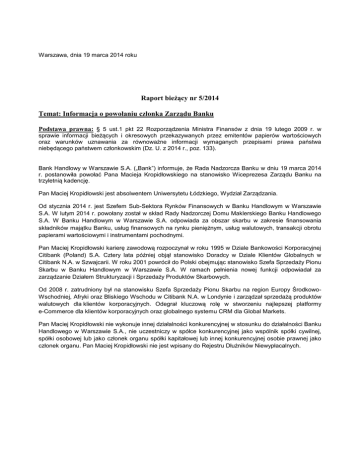 Warszawa, dnia 19 marca 2014 roku Raport bieżący nr 5/2014 Temat: Informacja o powołaniu członka Zarządu Banku Podstawa prawna: § 5 ust.1 pkt 22 Rozporządzenia Ministra Finansów z dnia 19 lutego 2009 r. w sprawie informacji bieżących i okresowych przekazywanych przez emitentów papierów wartościowych oraz warunków uznawania za równoważne informacji wymaganych przepisami prawa państwa niebędącego państwem członkowskim (Dz. U. z 2014 r., poz. 133). Bank Handlowy w Warszawie S.A. („Bank”) informuje, że Rada Nadzorcza Banku w dniu 19 marca 2014 r. postanowiła powołać Pana Macieja Kropidłowskiego na stanowisko Wiceprezesa Zarządu Banku na trzyletnią kadencję. Pan Maciej Kropidłowski jest absolwentem Uniwersytetu Łódzkiego, Wydział Zarządzania. Od stycznia 2014 r. jest Szefem Sub-Sektora Rynków Finansowych w Banku Handlowym w Warszawie S.A. W lutym 2014 r. powołany został w skład Rady Nadzorczej Domu Maklerskiego Banku Handlowego S.A. W Banku Handlowym w Warszawie S.A. odpowiada za obszar skarbu w zakresie finansowania składników majątku Banku, usług finansowych na rynku pieniężnym, usług walutowych, transakcji obrotu papierami wartościowymi i instrumentami pochodnymi. Pan Maciej Kropidłowski karierę zawodową rozpoczynał w roku 1995 w Dziale Bankowości Korporacyjnej Citibank (Poland) S.A. Cztery lata później objął stanowisko Doradcy w Dziale Klientów Globalnych w Citibank N.A. w Szwajcarii. W roku 2001 powrócił do Polski obejmując stanowisko Szefa Sprzedaży Pionu Skarbu w Banku Handlowym w Warszawie S.A. W ramach pełnienia nowej funkcji odpowiadał za zarządzanie Działem Strukturyzacji i Sprzedaży Produktów Skarbowych. Od 2008 r. zatrudniony był na stanowisku Szefa Sprzedaży Pionu Skarbu na region Europy ŚrodkowoWschodniej, Afryki oraz Bliskiego Wschodu w Citibank N.A. w Londynie i zarządzał sprzedażą produktów walutowych dla klientów korporacyjnych. Odegrał kluczową rolę w stworzeniu najlepszej platformy e-Commerce dla klientów korporacyjnych oraz globalnego systemu CRM dla Global Markets. Pan Maciej Kropidłowski nie wykonuje innej działalności konkurencyjnej w stosunku do działalności Banku Handlowego w Warszawie S.A., nie uczestniczy w spółce konkurencyjnej jako wspólnik spółki cywilnej, spółki osobowej lub jako członek organu spółki kapitałowej lub innej konkurencyjnej osobie prawnej jako członek organu. Pan Maciej Kropidłowski nie jest wpisany do Rejestru Dłużników Niewypłacalnych.