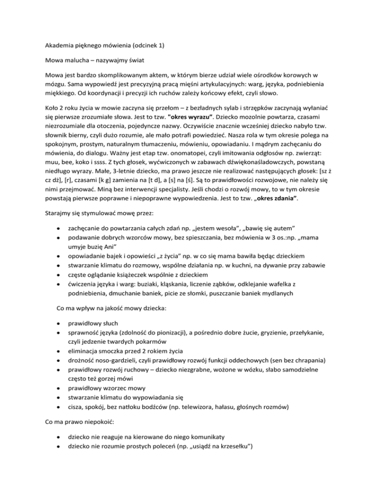 Akademia pięknego mówienia (odcinek 1) Mowa malucha – nazywajmy świat Mowa jest bardzo skomplikowanym aktem, w którym bierze udział wiele ośrodków korowych w mózgu. Sama wypowiedź jest precyzyjną pracą mięśni artykulacyjnych: warg, języka, podniebienia miękkiego. Od koordynacji i precyzji ich ruchów zależy końcowy efekt, czyli słowo. Koło 2 roku życia w mowie zaczyna się przełom – z bezładnych sylab i strzępków zaczynają wyłaniać się pierwsze zrozumiałe słowa. Jest to tzw. "okres wyrazu”. Dziecko mozolnie powtarza, czasami niezrozumiale dla otoczenia, pojedyncze nazwy. Oczywiście znacznie wcześniej dziecko nabyło tzw. słownik bierny, czyli dużo rozumie, ale mało potrafi powiedzieć. Nasza rola w tym okresie polega na spokojnym, prostym, naturalnym tłumaczeniu, mówieniu, opowiadaniu. I mądrym zachęcaniu do mówienia, do dialogu. Ważny jest etap tzw. onomatopei, czyli imitowania odgłosów np. zwierząt: muu, bee, koko i ssss. Z tych głosek, wyćwiczonych w zabawach dźwiękonaśladowczych, powstaną niedługo wyrazy. Małe, 3-letnie dziecko, ma prawo jeszcze nie realizować następujących głosek: [sz ż cz dż], [r], czasami [k g] zamienia na [t d], a [s] na [ś]. Są to prawidłowości rozwojowe, nie należy się nimi przejmować. Miną bez interwencji specjalisty. Jeśli chodzi o rozwój mowy, to w tym okresie powstają pierwsze poprawne i niepoprawne wypowiedzenia. Jest to tzw. „okres zdania”. Starajmy się stymulować mowę przez: zachęcanie do powtarzania całych zdań np. „jestem wesoła”, „bawię się autem” podawanie dobrych wzorców mowy, bez spieszczania, bez mówienia w 3 os.:np. „mama umyje buzię Ani” opowiadanie bajek i opowieści „z życia” np. w co się mama bawiła będąc dzieckiem stwarzanie klimatu do rozmowy, wspólne działania np. w kuchni, na dywanie przy zabawie częste oglądanie książeczek wspólnie z dzieckiem ćwiczenia języka i warg: buziaki, kląskania, liczenie ząbków, odklejanie wafelka z podniebienia, dmuchanie baniek, picie ze słomki, puszczanie baniek mydlanych Co ma wpływ na jakość mowy dziecka: prawidłowy słuch sprawność języka (zdolność do pionizacji), a pośrednio dobre żucie, gryzienie, przełykanie, czyli jedzenie twardych pokarmów eliminacja smoczka przed 2 rokiem życia drożność noso-gardzieli, czyli prawidłowy rozwój funkcji oddechowych (sen bez chrapania) prawidłowy rozwój ruchowy – dziecko niezgrabne, wożone w wózku, słabo samodzielne często też gorzej mówi prawidłowy wzorzec mowy stwarzanie klimatu do wypowiadania się cisza, spokój, bez natłoku bodźców (np. telewizora, hałasu, głośnych rozmów) Co ma prawo niepokoić: dziecko nie reaguje na kierowane do niego komunikaty dziecko nie rozumie prostych poleceń (np. „usiądź na krzesełku”) dziecko mówi bardzo mało, słownik nie przyrasta dziecko nie podejmuje prób rozmowy mowa się rozwijała aż nagle przestała dziecko się jąka, zacina, ma tiki dziecko podczas artykulacji wkłada język między zęby mowa dziecka jest kompletnie niezrozumiała dla otoczenia Warto skorzystać z porady logopedy zawsze, gdy rodzice czują jakiś niepokój. Rozwój mowy czasem przebiega z opóźnieniem, w indywidualnym tempie, ale to logopeda powinien stwierdzić, że nie ma powodu do niepokoju. logopeda M. Wójcicka