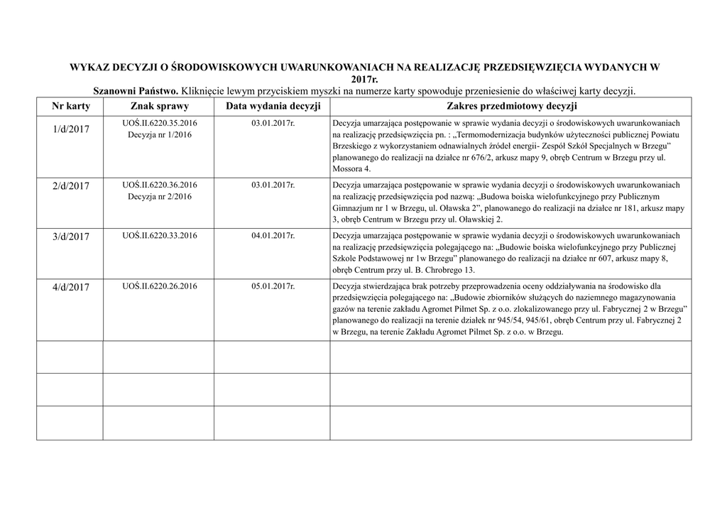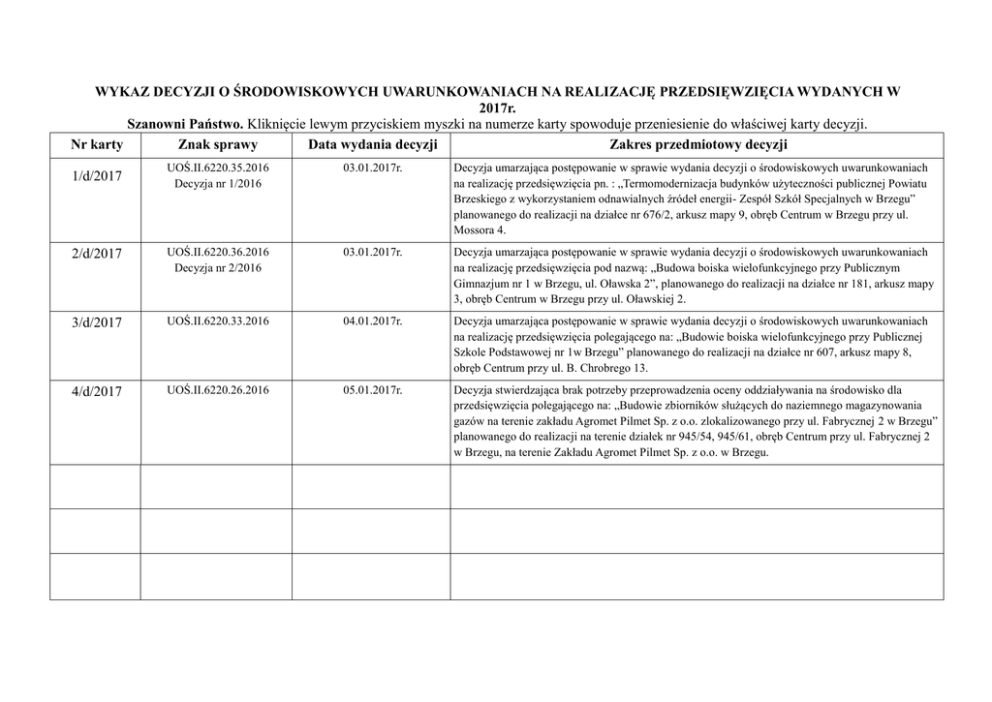 WYKAZ DECYZJI O ŚRODOWISKOWYCH UWARUNKOWANIACH NA REALIZACJĘ PRZEDSIĘWZIĘCIA WYDANYCH W 2017r. Szanowni Państwo. Kliknięcie lewym przyciskiem myszki na numerze karty spowoduje przeniesienie do właściwej karty decyzji. Nr karty Znak sprawy Data wydania decyzji Zakres przedmiotowy decyzji UOŚ.II.6220.35.2016 Decyzja nr 1/2016 03.01.2017r. Decyzja umarzająca postępowanie w sprawie wydania decyzji o środowiskowych uwarunkowaniach na realizację przedsięwzięcia pn. : „Termomodernizacja budynków użyteczności publicznej Powiatu Brzeskiego z wykorzystaniem odnawialnych źródeł energii- Zespół Szkół Specjalnych w Brzegu” planowanego do realizacji na działce nr 676/2, arkusz mapy 9, obręb Centrum w Brzegu przy ul. Mossora 4. 2/d/2017 UOŚ.II.6220.36.2016 Decyzja nr 2/2016 03.01.2017r. Decyzja umarzająca postępowanie w sprawie wydania decyzji o środowiskowych uwarunkowaniach na realizację przedsięwzięcia pod nazwą: „Budowa boiska wielofunkcyjnego przy Publicznym Gimnazjum nr 1 w Brzegu, ul. Oławska 2”, planowanego do realizacji na działce nr 181, arkusz mapy 3, obręb Centrum w Brzegu przy ul. Oławskiej 2. 3/d/2017 UOŚ.II.6220.33.2016 04.01.2017r. Decyzja umarzająca postępowanie w sprawie wydania decyzji o środowiskowych uwarunkowaniach na realizację przedsięwzięcia polegającego na: „Budowie boiska wielofunkcyjnego przy Publicznej Szkole Podstawowej nr 1w Brzegu” planowanego do realizacji na działce nr 607, arkusz mapy 8, obręb Centrum przy ul. B. Chrobrego 13. 4/d/2017 UOŚ.II.6220.26.2016 05.01.2017r. Decyzja stwierdzająca brak potrzeby przeprowadzenia oceny oddziaływania na środowisko dla przedsięwzięcia polegającego na: „Budowie zbiorników służących do naziemnego magazynowania gazów na terenie zakładu Agromet Pilmet Sp. z o.o. zlokalizowanego przy ul. Fabrycznej 2 w Brzegu” planowanego do realizacji na terenie działek nr 945/54, 945/61, obręb Centrum przy ul. Fabrycznej 2 w Brzegu, na terenie Zakładu Agromet Pilmet Sp. z o.o. w Brzegu. 1/d/2017 Powrót do wykazu KARTA INFORMACYJNA Numer karty/rok Rodzaj dokumentu 1/d/2017 Decyzja Temat dokumentu Środowiskowe uwarunkowania Nazwa dokumentu Zakres przedmiotowy dokumentu – opis dokumentu Decyzja umarzająca wydanie decyzji o środowiskowych uwarunkowaniach Obszar, którego dokument dotyczy, zgodnie z podziałem administracyjnym kraju Decyzja umarzająca postępowanie w sprawie wydania decyzji o środowiskowych uwarunkowaniach na realizację przedsięwzięcia pn. : „Termomodernizacja budynków użyteczności publicznej Powiatu Brzeskiego z wykorzystaniem odnawialnych źródeł energii- Zespół Szkół Specjalnych w Brzegu” planowanego do realizacji na działce nr 676/2, arkusz mapy 9, obręb Centrum w Brzegu przy ul. Mossora 4. Gmina Brzeg Znak sprawy UOŚ.II.6220.35.2016 Dokument wytworzył Biuro Urbanistyki i Ochrony Środowiska Urząd Miasta w Brzegu ul. Robotnicza 12 Data dokumentu Dokument zatwierdził Data zatwierdzenia dokumentu 03.01.2017r. Kierownik Biura Urbanistyki i Ochrony Środowiska z upoważnienia Burmistrza 03.01.2017r. Miejsce przechowywania dokumentu Biuro Urbanistyki i Ochrony Środowiska Urząd Miasta w Brzegu ul. Robotnicza 12 Adres elektroniczny zawierający odnośnik do dokumentu Czy dokument jest ostateczny Tak Numery kart innych dokumentów w sprawie 31/w/2016, Data zamieszczenia w wykazie danych o dokumencie 04.01.2017r. Zastrzeżenia dotyczące nieudostępniania informacji Uwagi Powrót do wykazu KARTA INFORMACYJNA Numer karty/rok Rodzaj dokumentu 2/d/2017 Decyzja Temat dokumentu Środowiskowe uwarunkowania Nazwa dokumentu Zakres przedmiotowy dokumentu – opis dokumentu Decyzja umarzająca wydanie decyzji o środowiskowych uwarunkowaniach Obszar, którego dokument dotyczy, zgodnie z podziałem administracyjnym kraju Decyzja umarzająca postępowanie w sprawie wydania decyzji o środowiskowych uwarunkowaniach na realizację przedsięwzięcia pod nazwą: „Budowa boiska wielofunkcyjnego przy Publicznym Gimnazjum nr 1 w Brzegu, ul. Oławska 2”, planowanego do realizacji na działce nr 181, arkusz mapy 3, obręb Centrum w Brzegu przy ul. Oławskiej 2. Gmina Brzeg Znak sprawy UOŚ.II.6220.36.2016 Dokument wytworzył Biuro Urbanistyki i Ochrony Środowiska Urząd Miasta w Brzegu ul. Robotnicza 12 Data dokumentu Dokument zatwierdził Data zatwierdzenia dokumentu 03.01.2017r. Kierownik Biura Urbanistyki i Ochrony Środowiska z upoważnienia Burmistrza 03.01.2017r. Miejsce przechowywania dokumentu Biuro Urbanistyki i Ochrony Środowiska Urząd Miasta w Brzegu ul. Robotnicza 12 Adres elektroniczny zawierający odnośnik do dokumentu Czy dokument jest ostateczny Tak Numery kart innych dokumentów w sprawie 32/w/2016, Data zamieszczenia w wykazie danych o dokumencie 04.01.2017r. Zastrzeżenia dotyczące nieudostępniania informacji Uwagi Powrót do wykazu KARTA INFORMACYJNA Numer karty/rok Rodzaj dokumentu 3/d/2017 Decyzja Temat dokumentu Środowiskowe uwarunkowania Nazwa dokumentu Zakres przedmiotowy dokumentu – opis dokumentu Decyzja umarzająca wydanie decyzji o środowiskowych uwarunkowaniach Obszar, którego dokument dotyczy, zgodnie z podziałem administracyjnym kraju Decyzja umarzająca postępowanie w sprawie wydania decyzji o środowiskowych uwarunkowaniach na realizację przedsięwzięcia polegającego na: „Budowie boiska wielofunkcyjnego przy Publicznej Szkole Podstawowej nr 1w Brzegu” planowanego do realizacji na działce nr 607, arkusz mapy 8, obręb Centrum przy ul. B. Chrobrego 13. Gmina Brzeg Znak sprawy UOŚ.II.6220.33.2016 Dokument wytworzył Biuro Urbanistyki i Ochrony Środowiska Urząd Miasta w Brzegu ul. Robotnicza 12 Data dokumentu Dokument zatwierdził Data zatwierdzenia dokumentu 04.01.2017r. Kierownik Biura Urbanistyki i Ochrony Środowiska z upoważnienia Burmistrza 04.01.2017r. Miejsce przechowywania dokumentu Biuro Urbanistyki i Ochrony Środowiska Urząd Miasta w Brzegu ul. Robotnicza 12 Adres elektroniczny zawi