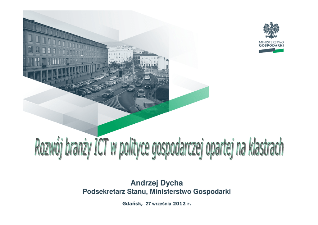 Andrzej Dycha Podsekretarz Stanu, Ministerstwo Gospodarki Gdańsk, 27 września 2012 r. 2 Rynek ICT w Polsce Lata 2005 – 2010 to dla polskiego sektora ICT okres stabilnego wzrostu wartości rynku z dynamiką na poziomie kilkunastu procent rocznie. Rozpoczęcie kryzysu finansowego w ostatnim kwartale 2008 roku spowodowało 10% spadek wartości całego rynku w roku 2009. W roku 2010 rynek powrócił na ścieŜkę wzrostu. Program promocji dla polskiego sektora ICT 3 • Polskie oprogramowanie i usługi informatyczne w polskich firmach • Polskie oprogramowanie i usługi informatyczne znane na świecie ze swojej jakości • Polscy informatycy doceniani nie tylko jako zwycięzcy konkursów informatycznych ale równieŜ jako partnerzy w biznesie • Wykorzystanie potencjału ICT do wzrostu innowacyjności i produktywności • Zachęcenie do inwestowania w rozwój ICT na terenie SSE • Wzmocnienie polityki klastrowej w sektorze ICT, pobudzenie rozwoju regionów przez potencjał Parków Technologicznych i Przemysłowych 4 Klaster - definicja „geograficzne skupisko wzajemnie powiązanych firm, wyspecjalizowanych dostawców, jednostek świadczących usługi, firm działających w pokrewnych sektorach i związanych z nimi instytucji (na przykład uniwersytetów, jednostek normalizacyjnych i stowarzyszeń branŜowych) w poszczególnych dziedzinach, konkurujących między sobą, ale równieŜ współpracujących”. M. Porter 5 Podmioty wchodzące w skład klastrów I. Przedsiębiorstwa II. Podmioty naukowe III. Władze publiczne Przemysł Klastry Władze publiczne Nauka 5 6 Przykładowe klastry ICT w Polsce ICT Pomerania Pomorski Klaster ICT ICT Amber Mazowiecki Klaster Technologii Informacyjnych i Komunikacyjnych (ICT) Wielkopolski Klaster Teleinformatyczny Alternatywny Klaster Informatyczny Klaster Wspólnota Wiedzy i Innowacji w Zakresie Technik Informacyjnych i Komunikacyjnych Wschodni Klaster ICT Powiązanie Kooperacyjne na rzecz Teleinformatyki Net4Work Wzgórza Nowych Technologii – NT Hills Podkarpacki Klaster Informatyczny Klaster Multimediów i Systemów Informacyjnych 7 Korzyści Korzyści klastrów z perspektywy: poziomu regionu (poziom mezoekonomiczny) gospodarki narodowej (poziom makroekonomiczny) Sukces klastrów pozytywnym bodźcem dla współpracy w regionie Klastry wzmacniają koniunkturę gospodarczą Tworzenie lokalnego łańcucha podaŜowego Klastry są stymulatorami innowacyjności Powstają nowe miejsca pracy, a jednocześnie zwiększa się podaŜ wyspecjalizowanej siły roboczej Klastry aktywizują eksport i przyciągają inwestycje zagraniczne Korzystna „atmosfera współpracy” wokół klastrów przyciąga inwestorów Klastry aktywizują działalność gospodarcza, zwiększając PKB Łatwy dostęp do specjalistycznych usług 8 Obecne instrumenty wspierania klastrów w Polsce Program Operacyjny Innowacyjna Gospodarka Program Operacyjny Kapitał Ludzki Program Operacyjny Rozwój Polski Wschodniej Regionalne Programy Operacyjne …….. Nowa Perspektywa Finansowa 2014-2020 8 9 Dziękuję za uwagę! [email protected]