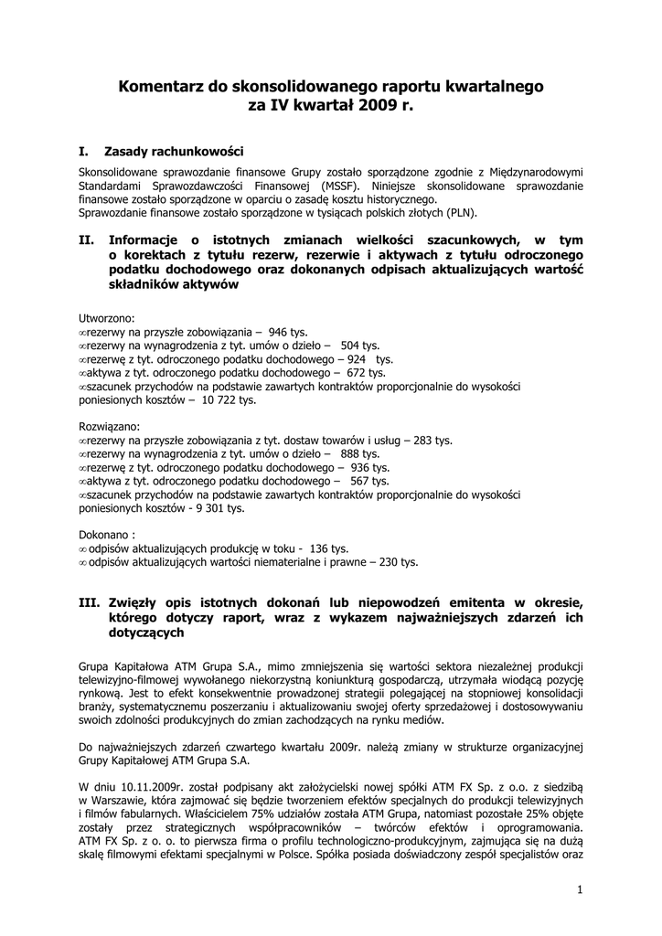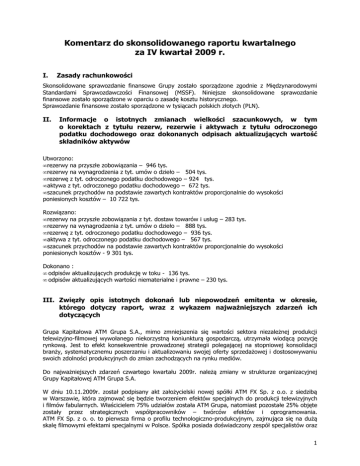 Komentarz do skonsolidowanego raportu kwartalnego za IV kwartał 2009 r. I. Zasady rachunkowości Skonsolidowane sprawozdanie finansowe Grupy zostało sporządzone zgodnie z Międzynarodowymi Standardami Sprawozdawczości Finansowej (MSSF). Niniejsze skonsolidowane sprawozdanie finansowe zostało sporządzone w oparciu o zasadę kosztu historycznego. Sprawozdanie finansowe zostało sporządzone w tysiącach polskich złotych (PLN). II. Informacje o istotnych zmianach wielkości szacunkowych, w tym o korektach z tytułu rezerw, rezerwie i aktywach z tytułu odroczonego podatku dochodowego oraz dokonanych odpisach aktualizujących wartość składników aktywów Utworzono: • rezerwy na przyszłe zobowiązania – 946 tys. • rezerwy na wynagrodzenia z tyt. umów o dzieło – 504 tys. • rezerwę z tyt. odroczonego podatku dochodowego – 924 tys. • aktywa z tyt. odroczonego podatku dochodowego – 672 tys. • szacunek przychodów na podstawie zawartych kontraktów proporcjonalnie do wysokości poniesionych kosztów – 10 722 tys. Rozwiązano: • rezerwy na przyszłe zobowiązania z tyt. dostaw towarów i usług – 283 tys. • rezerwy na wynagrodzenia z tyt. umów o dzieło – 888 tys. • rezerwę z tyt. odroczonego podatku dochodowego – 936 tys. • aktywa z tyt. odroczonego podatku dochodowego – 567 tys. • szacunek przychodów na podstawie zawartych kontraktów proporcjonalnie do wysokości poniesionych kosztów - 9 301 tys. Dokonano : • odpisów aktualizujących produkcję w toku - 136 tys. • odpisów aktualizujących wartości niematerialne i prawne – 230 tys. III. Zwięzły opis istotnych dokonań lub niepowodzeń emitenta w okresie, którego dotyczy raport, wraz z wykazem najważniejszych zdarzeń ich dotyczących Grupa Kapitałowa ATM Grupa S.A., mimo zmniejszenia się wartości sektora niezależnej produkcji telewizyjno-filmowej wywołanego niekorzystną koniunkturą gospodarczą, utrzymała wiodącą pozycję rynkową. Jest to efekt konsekwentnie prowadzonej strategii polegającej na stopniowej konsolidacji branży, systematycznemu poszerzaniu i aktualizowaniu swojej oferty sprzedażowej i dostosowywaniu swoich zdolności produkcyjnych do zmian zachodzących na rynku mediów. Do najważniejszych zdarzeń czwartego kwartału 2009r. należą zmiany w strukturze organizacyjnej Grupy Kapitałowej ATM Grupa S.A. W dniu 10.11.2009r. został podpisany akt założycielski nowej spółki ATM FX Sp. z o.o. z siedzibą w Warszawie, która zajmować się będzie tworzeniem efektów specjalnych do produkcji telewizyjnych i filmów fabularnych. Właścicielem 75% udziałów została ATM Grupa, natomiast pozostałe 25% objęte zostały przez strategicznych współpracowników – twórców efektów i oprogramowania. ATM FX Sp. z o. o. to pierwsza firma o profilu technologiczno-produkcyjnym, zajmująca się na dużą skalę filmowymi efektami specjalnymi w Polsce. Spółka posiada doświadczony zespół specjalistów oraz 1 własną bazę sprzętową. Silną pozycję nowo powstałej firmy potwierdza fakt, że przy współpracy z obecnymi członkami ekipy spółki ATM FX zrealizowano wiele polskich produkcji serialowych. Zgodnie ze strategią dywersyfikacji oferty Grupy ATM, nowe przedsięwzięcie umożliwi przede wszystkim zwiększenie przychodów pochodzących z nowej działalności oraz poszerzy możliwości realizacyjne naszej Grupy. W analizowanym okresie zakończył się proces przejęcia przez ATM Grupa S.A. spółki zależnej ATM Investment Sp. z o.o. W dniu 29.12.2009r. Sąd Rejonowy we Wrocławiu dokonał wpisu połączenia w Krajowym Rejestrze Sądowym. Tryb i zasady połączenia opisane zostały w punkcie IX niniejszego komentarza. Dokonane połączenie stanowi ważny element strategii Grupy Kapitałowej ATM Grupa, jego długookresowym celem jest bowiem zmniejszenie kosztów funkcjonowania łączących się spółek, koncentracja kapitału, a także kontynuacja oraz dalszy rozwój działalności w zakresie produkcji telewizyjnej i filmowej. Pod względem produkcyjnym czwarty kwartał 2009r. to dla spółek Grupy Kapitałowej ATM Grupa S.A. przede wszystkim okres kontynuacji znanych i lubianych przez widzów seriali telewizyjnych, takich jak: „Pierwsza Miłość”, „Ojciec Mateusz”, „Złotopolscy”. W analizowanym okresie rozpoczęte zostały również prace nad nowymi programami, wśród których należy wymienić serial „Licencja na wychowanie” oraz program rozrywkowy „On i ona”, które ukażą się na antenach stacji telewizyjnych już w marcu br. Produkcje spółek naszej Grupy cieszą się dużą popularnością wśród widzów, o czym świadczą ostatnie nominacje do Telekamer 2010. W tym roku do rywalizacji o statuetkę stanęły trzy nasze seriale (w dwóch kategoriach), jeden teleturniej oraz trzech aktorów znanych z produkcji Grupy ATM. Według danych opracowanych przez AGB Nielsen Media Research, produkcje „Ranczo”, „Ojciec Mateusz” oraz „Doręczyciel” realizowane przez Grupę Kapitałową ATM znalazły się w zestawieniu 10. najchętniej oglądanych seriali 2009 roku, zajmując odpowiednio pierwsze, drugie i trzecie miejsce. Wśród filmów fabularnych emitowanych w telewizji największą liczbę oglądających (6,99 mln widzów) zgromadziła kinowa wersja „Rancza” – „Ranczo Wilkowyje”, pokazana 26 grudnia 2009r. na antenie TVP 1. Pomimo niekorzystnej sytuacji na rynku telewizyjnym, Grupa ATM w dalszym ciągu inwestuje w nowe programy. W analizowanym okresie wyprodukowaliśmy na własny koszt i ryzyko kilka pilotowych odcinków nowych produkcji, którymi staramy się zainteresować stacje telewizyjne. Działania takie przynoszą zazwyczaj bardzo dobre efekty i większość produkcji prezentowanych w ten sposób zostaje zamówiona przez jednego z naszych głównych odbiorców. Na działania takie mogą sobie jednak pozwolić tylko spółki dysponujące odpowiednimi środkami finansowymi, co w obecnych warunkach