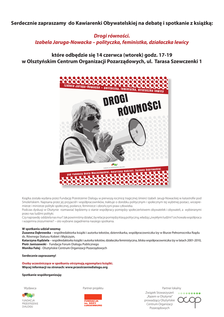 Serdecznie zapraszamy do Kawiarenki Obywatelskiej na debatę i spotkanie z książką: Drogi równości. Izabela Jaruga-Nowacka – polityczka, feministka, działaczka lewicy które odbędzie się 14 czerwca (wtorek) godz. 17-19 w Olsztyńskim Centrum Organizacji Pozarządowych, ul. Tarasa Szewczenki 1 Iz ab el a Ja ru ga -N ow ac ka – po lit yc zk a, fe m in is tk a, dz ia ła cz ka le w ic y DROGI I C Ś O RÓWN j nn y Dą br ow sk ie y Ką dz ie li, Zu za yn rz ta Ka , ej ki at y M ac ie je ws po d re da kc ją Be Książka została wydana przez Fundację Przestrzenie Dialogu w pierwszą rocznicę tragicznej śmierci Izabeli Jarugi-Nowackiej w katastrofie pod Smoleńskiem. Napisana przez jej przyjaciół i współpracowników, traktuje o dorobku politycznym i społecznym tej wybitnej postaci, wicepremierze i ministrze polityki społecznej, posłance, feministce i obrończyni praw człowieka. Podczas dyskusji w Olsztynie rozmawiać będziemy o stanie współpracy pomiędzy społeczeństwem obywatelek i obywateli, a wybieranymi przez nas ludźmi polityki. Czy naprawdę oddziela nas mur? Jak powinniśmy działać, by relacje pomiędzy klasą polityczną, władzą i„zwykłymi ludźmi” cechowała współpraca i wzajemna zrozumienie? – oto wybrane zagadnienia naszego spotkania. W spotkaniu udział wezmą: Zuzanna Dąbrowska – współredaktorka książki i autorka tekstów, dziennikarka, współpracowniczka Izy w Biurze Pełnomocnika Rządu ds. Równego Statusu Kobiet i Mężczyzn, Katarzyna Kądziela – współredaktorka książki i autorka tekstów, działaczka feministyczna, bliska współpracowniczka Izy w latach 2001-2010, Piotr Janiszewski - Fundacja Forum Dialogu Publicznego Monika Falej - Olsztyńskie Centrum Organizacji Pozarządowych Serdecznie zapraszamy! Osoby uczestniczące w spotkaniu otrzymają egzemplarz książki. Więcej informacji na stronach: www.przestrzeniedialogu.org Spotkanie współorganizują: Wydawca Partner projektu Partner lokalny Związek Stowarzyszeń „Razem w Olsztynie” prowadzący Olsztyńskie Centrum Organizacji Pozarządowych