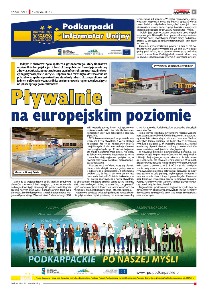 Nr 23(1621) 15 7 czerwca 2012 r. temperaturę 28 stopni C. W części rekreacyjnej, gdzie woda jest cieplejsza, mogą się bawić i spędzać więcej czasu. Rodzice małych dzieci mogą być spokojni o bezpieczeństwo swoich pociech, gdyż brodzik w najpłytszej części ma głębokość 10 cm, zaś w najgłębszej – 40 cm. Obiekt jest przystosowany do potrzeb osób niepełnosprawnych. Niezwykle istotnym aspektem powstania w mieście nowej inwestycji są miejsca pracy. Na basenie pracują 22 osoby; są to zarówno ratownicy, jak i tzw. dozór techniczny. Cała inwestycja kosztowała prawie 15 mln zł, zaś dofinansowanie unijne wyniosło ok. 2,5 mln zł. Włodarze gminy podkreślają, że to ogromna inwestycja, do której stale trzeba dopłacać. Dodają jednak, że warto: dzieci uczą się pływać, spędzają czas aktywnie, a to przecież inwesty- Jednym z obszarów życia społeczno-gospodarczego, który finansowo wspiera Unia Europejska, jest infrastruktura publiczna. Inwestycje w ochronę zdrowia, edukację, pomoc społeczną oraz infrastrukturę sportową i rekreacyjną przynoszą wiele korzyści. Odpowiednio rozwinięta, dostosowana do potrzeb oraz spełniająca określone standardy infrastruktura publiczna jest jednym z głównych wyznaczników poziomu rozwoju regionu, wpływających na jakość życia jego mieszkańców. Pływalnia w Sokołowie Małopolskim Pływalnie na europejskim poziomie Basen w Nowej Dębie Mimo że w województwie podkarpackim przybywa obiektów sportowych i rekreacyjnych, zapotrzebowanie na kolejne inwestycje nie maleje. Gospodarze miast i gmin szukają nowych możliwości dofinansowania tego typu obiektów. Środki dostępne w ramach Regionalnego Programu Operacyjnego Województwa Podkarpackiego (RPO WP) wsparły szereg inwestycji sportowo-rekreacyjnych, takich jak hale i boiska, całe kompleksy sportowo-rekreacyjne oraz np. pływalnie. W Sokołowie Małopolskim powstała nowoczesna kryta pływalnia. Z wielu atrakcji korzystają nie tylko mieszkańcy miasta i najbliższych okolic: nie brakuje również osób przyjezdnych, np. z Rzeszowa. Największą frajdę naturalnie mają dzieci. Nie dość, że lekcje wychowania fizycznego są teraz o wiele bardziej przyjemne i pożyteczne, to również czas wolny, po szkole, można tu spędzać atrakcyjnie. Podczas lekcji w-f dzieci uczą się pływać. Nauczyciele, dzięki pomocy gminy, zostali odpowiednio przeszkoleni. Z satysfakcją podkreślają, że baza sportowa gminy jest doskonała: jest „orlik”, bieżnia lekkoatletyczna, boiska sportowe, no i nowa pływalnia. W obiekcie jest mnóstwo atrakcji: sauna sucha i mokra, zjeżdżalnia o długości 65 m, sztuczna fala, tzw. „parasol” i „jeż” wodny oraz jacuzzi. Jacuzzi jest „rekordowo” duże, bo mieści aż 9 osób, jest podświetlone i otoczone zielenią. Uczniowie spędzają tylko pół godziny na nauce pływania, gdyż woda w części sportowej ma stosunkowo niską cja w ich zdrowie. Podobnie jak w przypadku dorosłych mieszkańców. To nie jedyne tego typu inwestycje w regionie współfinansowane ze środków RPO WP. Brzozów ma nowoczesny kompleks rekreacyjny z odkrytym basenem. Na dość rozległym terenie znajduje się kąpielisko ze zjeżdżalnią rynnową o długości 57 m i wieloma atrakcjami. Jest też wykładany płytami z betonu parking o powierzchni 400 mkw. z asfaltowym dojazdem z drogi głównej. W Nowej Dębie z kolei powstała nowa pływalnia, stanowiąca część Regionalnego Centrum Rekreacji i Rehabilitacji, obejmującego swym zakresem nie tylko usługi rekreacyjne, ale również rehabilitacyjne. W ramach projektu wybudowano kilkupoziomowy obiekt. Powstał m.in. basen o powierzchni 313 m², basen do nauki pływania połączony z basenem rekreacyjnym, zjeżdżalnia rynnowa, pomieszczenie ratownika i pierwszej pomocy oraz szatnie. W celu pełnego wykorzystania infrastruktury, na terenie dwóch innych gmin (Majdan Królewski oraz Bojanów) stworzono centra treningowe (Gminne Punkty Nauki Pływania), stanowiące bazę przygotowawczą przed zajęciami na pływalni. Bogata baza sportowo-rekreacyjna i łatwy dostęp do nowoczesnych obiektów sportowych to istotne elementy decydujące o atrakcyjności gmin jako miejsc zamieszkania oraz wypoczynku. Projekt finansowany przez Unię Europejską ze środków Europejskiego Funduszu Rozwoju Regionalnego w ramach Regionalnego Programu Operacyjnego Województwa Podkarpackiego na lata 2007-2013 [email protected]