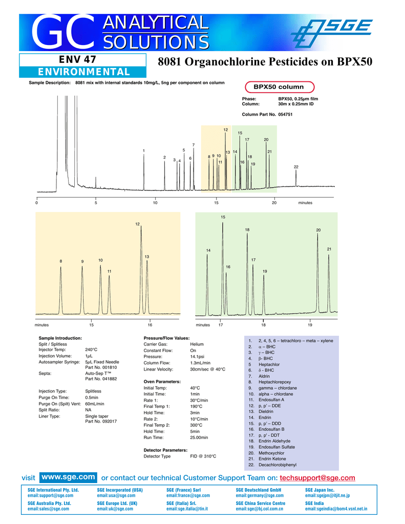 GC ANALYTICAL SOLUTIONS ENV 47 ENVIRONMENTAL Sample Description: 8081 Organochlorine Pesticides on BPX50 8081 mix with internal standards 10mg/L, 5ng per component on column BPX50 column Phase: Column: BPX50, 0.25µm film 30m x 0.25mm ID Column Part No. 054751 12 15 20 17 7 5 1 2 0 5 3 4 8 9 10 11 6 10 21 13 14 18 16 19 22 15 20 minutes 15 12 18 20 21 14 8 13 10 9 17 16 11 minutes 15 16 Sample Introduction: Split / Splitless Injector Temp: 240¡C Injection Volume: 1µL Autosampler Syringe: 5µL Fixed Needle Part No. 001810 Septa: Auto-Sep Tª Part No. 041882 Injection Type: Purge On Time: Purge On (Spilt) Vent: Split Ratio: Liner Type: 19 Splitless 0.5min 60mL/min NA Single taper Part No. 092017 minutes 17 Pressure/Flow Values: Carrier Gas: Helium Constant Flow: On Pressure: 14.1psi Column Flow: 1.3mL/min Linear Velocity: 30cm/sec @ 40¡C Oven Parameters: Initial Temp: Initial Time: Rate 1: Final Temp 1: Hold Time: Rate 2: Final Temp 2: Hold Time: Run Time: 40¡C 1min 30¡C/min 190¡C 3min 10¡C/min 300¡C 5min 25.00min Detector Parameters: Detector Type FID @ 310¡C 18 1. 2. 3. 4. 5 6. 7. 8. 9. 10. 11. 12. 13. 14. 15. 16. 17. 18. 19. 20. 21. 22. 19 2, 4, 5, 6 Ð tetrachloro Ð meta Ð xylene α Ð BHC γ Ð BHC β- BHC Heptachlor δ - BHC Aldrin Heptachlorepoxy gamma Ð chlordane alpha Ð chlordane Endosulfan A p, pÕ Ð DDE Dieldrin Endrin p, pÕ Ð DDD Endosulfan B p, p' - DDT Endrin Aldehyde Endosulfan Sulfate Methoxychlor Endrin Ketone Decachlorobiphenyl visit www.sge.com or contact our technical Customer Support Team on: [email protected] SGE International Pty. Ltd. email:[email protected] SGE Incorporated (USA) email:[email protected] SGE (France) Sarl email:[email protected] SGE Deutschland GmbH email:[email protected] SGE Japan Inc. email:[email protected] SGE Australia Pty. Ltd. email:[email protected] SGE Europe Ltd. (UK) email:[email protected] SGE (Italia) Srl. email:[email protected] SGE China Service Centre email:[email protected] SGE India email:[email protected]