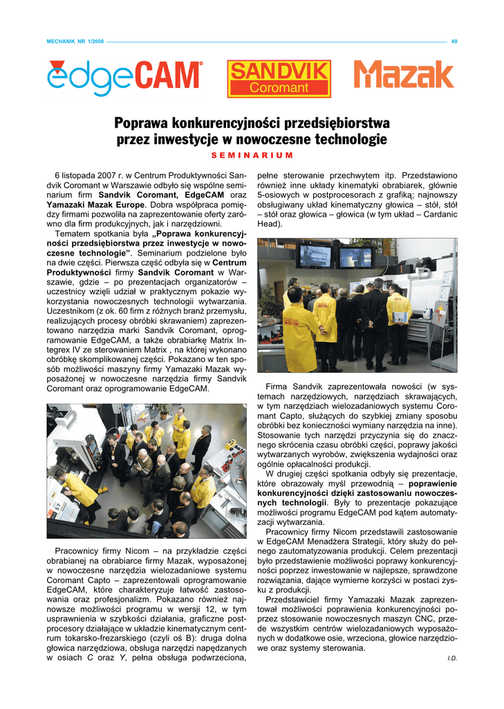 MECHANIK NR 1/2008 49 Poprawa konkurencyjności przedsiębiorstwa przez inwestycje w nowoczesne technologie SEMINARIUM 6 listopada 2007 r. w Centrum Produktywności Sandvik Coromant w Warszawie odbyło się wspólne seminarium firm Sandvik Coromant, EdgeCAM oraz Yamazaki Mazak Europe. Dobra współpraca pomiędzy firmami pozwoliła na zaprezentowanie oferty zarówno dla firm produkcyjnych, jak i narzędziowni. Tematem spotkania była „Poprawa konkurencyjności przedsiębiorstwa przez inwestycje w nowoczesne technologie”. Seminarium podzielone było na dwie części. Pierwsza część odbyła się w Centrum Produktywności firmy Sandvik Coromant w Warszawie, gdzie – po prezentacjach organizatorów – uczestnicy wzięli udział w praktycznym pokazie wykorzystania nowoczesnych technologii wytwarzania. Uczestnikom (z ok. 60 firm z różnych branż przemysłu, realizujących procesy obróbki skrawaniem) zaprezentowano narzędzia marki Sandvik Coromant, oprogramowanie EdgeCAM, a także obrabiarkę Matrix Integrex IV ze sterowaniem Matrix , na której wykonano obróbkę skomplikowanej części. Pokazano w ten sposób możliwości maszyny firmy Yamazaki Mazak wyposażonej w nowoczesne narzędzia firmy Sandvik Coromant oraz oprogramowanie EdgeCAM. Pracownicy firmy Nicom – na przykładzie części obrabianej na obrabiarce firmy Mazak, wyposażonej w nowoczesne narzędzia wielozadaniowe systemu Coromant Capto – zaprezentowali oprogramowanie EdgeCAM, które charakteryzuje łatwość zastosowania oraz profesjonalizm. Pokazano również najnowsze możliwości programu w wersji 12, w tym usprawnienia w szybkości działania, graficzne postprocesory działające w układzie kinematycznym centrum tokarsko-frezarskiego (czyli oś B): druga dolna głowica narzędziowa, obsługa narzędzi napędzanych w osiach C oraz Y, pełna obsługa podwrzeciona, pełne sterowanie przechwytem itp. Przedstawiono również inne układy kinematyki obrabiarek, głównie 5-osiowych w postprocesorach z grafiką; najnowszy obsługiwany układ kinematyczny głowica – stół, stół – stół oraz głowica – głowica (w tym układ – Cardanic Head). Firma Sandvik zaprezentowała nowości (w systemach narzędziowych, narzędziach skrawających, w tym narzędziach wielozadaniowych systemu Coromant Capto, służących do szybkiej zmiany sposobu obróbki bez konieczności wymiany narzędzia na inne). Stosowanie tych narzędzi przyczynia się do znacznego skrócenia czasu obróbki części, poprawy jakości wytwarzanych wyrobów, zwiększenia wydajności oraz ogólnie opłacalności produkcji. W drugiej części spotkania odbyły się prezentacje, które obrazowały myśl przewodnią – poprawienie konkurencyjności dzięki zastosowaniu nowoczesnych technologii. Były to prezentacje pokazujące możliwości programu EdgeCAM pod kątem automatyzacji wytwarzania. Pracownicy firmy Nicom przedstawili zastosowanie w EdgeCAM Menadżera Strategii, który służy do pełnego zautomatyzowania produkcji. Celem prezentacji było przedstawienie możliwości poprawy konkurencyjności poprzez inwestowanie w najlepsze, sprawdzone rozwiązania, dające wymierne korzyści w postaci zysku z produkcji. Przedstawiciel firmy Yamazaki Mazak zaprezentował możliwości poprawienia konkurencyjności poprzez stosowanie nowoczesnych maszyn CNC, przede wszystkim centrów wielozadaniowych wyposażonych w dodatkowe osie, wrzeciona, głowice narzędziowe oraz systemy sterowania. I.D.