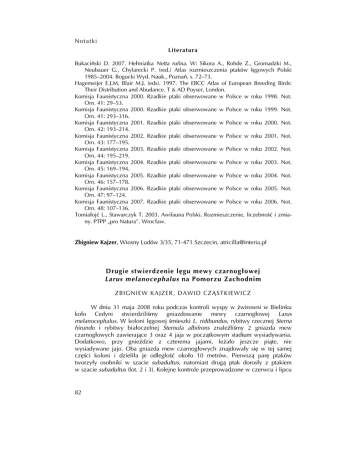N ota tk i L i te r a t u r a Bukaciński D. 2007. Hełmiatka Netta rufina. W: Sikora A., Rohde Z., Gromadzki M., Neubauer G., Chylarecki P. (red.) Atlas rozmieszczenia ptaków lęgowych Polski 1985–2004. Bogucki Wyd. Nauk., Poznań, s. 72–73. Hagemeijer E.J.M, Blair M.J. (eds). 1997. The EBCC Atlas of European Breeding Birds: Their Distribution and Abudance. T & AD Poyser, London. Komisja Faunistyczna 2000. Rzadkie ptaki obserwowane w Polsce w roku 1998. Not. Orn. 41: 29–53. Komisja Faunistyczna 2000. Rzadkie ptaki obserwowane w Polsce w roku 1999. Not. Orn. 41: 293–316. Komisja Faunistyczna 2001. Rzadkie ptaki obserwowane w Polsce w roku 2000. Not. Orn. 42: 193–214. Komisja Faunistyczna 2002. Rzadkie ptaki obserwowane w Polsce w roku 2001. Not. Orn. 43: 177–195. Komisja Faunistyczna 2003. Rzadkie ptaki obserwowane w Polsce w roku 2002. Not. Orn. 44: 195–219. Komisja Faunistyczna 2004. Rzadkie ptaki obserwowane w Polsce w roku 2003. Not. Orn. 45: 169–194. Komisja Faunistyczna 2005. Rzadkie ptaki obserwowane w Polsce w roku 2004. Not. Orn. 46: 157–178. Komisja Faunistyczna 2006. Rzadkie ptaki obserwowane w Polsce w roku 2005. Not. Orn. 47: 97–124. Komisja Faunistyczna 2007. Rzadkie ptaki obserwowane w Polsce w roku 2006. Not. Orn. 48: 107–136. Tomiałojć L., Stawarczyk T. 2003. Awifauna Polski. Rozmieszczenie, liczebność i zmiany. PTPP „pro Natura”, Wrocław. Zbigniew Kajzer, Wiosny Ludów 3/35, 71-471 Szczecin, [email protected] Drugie stwierdzenie lęgu mewy czarnogłowej Larus melanocephal us na Pomorzu Zachodnim ZBIG N IE W K A JZE R , D A WID CZĄ S TK IE W I CZ W dniu 31 maja 2008 roku podczas kontroli wyspy w żwirowni w Bielinku koło Cedyni stwierdziliśmy gniazdowanie mewy czarnogłowej Larus melanocephalus. W koloni lęgowej śmieszki L. ridibundus, rybitwy rzecznej Sterna hirundo i rybitwy białoczelnej Sternula albifrons znaleźliśmy 2 gniazda mew czarnogłowych zawierające 3 oraz 4 jaja w początkowym stadium wysiadywania. Dodatkowo, przy gnieździe z czterema jajami, leżało jeszcze piąte, nie wysiadywane jajo. Oba gniazda mew czarnogłowych znajdowały się w tej samej części koloni i dzieliła je odległość około 10 metrów. Pierwszą parę ptaków tworzyły osobniki w szacie subadultus, natomiast drugą ptak dorosły z ptakiem w szacie subadultus (fot. 2 i 3). Kolejne kontrole przeprowadzone w czerwcu i lipcu 82 N ota tk i wykazały, że lęgi obu par zakończyły się pomyślnie, choć sukces lęgowy był niski. Ostatecznie dwa lub trzy pisklęta mew czarnogłowych osiągnęły zdolność do lotu. Opisane powyżej stwierdzenie lęgu mew czarnogłowych zostało udokumentowane fotograficznie i uzyskało akceptację Komisji Faunistycznej. Główne lęgowiska mewy czarnogłowej w Europie znajdują się w południowo-wschodniej i południowej części kontynentu, przede wszystkim na północnym wybrzeżu Morza Czarnego, nad Morzem Egejskim oraz we wschodniej części Półwyspu Apenińskiego (Hagemeijer & Blair 1997, Bukaciński et al. 2007). Ekspansja terytorialna osobników z populacji czarnomorskiej, zapoczątkowana w latach 1950., spowodowała zasiedlenie większości krajów zachodniej i środkowej Europy. Obecnie, w tej części Europy, mewa czarnogłowa najliczniej gniazduje we Francji, Belgii, Holandii, na Węgrzech oraz w Niemczech (Hagemeijer & Blair 1997, Bukaciński et al. 2007). W Polsce pierwszy lęg mewy czarnogłowej stwierdzono w roku 1981 na Zalewie Wiślanym, a następnie w roku 1982 wykryto stanowisko 3 par na środkowej Wiśle (Tomiałojć & Stawarczyk 2003). Dalsza kolonizacja spowodowała wykrycie w latach 1980. i 1990. szeregu stanowisk lęgowych w większości regionów kraju. Do końca lat 1990. pewne lęgi mew czarnogłowych stwierdzono w sumie na 21 stanowiskach (Komisja Faunistyczna 2003, Tomiałojć & Stawarczyk 2003). W latach 2000–2005 liczebność par lęgowych i prawdopodobnie lęgowych kształtowała się na poziomie 28–54 par na 11–19 stanowiskach (Bukaciński et al. 2007). Na Pomorzu Zachodnim pierwszy przypadek gniazdowania mewy czarnogłowej stwierdzono w roku 1993 na Karsiborskiej Kępie pod Świnoujściem, gdzie znaleziono gniazdo jednej pary (Tomiałojć & Stawarczyk 2003). Opisane powyżej stwierdzenie lęgów dwóch par w żwirowni w Bielinku jest zatem drugim przypadkiem gniazdowania tego gatunku w regionie. Składamy serdeczne podziękowania kierownikowi żwirowni w Bielinku – Panu Czesławowi Szóstakiewiczowi, za nieocenioną pomoc w organizacji badań i ochrony kolonii mew i rybitw. *** The second breeding record of the Mediterranean Gull Larus melanocephalus in Western Pomerania. In May–June 2008, two pairs of nesting Mediterranean Gull in the gravel pit in Bielinek near Cedynia, were confirmed (photo 2–3). It is the second breeding record for this species in Western Pomerania. The Mediterranean Gull first bred on Karsiborska Kępa near Świnoujście in 1993. Accepted by the Avifaunistic Commission. L i te r a t u r a Bukaciński D., Bukacińska M., Zielińska M. 2007. Mewa czarnogłowa Larus melanocephalus. W: Sikora A., Rohde Z., Gromadzki M., Neubauer G., Chylarecki P. (red.) Atlas rozmieszczenia ptaków lęgowych Polski 1985–2004. Bogucki Wyd. Nauk., Poznań, s. 224–225. Hagemeijer E.J.M, Blair M.J. (eds). 1997. The EBCC Atlas of European Breeding Birds: Their Distribution and Abudance. T & AD Poyser, London. 83 N ota tk i Komisja Faunistyczna 2003. Rzadkie ptaki obserwowane w Polsce w roku 2002. Not. Orn. 44: 195–219. Tomiałojć L., Stawarczyk T. 2003. Awifauna Polski. Rozmieszczenie, liczebność i zmiany. PTPP „pro Natura”, Wrocław. Zbigniew Kajzer, Wiosny Ludów 3/35, 71-471 Szczecin, [email protected] Dawid Cząstkiewicz, Iwaszkiewicza 34/9, 10-089 Olsztyn, [email protected] Drugie stwierdzenie lęgu rybitwy białoskrzydłej Chlidonias leucopterus na Pomorzu Zachodnim MIŁ OS Z K OW AL E WS K I Dnia 13 czerwca 2007 na rozlewisku w Pyszce pod Kołobrzegiem