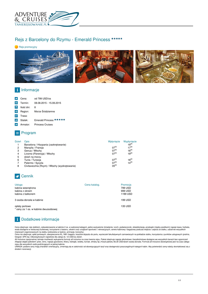 Rejs z Barcelony do Rzymu - Emerald Princess Rejs promocyjny Informacje Cena: od 799 USD/os Termin: 08.08.2015 - 15.08.2015 Ilość dni: 8 Region: Morze Śródziemne Trasa: Statek: Emerald Princess Armator: Princess Cruises Program Dzień 1 2 3 4 5 6 7 8 Opis Barcelona / Hiszpania (zaokrętowanie) Marsylia / Francja Genua / Włochy Livorno (Florencja) / Włochy dzień na morzu Tunis / Tunezja Palermo / Sycylia Civitavecchia (Rzym) / Włochy (wyokrętowanie) Wpłynięcie 0700 0700 0700 0700 0700 0500 Wypłynięcie 1900 1700 1800 1900 1800 1400 Cennik Usługa kabina wewnętrzna kabina z oknem kabina z balkonem Cena katalog. Promocja 799 USD 999 USD 1199 USD 3 osoba dorosła w kabinie 199 USD opłaty portowe * ceny za 1 os. w kabinie dwuosobowej 135 USD Dodatkowe informacje Cena obejmuje: rejs statkiem, zakwaterowanie w kabinie 2 os. w wybranej kategorii, pełne wyżywienie (śniadanie, lunch, podwieczorek, obiadokolację, przekąski między posiłkami) napoje kawa, herbata, woda dostępne w restauracji bufetowej, korzystanie z basenu, siłowni oraz urządzeń sportowo – rekreacyjnych, serwis kabinowy i bagażowy podczas wejścia i zejścia ze statku, udział we wszystkich imprezach organizowanych na statku (widowiska w teatrze, animacje, koncerty). Cena nie obejmuje: opłat portowych, ubezpieczenia KL, NW i bagażu, kosztów dojazdu do portu, wycieczek fakultatywnych zamawianych na pokładzie statku, korzystania z punktów usługowych (pralnia, fotograf, SPA itp.) Obowiązkowych napiwków dla załogi ok. 12 USD/os./dzień. All Inclusive (opcjonalnie) Istnieje możliwość wykupienia formuły all inclusive na czas trwania rejsu. Pakiet obejmuje napoje alkoholowe i bezalkoholowe dostępne we wszystkich barach bez ograniczeń (Napoje objęte pakietem: piwo, wino, napoje gazowane, likiery, koktajle, wódka, koniak, whisky itp.) Koszt pakietu 56,35 USD/dzień osoba dorosła. Formuła all inclusive obowiązkowa jest na czas całego rejsu dla wszystkich osób podróżujących w jednej kabinie. UWAGA: podane ceny mają charakter orientacyjny, zmieniają się w zależności od obowiązujących taryf oraz dostępności poszczególnych kategorii kabin. Aby potwierdzić cenę należy skontaktować się z działem rezerwacji. 1/1 Powered by TCPDF (www.tcpdf.org)
