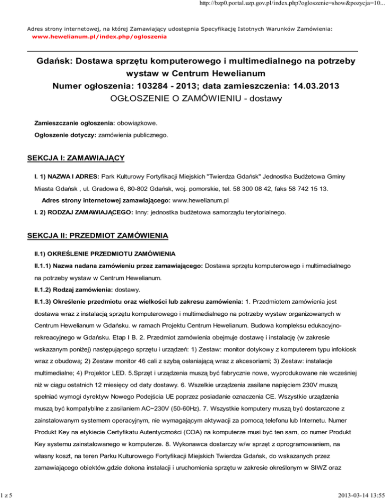 1z5 http://bzp0.portal.uzp.gov.pl/index.php?ogloszenie=show&pozycja=10... Adres strony internetowej, na której Zamawiający udostępnia Specyfikację Istotnych Warunków Zamówienia: www.hewelianum.pl/index.php/ogloszenia Gdańsk: Dostawa sprzętu komputerowego i multimedialnego na potrzeby wystaw w Centrum Hewelianum Numer ogłoszenia: 103284 - 2013; data zamieszczenia: 14.03.2013 OGŁOSZENIE O ZAMÓWIENIU - dostawy Zamieszczanie ogłoszenia: obowiązkowe. Ogłoszenie dotyczy: zamówienia publicznego. SEKCJA I: ZAMAWIAJĄCY I. 1) NAZWA I ADRES: Park Kulturowy Fortyfikacji Miejskich "Twierdza Gdańsk" Jednostka Budżetowa Gminy Miasta Gdańsk , ul. Gradowa 6, 80-802 Gdańsk, woj. pomorskie, tel. 58 300 08 42, faks 58 742 15 13. Adres strony internetowej zamawiającego: www.hewelianum.pl I. 2) RODZAJ ZAMAWIAJĄCEGO: Inny: jednostka budżetowa samorządu terytorialnego. SEKCJA II: PRZEDMIOT ZAMÓWIENIA II.1) OKREŚLENIE PRZEDMIOTU ZAMÓWIENIA II.1.1) Nazwa nadana zamówieniu przez zamawiającego: Dostawa sprzętu komputerowego i multimedialnego na potrzeby wystaw w Centrum Hewelianum. II.1.2) Rodzaj zamówienia: dostawy. II.1.3) Określenie przedmiotu oraz wielkości lub zakresu zamówienia: 1. Przedmiotem zamówienia jest dostawa wraz z instalacją sprzętu komputerowego i multimedialnego na potrzeby wystaw organizowanych w Centrum Hewelianum w Gdańsku. w ramach Projektu Centrum Hewelianum. Budowa kompleksu edukacyjnorekreacyjnego w Gdańsku. Etap I B. 2. Przedmiot zamówienia obejmuje dostawę i instalację (w zakresie wskazanym poniżej) następującego sprzętu i urządzeń: 1) Zestaw: monitor dotykowy z komputerem typu infokiosk wraz z obudową; 2) Zestaw monitor 46 cali z szybą osłaniającą wraz z akcesoriami; 3) Zestaw: instalacje multimedialne; 4) Projektor LED. 5.Sprzęt i urządzenia muszą być fabrycznie nowe, wyprodukowane nie wcześniej niż w ciągu ostatnich 12 miesięcy od daty dostawy. 6. Wszelkie urządzenia zasilane napięciem 230V muszą spełniać wymogi dyrektyw Nowego Podejścia UE poprzez posiadanie oznaczenia CE. Wszystkie urządzenia muszą być kompatybilne z zasilaniem AC~230V (50-60Hz). 7. Wszystkie komputery muszą być dostarczone z zainstalowanym systemem operacyjnym, nie wymagającym aktywacji za pomocą telefonu lub Internetu. Numer Produkt Key na etykiecie Certyfikatu Autentyczności (COA) na komputerze musi być ten sam, co numer Produkt Key systemu zainstalowanego w komputerze. 8. Wykonawca dostarczy w/w sprzęt z oprogramowaniem, na własny koszt, na teren Parku Kulturowego Fortyfikacji Miejskich Twierdza Gdańsk, do wskazanych przez zamawiającego obiektów,gdzie dokona instalacji i uruchomienia sprzętu w zakresie określonym w SIWZ oraz 2013-03-14 13:55 2z5 http://bzp0.portal.uzp.gov.pl/index.php?ogloszenie=show&pozycja=10... przeprowadzi szkolenie 5 pracowników zamawiającego z obsługi w zakresie podstawowym. 9. Instalacja sprzętu obejmuje również: 1) dostawę i montaż okablowania strukturalnego, sygnałowego i zasilającego; 2) maskowanie tras kablowych i doprowadzenie do stanu sprzed prowadzenia tras kablowych; 3) instalację oprogramowania; 4) uruchomienie i testy sprzętu. 10. Obiekty, w których będzie instalowany sprzęt, zostały wpisane do rejestru zabytków województwa pomorskiego, pod numerem 268, decyzją Wojewódzkiego Konserwatora Zabytków w Gdańsku, z dnia 14.06.1968r. (nowy numer rejestru zabytków - 474). Ponadto są położone w obszarze układu urbanistycznego miasta Gdańska, wpisanego do rejestru zabytków pod numerem 8, decyzją Wojewódzkiego Konserwatora Zabytków w Gdańsku, z dnia 11.10.1947 r. (nowy numer rejestru zabytków - 15), uznanego za pomnik historii Zarządzeniem Prezydenta Rzeczpospolitej Polskiej z dnia 8 września 1994r. Wykonawca, przy instalacji sprzętu jest zobowiązany wziąć pod uwagę ograniczenia wynikające z ochrony konserwatorskiej. Wobec powyższego instalacja powinna być wykonywana ściśle według wskazówek zamawiającego. II.1.4) Czy przewiduje się udzielenie zamówień uzupełniających: nie. II.1.5) Wspólny Słownik Zamówień (CPV): 30.23.13.00-0, 30.23.13.20-6, 32.32.20.00-6, 30.23.60.00-2, 51.61.20.00-5, 51.31.00.00-8. II.1.6) Czy dopuszcza się złożenie oferty częściowej: nie. II.1.7) Czy dopuszcza się złożenie oferty wariantowej: nie. II.2) CZAS TRWANIA ZAMÓWIENIA LUB TERMIN WYKONANIA: Okres w dniach: 42. SEKCJA III: INFORMACJE O CHARAKTERZE PRAWNYM, EKONOMICZNYM, FINANSOWYM I TECHNICZNYM III.2) ZALICZKI Czy przewiduje się udzielenie zaliczek na poczet wykonania zamówienia: nie III.3) WARUNKI UDZIAŁU W POSTĘPOWANIU ORAZ OPIS SPOSOBU DOKONYWANIA OCENY SPEŁNIANIA TYCH WARUNKÓW III.3.2) Wiedza i doświadczenie Opis sposobu dokonywania oceny spełniania tego warunku Wykonawca wykaże, że wykonał w okresie ostatnich 3 lat przed upływem terminu składania ofert, a jeżeli okres prowadzenia przez niego działalności jest krótszy - w tym okresie, co najmniej dwie dostawy urządzeń multimedialnych (obejmujących urządzenia wyposażone w monitory dotykowe), o wartości nie mniejszej niż 80 000 zł brutto każda III.4) INFORMACJA O OŚWIADCZENIACH LUB DOKUMENTACH, JAKIE MAJĄ DOSTARCZYĆ WYKONAWCY W CELU POTWIERDZENIA SPEŁNIANIA WARUNKÓW UDZIAŁU W POSTĘPOWANIU ORAZ NIEPODLEGANIA WYKLUCZENIU NA PODSTAWIE ART. 24 UST. 1 USTAWY III.4.1) W zakresie wykazania spełniania przez wykonawcę warunków, o których mowa w art. 22 ust. 1 ustawy, oprócz oświadczenia o spełnieniu warunków udziału w postępowaniu, należy przedłożyć: III.4.2) W zakresie potwierdzenia niepodlegania wykluczeniu na podstawie art. 24 ust. 1 ustawy, 2013-03-14 13:55 3z5 http://bzp0.portal.uzp.gov.pl/index.php?ogloszenie=show&pozycja=10... należy przedłożyć: oświadczenie o braku podstaw do wykluczenia III.4.3) Dokumenty podmiotów zagranicznych Jeżeli wykonawca ma siedzibę lub miejsce zamieszkania poza terytorium Rzeczypospolitej Polskiej, przedkłada: III.4.3.1) dokument wyst