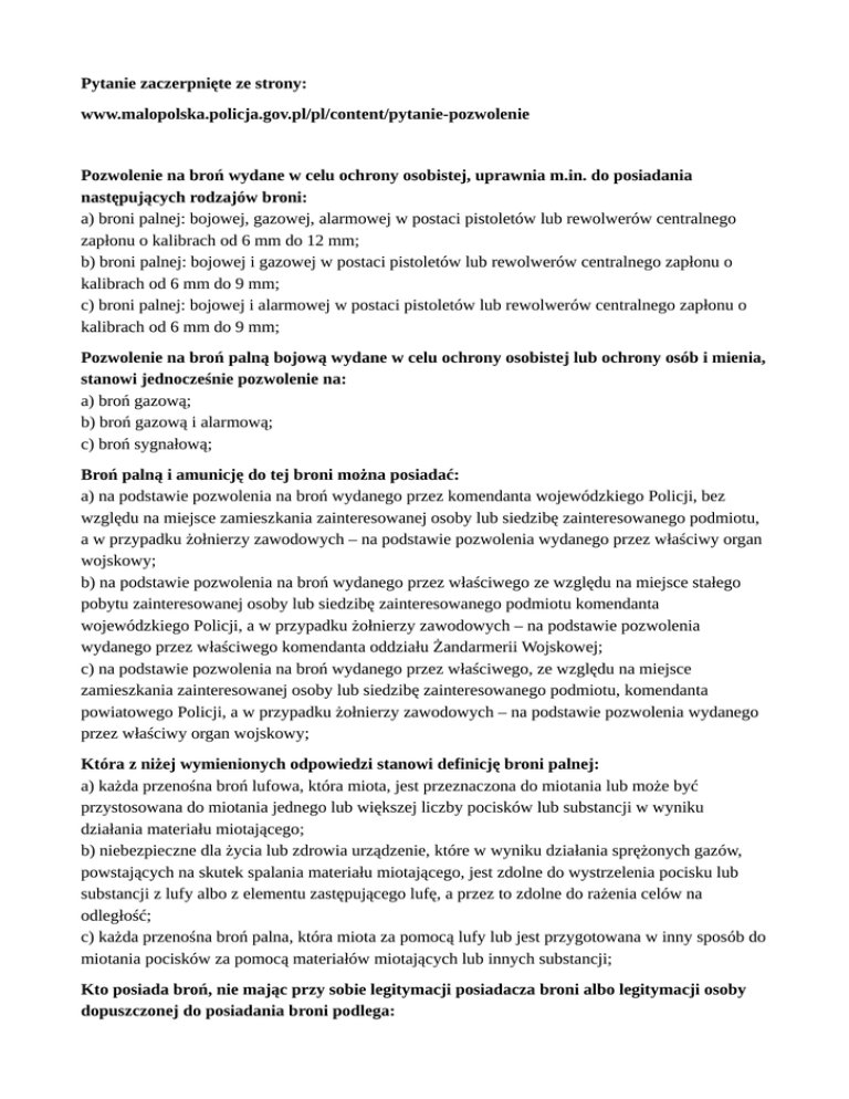 Pytanie zaczerpnięte ze strony: www.malopolska.policja.gov.pl/pl/content/pytanie-pozwolenie Pozwolenie na broń wydane w celu ochrony osobistej, uprawnia m.in. do posiadania następujących rodzajów broni: a) broni palnej: bojowej, gazowej, alarmowej w postaci pistoletów lub rewolwerów centralnego zapłonu o kalibrach od 6 mm do 12 mm; b) broni palnej: bojowej i gazowej w postaci pistoletów lub rewolwerów centralnego zapłonu o kalibrach od 6 mm do 9 mm; c) broni palnej: bojowej i alarmowej w postaci pistoletów lub rewolwerów centralnego zapłonu o kalibrach od 6 mm do 9 mm; Pozwolenie na broń palną bojową wydane w celu ochrony osobistej lub ochrony osób i mienia, stanowi jednocześnie pozwolenie na: a) broń gazową; b) broń gazową i alarmową; c) broń sygnałową; Broń palną i amunicję do tej broni można posiadać: a) na podstawie pozwolenia na broń wydanego przez komendanta wojewódzkiego Policji, bez względu na miejsce zamieszkania zainteresowanej osoby lub siedzibę zainteresowanego podmiotu, a w przypadku żołnierzy zawodowych – na podstawie pozwolenia wydanego przez właściwy organ wojskowy; b) na podstawie pozwolenia na broń wydanego przez właściwego ze względu na miejsce stałego pobytu zainteresowanej osoby lub siedzibę zainteresowanego podmiotu komendanta wojewódzkiego Policji, a w przypadku żołnierzy zawodowych – na podstawie pozwolenia wydanego przez właściwego komendanta oddziału Żandarmerii Wojskowej; c) na podstawie pozwolenia na broń wydanego przez właściwego, ze względu na miejsce zamieszkania zainteresowanej osoby lub siedzibę zainteresowanego podmiotu, komendanta powiatowego Policji, a w przypadku żołnierzy zawodowych – na podstawie pozwolenia wydanego przez właściwy organ wojskowy; Która z niżej wymienionych odpowiedzi stanowi definicję broni palnej: a) każda przenośna broń lufowa, która miota, jest przeznaczona do miotania lub może być przystosowana do miotania jednego lub większej liczby pocisków lub substancji w wyniku działania materiału miotającego; b) niebezpieczne dla życia lub zdrowia urządzenie, które w wyniku działania sprężonych gazów, powstających na skutek spalania materiału miotającego, jest zdolne do wystrzelenia pocisku lub substancji z lufy albo z elementu zastępującego lufę, a przez to zdolne do rażenia celów na odległość; c) każda przenośna broń palna, która miota za pomocą lufy lub jest przygotowana w inny sposób do miotania pocisków za pomocą materiałów miotających lub innych substancji; Kto posiada broń, nie mając przy sobie legitymacji posiadacza broni albo legitymacji osoby dopuszczonej do posiadania broni podlega: a) karze grzywny; b) karze aresztu; c) karze ograniczenia wolności do lat 2; Broń do celów sportowych przenosi się: a) z amunicją w komorze nabojowej i magazynkach nabojowych; b) z amunicją w komorze nabojowej, ale nie można przenosić w magazynkach nabojowych; c) bez amunicji w komorze nabojowej i magazynkach nabojowych; Karabinek samoczynny o kalibrze od 5,45 mm do 7,62 mm można posiadać w ramach pozwolenia na broń wydanego w celach: a) ochrony osób i mienia; b) szkoleniowych; c) obie odpowiedzi są prawidłowe; W rozumieniu ustawy o broni i amunicji amunicją, są: a) naboje przeznaczone do strzelania z broni palnej; b) naboje przeznaczone do strzelania z broni palnej wypełnione materiałami wybuchowymi, chemicznymi, zapalającymi lub innymi substancjami, których użycie zagraża życiu i zdrowiu; c) naboje przeznaczone do strzelania z broni palnej i gazowej; Pozwolenia na broń nie wymaga się w przypadku: a) posiadania broni palnej rozdzielnego ładowania, wytworzonej po roku 1885 oraz replik tej broni; b) posiadania broni palnej pozbawionej cech użytkowych; c) posiadania broni alarmowej o kalibrze powyżej 6 mm; Kto nieumyślnie powoduje utratę broni palnej lub amunicji, która zgodnie z prawem pozostaje w jego dyspozycji, podlega: a) grzywnie lub karze ograniczenia wolności; b) grzywnie, karze ograniczenia wolności albo pozbawienia wolności do roku; c) grzywnie, karze ograniczenia wolności albo pozbawienia wolności do 2 lat; Kto bez wymaganego zezwolenia posiada broń palną lub amunicję, podlega karze pozbawienia wolności: a) od roku do 5 lat; b) od sześciu miesięcy do lat 8; c) od roku do 10 lat; Pozwolenie na broń służącą do celów kolekcjonerskich może być wydane na: a) broń palną wytworzoną lub przerobioną w sposób pozwalający na zatajenie jej przeznaczenia, a także broń imitującą inne przedmioty; b) broń palną centralnego zapłonu z lufami gwintowanymi, o kalibrze do 12 mm; c) samoczynną broń palną w postaci pistoletów maszynowych o kalibrze od 6 mm do 12 mm; Pozwolenie na broń wydane do celów kolekcjonerskich, nie uprawnia do posiadania następujących rodzajów broni: a) broni palnej bojowej, gazowej, alarmowej w postaci pistoletów lub rewolwerów centralnego zapłonu o kalibrach od 6 mm do 12 mm; b) broni alarmowej albo innej broni palnej, konstrukcyjnie przeznaczonej do strzelania wyłącznie amunicją ślepą, w tym samoczynnej; c) samoczynnej broni palnej, zdolnej do rażenia celów na odległość; Posiadacz broni, w przypadku jej utraty, zobowiązany jest niezwłocznie powiadomić o tym fakcie policję, nie później jednak niż w ciągu: a) 12 godzin od chwili stwierdzenia utraty broni; b) 24 godzin od chwili stwierdzenia utraty broni; c) 48 godzin od chwili stwierdzenia utraty broni; Właściwy organ policji cofa pozwolenie na broń, jeżeli osoba, której takie pozwolenie wydano: a) naruszyła obowiązek zawiadomienia o utracie broni; b) naruszyła zasady przechowywania broni, wskutek czego dopuściła do jej utraty; c) używała broni palnej poza strzelnicą; Nabywca broni ma obowiązek ją zarejestrować w ciągu: a) 5 dni od dnia zakupu; b) 14 dni od dnia zakupu; c) 3 dni od dnia zakupu; W środkach transportu publicznego, służących do przewozu pasażerów, bro