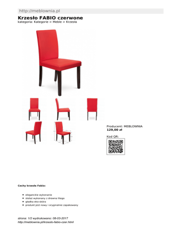 http://meblownia.pl Krzesło FABIO czerwone kategoria: Kategorie > Meble > Krzesła Producent: MEBLOWNIA 129,00 zł Kod QR: Cechy krzesła Fabio: eleganckie wykonanie stelaż wykonany z drewna litego gładka eko-skóra produkt jest nowy i oryginalnie zapakowany strona: 1/2 wydrukowano: 08-03-2017 http://meblownia.pl/krzeslo-fabio-czer.html Wymiary: wysokość: 90 cm wysokość do górnej krawędzi siedziska: 46 cm szerokość: 44 cm głębokość: 55 cm głębokość siedziska: 43 cm Kolorystyka: drewno: wenge eko-skóra: czaerwona strona: 2/2 wydrukowano: 08-03-2017 http://meblownia.pl/krzeslo-fabio-czer.html