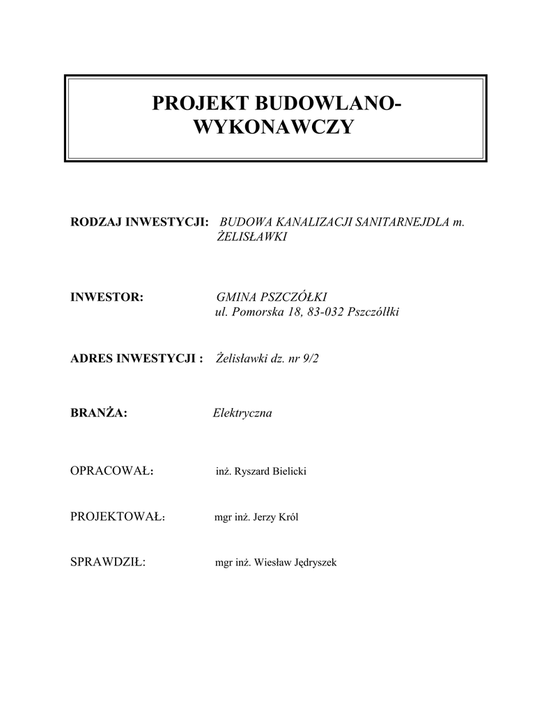 PROJEKT BUDOWLANOWYKONAWCZY RODZAJ INWESTYCJI: BUDOWA KANALIZACJI SANITARNEJDLA m. ŻELISŁAWKI INWESTOR: GMINA PSZCZÓŁKI ul. Pomorska 18, 83-032 Pszczólłki ADRES INWESTYCJI : Żelisławki dz. nr 9/2 BRANŻA: Elektryczna OPRACOWAŁ: inż. Ryszard Bielicki PROJEKTOWAŁ: mgr inż. Jerzy Król SPRAWDZIŁ: mgr inż. Wiesław Jędryszek TCZEW, styczeń 2009 r. SPIS ZAWARTOŚCI PROJEKT INSTALACJI ELEKTRYCZNYCH PRZEPOMPOWNI ŚCIEKÓW P1, w m. ŻELISŁAWKI → STRONA TYTUŁOWA STR. 1 → SPIS ZAWARTOŚCI STR. 2 → OPIS TECHNICZNY STR. 3 → RYSUNKI STR. SPIS RYSUNKÓW: NR TYTUŁ SKALA ZESTAWIEN IE 1:500 - PROJEKT INST. ELEKTRYCZNYCH E-1 E-2 Plan instalacji elektrycznych - przepompownia P1 Schemat ideowy rozdzielnicy R-P1 2 OPIS TECHNICZNY DO PROJEKTU PROJEKT INSTALACJI ELEKTRYCZNYCH PRZEPOMPOWNI ŚCIEKÓW P1 w m. ŻELISŁAWKI SPIS TREŚCI .............................................................................................................................................................1 .........................................................................................................................................................................................1 1. DANE OGÓLNE...........................................................................................................4 1.1 PRZEDMIOT DOKUMENTACJI................................................................................. 4 1.2 ZAKRES OPRACOWANIA.........................................................................................4 1.3 PODSTAWA OPRACOWANIA.................................................................................. 4 1.4 INWESTOR................................................................................................................. 4 2 OPIS TECHNICZNY........................................................................................................5 2.1 ZASILANIE PRZEPOMPOWNI................................................................................... 5 2.2 ROZDZIELNICE STEROWNICZE............................................................................... 5 2.3 OŚWIETLENIE TERENU............................................................................................6 2.4 OCHRONA PRZECIWPORAŻENIOWA.....................................................................6 2.5 UWAGI KOŃCOWE...................................................................................................7 ZAŁĄCZNIK NR 1. OŚWIADCZENIE................................................................................8 ZAŁĄCZNIK NR 2. UPRAWNIENIA PROJEKTANTA. .....................................................9 ZAŁĄCZNIK NR 3. UPRAWNIENIA SPRAWDZAJĄCEGO. ......................................... 10 3 ZAŁĄCZNIK NR 4. ZAŚWIADCZENIE O PRZYNALEŻNOŚCI PROJEKTANTA DO POIIB................................................................................................................................11 ZAŁĄCZNIK NR 5. ZAŚWIADCZENIE O PRZYNALEŻNOŚCI SPRAWDZAJĄCEGO DO POIIB..........................................................................................................................12 INFORMACJA BIOZ .......................................................................................................13 ZEWSTAWIENIE MATERIAŁÓW....................................................................................15 4 1. DANE OGÓLNE 1.1 Przedmiot dokumentacji Przedmiotem dokumentacji jest wykonanie instalacji elektrycznych na terenie przepompowni ścieków P1, w m. Żelisławki. 1.2 Zakres opracowania Niniejsze opracowanie jest projektem przepompownią ścieków P1, w m. Żelisławki. oświetlenia oraz sterowania 1.3 Podstawa opracowania - mapa sytuacyjno-wysokościowa, projekt sieci sanitarnych obowiązujące normy i przepisy, 1.4 Inwestor Gmina Pszczółki, ul. Pomorska 18, 83-032 Pszczółki. 5 2 Opis techniczny 2.1 Zasilanie przepompowni Zasilanie przepompowni będzie się odbywało ze złączy pomiarowych usytuowanych przy ogrodzeniu przepompowni i leży w zakresie Energa-Operator S.A. oddział Gdańsk Zakład Dystrybucji Tczew. Z rozdzielnic sterowniczych poszczególnych przepompowni należy wyprowadzić wewnętrzne linie zasilające zgodnie z załączonymi rysunkami do grani działek oraz pozostawić zapas kabla o długości 5m celem wprowadzenia do złączy pomiarowych zintegrowanych. 2.2 Rozdzielnice sterownicze Rozdzielnice sterownicze przepompowni posadowić na terenie działek zgodnie z rysunkami E-1. Rozdzielnice winny spełniać następujące wymagania techniczne oraz zawierać: - obudowa szafki metalowa z podwójną płytą czołową, stopień ochrony IP 65, wymiar 800x600mm + podstawa metalowa, posadowienie na fundamencie, wyłącznik główny sieć/agregat, zabezpieczenie wszystkich obwodów za pomocą wyłączników różnicowoprądowych o dI=30mA, licznik czasu pracy pomp (manualny), przemienność pracy pomp, niejednoczesność rozruchu pomp, niejednoczesność wyłączania pomp, zabezpieczenie zwarciowe i przeciążeniowe obwodów zabezpieczenie silników pomp przed suchobiegiem, czujnik kolejności i zaniku faz, sygnalizator alarmu: optyczno-akustyczna, podświetlane przyciski sterowania ręcznego, amperomierze, rozruch bezpośredni, możliwość sterowania za pomocą regulatorów pływakowych (4szt) lub sondy hydrostatycznej (sonda + 2 pływaki), szafa sterownicza przystosowana do monitoringu GPRS, ochronę przeciw przepięciową spełniającą wymogi klasy B, C, D, grzałkę z termoregulatorem, gniazdo do podłączenia agregatu prądotwórczego, gniazdo 24V, gniazdo 230V, gniazdo 400V. 6 2.3 Oświetlenie terenu Do oświetlenia terenu działki przepompowni zastosować oprawę np. SSP 090/070 montowane na słupie stalowym SSO 60/45/3p o wysokości 4,5m. Ustawiać ją należy na prefabrykowanych fundamencie FB100 ( betonowym wykonanym metodą wibracyjną , zabezpieczonym przed negatywnym oddziaływaniem warunków atmosferycznych ). Zasilani