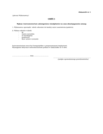 Załącznik nr 1 /pieczęć Wykonawcy/ CZĘŚĆ C Wykaz: instrumentarium udostępnione nieodpłatnie na czas obowiązywania umowy 1. Wykonawca sporządzi tabele odnośnie do kaŜdej części zamówienia (pakietu). 2. Wykaz rubryk w tabeli: lp. nazwa narzędzia nr katalogowy producent ilość sztuk w zestawie Instrumentarium musi być kompatybilne z proponowanymi implantami. Wymagania dotyczące instrumentarium podano w Załączniku nr 5 siwz. ................................... dnia ............................. ........................................................................... /podpis upowaŜnionego przedstawiciela/