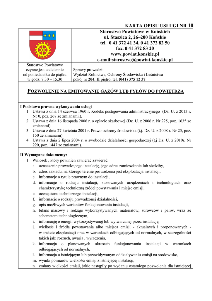 KARTA OPISU USŁUGI NR 10 Starostwo Powiatowe w Końskich ul. Staszica 2, 26–200 Końskie tel. 0 41 372 41 34, 0 41 372 82 50 fax. 0 41 372 83 20 www.powiat.konskie.pl e-mail:[email protected] Starostwo Powiatowe czynne jest codziennie od poniedziałku do piątku w godz. 7.30 – 15.30 Sprawy prowadzi: Wydział Rolnictwa, Ochrony Środowiska i Leśnictwa pokój nr 204, II piętro, tel. (041) 375 12 37 POZWOLENIE NA EMITOWANIE GAZÓW LUB PYŁÓW DO POWIETRZA I Podstawa prawna wykonywania usługi 1. Ustawa z dnia 14 czerwca 1960 r. Kodeks postępowania administracyjnego (Dz. U. z 2013 r. Nr 0, poz. 267 ze zmianami.). 2. Ustawa z dnia 16 listopada 2006 r. o opłacie skarbowej (Dz. U. z 2006 r. Nr 225, poz. 1635 ze zmianami). 3. Ustawa z dnia 27 kwietnia 2001 r. Prawo ochrony środowiska (t.j. Dz. U. z 2008 r. Nr 25, poz. 150 ze zmianami). 4. Ustawa z dnia 2 lipca 2004 r. o swobodzie działalności gospodarczej (t.j Dz. U. z 2010r. Nr 220, poz. 1447 ze zmianami). II Wymagane dokumenty: 1. Wniosek , który powinien zawierać zawierać: a. oznaczenie prowadzącego instalację, jego adres zamieszkania lub siedziby, b. adres zakładu, na którego terenie prowadzona jest eksploatacja instalacji, c. informacje o tytule prawnym do instalacji, d. informacje o rodzaju instalacji, stosowanych urządzeniach i technologiach oraz charakterystykę techniczną źródeł powstawania i miejsc emisji, e. ocenę stanu technicznego instalacji, f. informację o rodzaju prowadzonej działalności, g. opis możliwych wariantów funkcjonowania instalacji, h. bilans masowy i rodzaje wykorzystywanych materiałów, surowców i paliw, wraz ze schematem technologicznym, i. informację o energii wykorzystywanej lub wytwarzanej przez instalację, j. wielkość i źródła powstawania albo miejsca emisji - aktualnych i proponowanych w trakcie eksploatacji oraz w warunkach odbiegających od normalnych, w szczególności takich jak: rozruch, awaria , wyłączenia, k. informacja o planowanych okresach funkcjonowania instalacji w warunkach odbiegających od normalnych, l. informacja o istniejącym lub przewidywanym oddziaływaniu emisji na środowisko, m. wyniki pomiarów wielkości emisji z istniejącej instalacji, n. zmiany wielkości emisji, jakie nastąpiły po wydaniu ostatniego pozwolenia dla istniejącej instalacji, o. planowane działania, w tym przewidywane środki techniczne mające na celu zapobieganie lub ograniczanie emisji, p. proponowane procedury monitorowania procesów technologicznych, w szczególności pomiaru lub ewidencjonowania wielkości emisji, q. przewidywany sposób zakończenia eksploatacji instalacji niestwarzający zagrożenia dla środowiska, r. czas, na jaki wydane ma być pozwolenie. 2. Ponadto do wniosku o wydanie pozwolenia należy dołączyć: a. dokument potwierdzający, że wnioskodawca jest uprawniony do występowania w obrocie prawnym, jeżeli prowadzący instalację nie jest osobą fizyczną, b. wypis i wyrys z miejscowego planu zagospodarowania przestrzennego, jeżeli został sporządzony, oraz decyzję o warunkach zabudowy i zagospodarowania terenu, jeżeli jej uzyskanie było wymagane, c. streszczenie wniosku sporządzone w języku niespecjalistycznym. 3. Jeżeli wniosek dotyczy instalacji nowo uruchamianej lub w sposób istotny zmienionej winien on zawierać informacje o spełnieniu wymagań, przy których określeniu uwzględnia się w szczególności: • stosowanie substancji o małym potencjale zagrożeń, • efektywne wytwarzanie oraz wykorzystanie energii, • zapewnienie racjonalnego zużycia wody i innych surowców oraz materiałów i paliw, • stosowanie technologii bezodpadowych i małoodpadowych oraz możliwość odzysku powstających odpadów, • rodzaj i zasięg emisji, • wykorzystanie porównywalnych procesów i metod, które zostały skutecznie zastosowane w skali przemysłowej, • wykorzystanie analizy cyklu życia produktów, • postęp naukowo - techniczny. 4. Wniosek o wydanie pozwolenia na wprowadzanie gazów lub pyłów do powietrza powinien także zawierać: • czas pracy źródeł powstawania i miejsc wprowadzania gazów lub pyłów do powietrza w ciągu roku, • określenie wprowadzanych do powietrza rodzajów i ilości gazów lub pyłów do powietrza na jednostkę wykorzystywanego surowca, materiału, paliwa lub powstającego produktu, • opis terenu w zasięgu pięćdziesięciokrotnej wysokości najwyższego miejsca wprowadzania gazów lub pyłów do powietrza, z uwzględnieniem obszarów poddanych na podstawie przepisów o ochronie przyrody oraz ustawy o uzdrowiskach i lecznictwie uzdrowiskowym, • określenie aerodynamicznej szorstkości terenu, • aktualny stan jakości powietrza, • określenie warunków meteorologicznych, • graficzne przedstawienie wyników obliczeń stanu jakości powietrza, z uwzględnieniem referencyjnych metodyk modelowania. oraz odpowiednio do ww. wymogów: • określenie wielkości emisji gazów lub pyłów wprowadzanych do powietrza, wyrażonej w mg/m3 gazów odlotowych w stanie suchym w temperaturze 273 K i ciśnieniu 101,3 kPa, a także w kg/h oraz w Mg/rok, • wskazanie stanowisk do pomiaru wielkości emisji w zakresie gazów lub pyłów wprowadzanych do powietrza oraz proponowany zakres, metodykę i sposób wykonywania tych pomiarów. 5. Dowód zapłaty należnej opłaty skarbowej. III Miejsce składania dokumentów: Kancelaria Starostwa Powiatowego w Końskich. IV Opłaty: Obowiązek zapłaty opłaty skarbowej powstaje z chwilą złożenia wniosku o wydanie decyzji. 1. Opłata skarbowa za wydanie pozwolenia: a. 2011 zł - w związku z prowadzoną działalnością gospodarczą, z zastrzeżeniem pkt b, b. 506 zł - w związku z działalnością gospodarczą prowadzoną przez podmioty prowadzące działalność wytwórczą w rolnictwie, mikroprzedsiębiorców oraz małych i średnich przedsiębiorców, c. 506 zł - pozostałe. 2. Opłata skarbowa za wydanie pozwolenia na wprowadzanie gazów i pyłów do powie