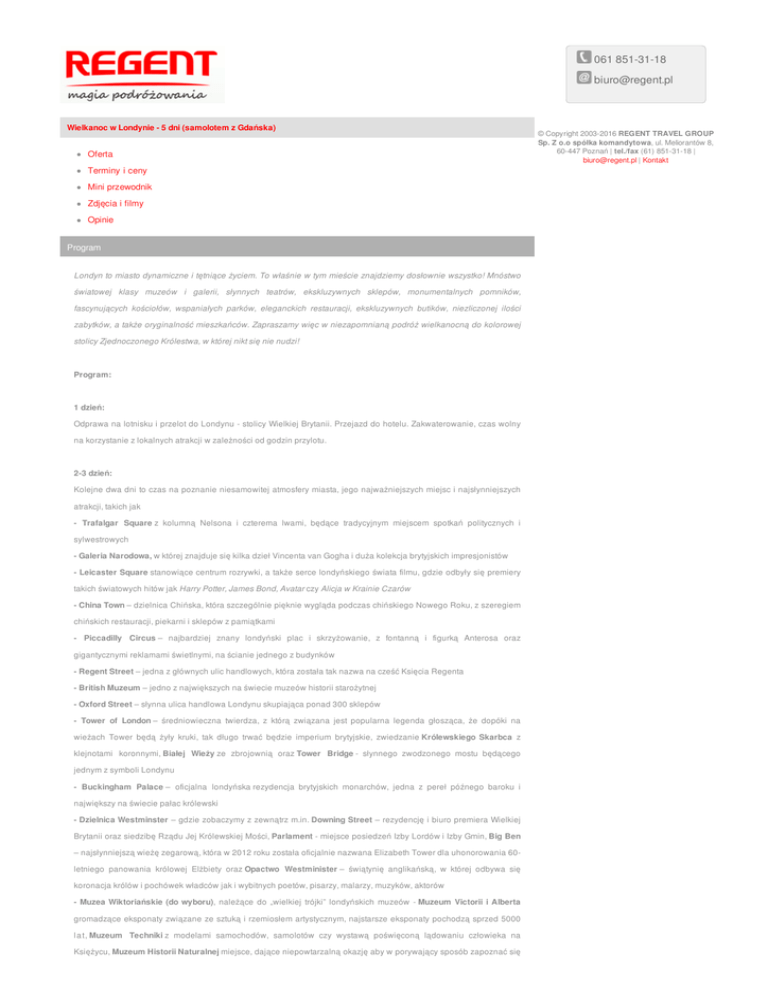 061 851-31-18 [email protected] Wielkanoc w Londynie - 5 dni (samolotem z Gdańska) Oferta Terminy i ceny Mini przewodnik Zdjęcia i filmy Opinie Program Londyn to miasto dynamiczne i tętniące życiem. To właśnie w tym mieście znajdziemy dosłownie wszystko! Mnóstwo światowej klasy muzeów i galerii, słynnych teatrów, ekskluzywnych sklepów, monumentalnych pomników, fascynujących kościołów, wspaniałych parków, eleganckich restauracji, ekskluzywnych butików, niezliczonej ilości zabytków, a także oryginalność mieszkańców. Zapraszamy więc w niezapomnianą podróż wielkanocną do kolorowej stolicy Zjednoczonego Królestwa, w której nikt się nie nudzi! Program: 1 dzień: Odprawa na lotnisku i przelot do Londynu - stolicy Wielkiej Brytanii. Przejazd do hotelu. Zakwaterowanie, czas wolny na korzystanie z lokalnych atrakcji w zależności od godzin przylotu. 2-3 dzień: Kolejne dwa dni to czas na poznanie niesamowitej atmosfery miasta, jego najważniejszych miejsc i najsłynniejszych atrakcji, takich jak - Trafalgar Square z kolumną Nelsona i czterema lwami, będące tradycyjnym miejscem spotkań politycznych i sylwestrowych - Galeria Narodowa, w której znajduje się kilka dzieł Vincenta van Gogha i duża kolekcja brytyjskich impresjonistów - Leicaster Square stanowiące centrum rozrywki, a także serce londyńskiego świata filmu, gdzie odbyły się premiery takich światowych hitów jak Harry Potter, James Bond, Avatar czy Alicja w Krainie Czarów - China Town – dzielnica Chińska, która szczególnie pięknie wygląda podczas chińskiego Nowego Roku, z szeregiem chińskich restauracji, piekarni i sklepów z pamiątkami - Piccadilly Circus – najbardziej znany londyński plac i skrzyżowanie, z fontanną i figurką Anterosa oraz gigantycznymi reklamami świetlnymi, na ścianie jednego z budynków - Regent Street – jedna z głównych ulic handlowych, która została tak nazwa na cześć Księcia Regenta - British Muzeum – jedno z największych na świecie muzeów historii starożytnej - Oxford Street – słynna ulica handlowa Londynu skupiająca ponad 300 sklepów - Tower of London – średniowieczna twierdza, z którą związana jest popularna legenda głosząca, że dopóki na wieżach Tower będą żyły kruki, tak długo trwać będzie imperium brytyjskie, zwiedzanie Królewskiego Skarbca z klejnotami koronnymi, Białej Wieży ze zbrojownią oraz Tower Bridge - słynnego zwodzonego mostu będącego jednym z symboli Londynu - Buckingham Palace – oficjalna londyńska rezydencja brytyjskich monarchów, jedna z pereł późnego baroku i największy na świecie pałac królewski - Dzielnica Westminster – gdzie zobaczymy z zewnątrz m.in. Downing Street – rezydencję i biuro premiera Wielkiej Brytanii oraz siedzibę Rządu Jej Królewskiej Mości, Parlament - miejsce posiedzeń Izby Lordów i Izby Gmin, Big Ben – najsłynniejszą wieżę zegarową, która w 2012 roku została oficjalnie nazwana Elizabeth Tower dla uhonorowania 60letniego panowania królowej Elżbiety oraz Opactwo Westminister – świątynię anglikańską, w której odbywa się koronacja królów i pochówek władców jak i wybitnych poetów, pisarzy, malarzy, muzyków, aktorów - Muzea Wiktoriańskie (do wyboru), należące do „wielkiej trójki” londyńskich muzeów - Muzeum Victorii i Alberta gromadzące eksponaty związane ze sztuką i rzemiosłem artystycznym, najstarsze eksponaty pochodzą sprzed 5000 l a t, Muzeum Techniki z modelami samochodów, samolotów czy wystawą poświęconą lądowaniu człowieka na Księżycu, Muzeum Historii Naturalnej miejsce, dające niepowtarzalną okazję aby w porywający sposób zapoznać się © Copyright 2003-2016 REGENT TRAVEL GROUP Sp. Z o.o spółka komandytowa, ul. Meliorantów 8, 60-447 Poznań | tel./fax (61) 851-31-18 | [email protected] | Kontakt z życiem i funkcjonowaniem organizmów zamieszkujących Ziemię. Każdy z pewnością będzie zachwycony poruszającymi się dinozaurami, czy też modelami zwierząt, zachowującymi ich oryginalne rozmiary (gigantyczny płetwal błękitny, żyrafa, itd.) W przerwach podczas zwiedzania proponujemy czas wolny na posiłek, podczas którego będzie możliwość spróbowania angielskich potraw, takich jak Fish and chips, słynny pudding, tradycyjne Apple Pie, czy Trifle (płatne indywidualnie wg zamówienia). Londyn proponuje także wiele innych ciekawych atrakcji, z których można skorzystać fakultatywnie w zależności od czasu wolnego: - Maundy Thursday - Obchody Wielkiego Czwartku - w przeszłości monarcha obmywał nogi pewnej grupie ubogich, naśladując w ten sposób Jezusa, królowa bierze udział w ceremonii Royal Maundy, w trakcie której zasłużeni mężczyźni i kobiety (po jednym na każdy rok życia monarchini) otrzymują czerwone i białe portfeliki ze specjalnie na tę okazję wybijanymi monetami w nagrodę za służbę społeczeństwu. - Wielkanocna Parada – w czasie świąt Wielkanocnych w dzielnicy Battersea w Londynie odbywa się taneczna parada ''morris dance'', czyli folklorystyczne tańce, których korzenie sięgają średniowiecza - Kew Gardens – królewskie ogrody botaniczne, gdzie znajduję się największa kolekcja żywych roślin na świecie (ok. 17 GBP/os.) - Londyńskie Zoo – będące najstarszym ogrodem zoologicznym na świecie, bogactwo i różnorodność gatunków zwierząt zachwycą każdego (ok. 26 GBP/os.) - Madame Tussauds – muzeum figur woskowych, prezentujące naturalnej wielkości figury znanych ludzi, m.in. gwiazd sportu, muzyki czy filmu (ok. 35 GBP/os.) - Katedra Świętego Pawła – jeden z najbardziej znanych kościołów anglikańskich w Wielkiej Brytanii z popularnymi galeriami - Stone Gallery, z której rozpościera się rozległy widok na zakole Tamizy oraz Galerią Szeptów znaną ze świetnej akustyki, umożliwiającej porozumiewanie się szeptem z odległości 30 m (ok. 18 GBP/os.) - London Eye – największe na świecie koł