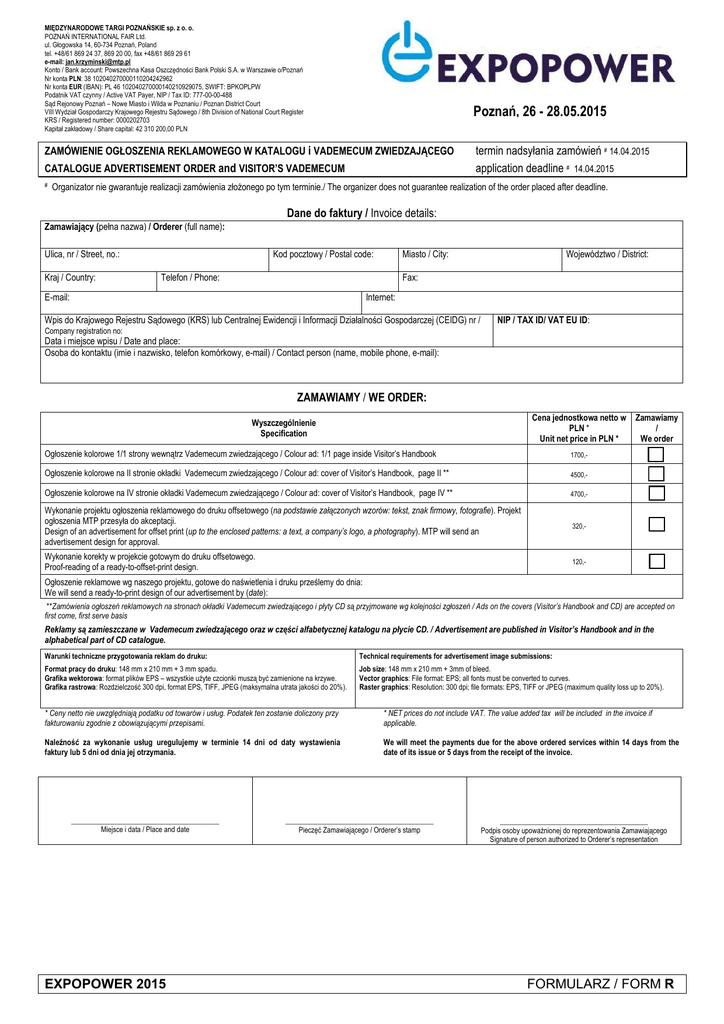MIĘDZYNARODOWE TARGI POZNAŃSKIE sp. z o. o. POZNAŃ INTERNATIONAL FAIR Ltd. ul. Głogowska 14, 60-734 Poznań, Poland tel. +48/61 869 24 37, 869 20 00, fax +48/61 869 29 61 e-mail: [email protected] Konto / Bank account: Powszechna Kasa Oszczędności Bank Polski S.A. w Warszawie o/Poznań Nr konta PLN: 38 102040270000110204242962 Nr konta EUR (IBAN): PL 46 102040270000140210929075, SWIFT: BPKOPLPW Podatnik VAT czynny / Active VAT Payer, NIP / Tax ID: 777-00-00-488 Sąd Rejonowy Poznań – Nowe Miasto i Wilda w Poznaniu / Poznan District Court VIII Wydział Gospodarczy Krajowego Rejestru Sądowego / 8th Division of National Court Register KRS / Registered number: 0000202703 Kapitał zakładowy / Share capital: 42 310 200,00 PLN Poznań, 26 - 28.05.2015 ZAMÓWIENIE OGŁOSZENIA REKLAMOWEGO W KATALOGU i VADEMECUM ZWIEDZAJĄCEGO CATALOGUE ADVERTISEMENT ORDER and VISITOR’S VADEMECUM # termin nadsyłania zamówień # 14.04.2015 application deadline # 14.04.2015 Organizator nie gwarantuje realizacji zamówienia złożonego po tym terminie./ The organizer does not guarantee realization of the order placed after deadline. Dane do faktury / Invoice details: Zamawiający (pełna nazwa) / Orderer (full name): Ulica, nr / Street, no.: Kraj / Country: Kod pocztowy / Postal code: Miasto / City: Telefon / Phone: Województwo / District: Fax: E-mail: Internet: Wpis do Krajowego Rejestru Sądowego (KRS) lub Centralnej Ewidencji i Informacji Działalności Gospodarczej (CEIDG) nr / NIP / TAX ID/ VAT EU ID: Company registration no: Data i miejsce wpisu / Date and place: Osoba do kontaktu (imie i nazwisko, telefon komórkowy, e-mail) / Contact person (name, mobile phone, e-mail): ZAMAWIAMY / WE ORDER: Cena jednostkowa netto w PLN * Unit net price in PLN * Wyszczególnienie Specification Zamawiamy / We order Ogłoszenie kolorowe 1/1 strony wewnątrz Vademecum zwiedzającego / Colour ad: 1/1 page inside Visitor’s Handbook 1700,- Ogłoszenie kolorowe na II stronie okładki Vademecum zwiedzającego / Colour ad: cover of Visitor’s Handbook, page II ** 4500,- Ogłoszenie kolorowe na IV stronie okładki Vademecum zwiedzającego / Colour ad: cover of Visitor’s Handbook, page IV ** 4700,- Wykonanie projektu ogłoszenia reklamowego do druku offsetowego (na podstawie załączonych wzorów: tekst, znak firmowy, fotografie). Projekt ogłoszenia MTP przesyła do akceptacji. Design of an advertisement for offset print (up to the enclosed patterns: a text, a company’s logo, a photography). MTP will send an advertisement design for approval. 320,- Wykonanie korekty w projekcie gotowym do druku offsetowego. Proof-reading of a ready-to-offset-print design. 120,- Ogłoszenie reklamowe wg naszego projektu, gotowe do naświetlenia i druku prześlemy do dnia: We will send a ready-to-print design of our advertisement by (date): **Zamówienia ogłoszeń reklamowych na stronach okładki Vademecum zwiedzającego i płyty CD są przyjmowane wg kolejności zgłoszeń / Ads on the covers (Visitor’s Handbook and CD) are accepted on first come, first serve basis Reklamy są zamieszczane w Vademecum zwiedzającego oraz w części alfabetycznej katalogu na płycie CD. / Advertisement are published in Visitor’s Handbook and in the alphabetical part of CD catalogue. Warunki techniczne przygotowania reklam do druku: Technical requirements for advertisement image submissions: Format pracy do druku: 148 mm x 210 mm + 3 mm spadu. Grafika wektorowa: format plików EPS – wszystkie użyte czcionki muszą być zamienione na krzywe. Grafika rastrowa: Rozdzielczość 300 dpi, format EPS, TIFF, JPEG (maksymalna utrata jakości do 20%). Job size: 148 mm x 210 mm + 3mm of bleed. Vector graphics: File format: EPS; all fonts must be converted to curves. Raster graphics: Resolution: 300 dpi; file formats: EPS, TIFF or JPEG (maximum quality loss up to 20%). * Ceny netto nie uwzględniają podatku od towarów i usług. Podatek ten zostanie doliczony przy fakturowaniu zgodnie z obowiązującymi przepisami. * NET prices do not include VAT. The value added tax will be included in the invoice if applicable. Należność za wykonanie usług uregulujemy w terminie 14 dni od daty wystawienia faktury lub 5 dni od dnia jej otrzymania. We will meet the payments due for the above ordered services within 14 days from the date of its issue or 5 days from the receipt of the invoice. _________________________________________ Miejsce i data / Place and date EXPOPOWER 2015 _________________________________________ Pieczęć Zamawiającego / Orderer’s stamp _________________________________________ Podpis osoby upoważnionej do reprezentowania Zamawiającego Signature of person authorized to Orderer’s representation FORMULARZ / FORM R
