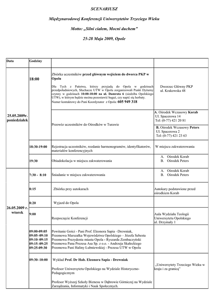 SCENARIUSZ Międzynarodowej Konferencji Uniwersytetów Trzeciego Wieku Motto: „Silni ciałem, Mocni duchem” 25-28 Maja 2009, Opole Data Godziny 18:00 Zbiórka uczestników przed głównym wejściem do dworca PKP w Opolu Dla Tych z Państwa, którzy przyjadą do Opola w godzinach przedpołudniowych, Słuchacze UTW w Opolu zorganizowali Punkt DyŜurny czynny w godzinach 10:00-18:00 na ul. Damrota 6 (siedziba Opolskiego UTW), w którym będzie moŜna pozostawić bagaŜ, czy napić się herbaty. Numer kontaktowy do Pani Koordynator z Opola: 605 949 318 Dworzec Główny PKP ul. Krakowska 48 A. Ośrodek Wczasowy Korab Ul. Spacerowa 14 Tel: (0-77) 421 20 81 25.05.2009r. poniedziałek Przewóz uczestników do Ośrodków w Turawie B. Ośrodek Wczasowy Peters Ul. Spacerowa 2 Tel: (0-77) 421 23 63 18:30-19:00 Rejestracja uczestników, rozdanie harmonogramów, identyfikatorów, materiałów konferencyjnych 19:30 Obiadokolacja w miejscu zakwaterowania A. Ośrodek Korab B. Ośrodek Peters 7:30 - 8:10 Śniadanie w miejscu zakwaterowania A. Ośrodek Korab B. Ośrodek Peters 8:15 Zbiórka przy autokarach 8:20 Wyjazd do Opola 26.05.2009 r. wtorek 9:00 Rozpoczęcie Konferencji 09:00-09:05 09:05–09:10 09:10–09:15 09:15–09:25 09:25-09:30 Powitanie Gości - Pani Prof. Eleonora Sapia –Drewniak, Przemowa Marszałka Województwa Opolskiego – Józefa Sebesta Przemowa Prezydenta miasta Opola - Ryszarda Zembaczyński Przemowa Pana Prezesa Asa Sp. z o.o. - Andrzeja Skałeckiego Przemowa Pani Haliny Łubniewskiej - Prezesa UTW w Opolu 09:30–10:00 Wykład Prof. Dr Hab. Eleonora Sapia - Drewniak Profesor Uniwersytetu Opolskiego na Wydziale HistorycznoPedagogicznym Profesor WyŜszej Szkoły Biznesu w Dąbrowie Górniczej na Wydziale Zarządzania, Informatyki i Nauk Społecznych. W miejscu zakwaterowania Autokary podstawione przed ośrodkiem Korab Aula Wydziału Teologii Uniwersytetu Opolskiego ul. Drzymały 1 „Uniwersytety Trzeciego Wieku w kraju i za granicą” 10:00–11:15 Wykład Dr Małgorzata Mulak „Wzrok w wieku starszym – Specjalista w Klinice Okulistyki Akademii Medycznej we Wrocławiu najczęstsze zagadnienia w praktyce ” 11:15-12:15 Przerwa na kawę 12:15-13:30 Wykład lek. Med. Maria Wojtczak, + pytania z Sali Specjalista chorób wewnętrznych (II stopień specjalizacji), emerytowany Ordynator oddziału wewnętrznego Szpitala Rejonowego w Grodkowie WspółzałoŜycielka i opiekunka medyczna Koła Polskiego Stowarzyszenia Diabetyków w Brzegu 26.05.2009r. wtorek 13:30-14:45 Wykład Dr Justyna Śliwińska Ordynator Oddziału Reumatologii Szpitala Uzdrowiskowego Kompleksowej Rehabilitacji w Busku Zdroju 15:00 Powrót do Turawy 16:30 Obiadokolacja w miejscu zakwaterowania + suchy prowiant na wieczór Kawa, herbata, ciasto „Cukrzyca typu 2 – choroba ludzi wieku dojrzałego” „Choroby zwyrodnieniowe stawów – czy moŜna z nimi Ŝyć, jak o siebie dbać?” Autokary podstawione przed Uniwersytetem Opolskim A. Ośrodek Korab 19:00 Wyjazd do Opola na koncert B. Ośrodek Peters Autokary podstawione przed ośrodkiem Korab 19:40 - 20:00 Powitanie uczestników Zjazdu UTW przez Pana Ryszarda Kruka -doradcę Polsko-Amerykańskiego Funduszu Przedsiębiorczości Uroczysty koncert w Auli Wydziału Teologicznego Uniwersytetu Opolskiego: Występ: • Zespół Komorno • Chór Legenda • Recital Fortepianowy Sala Koncertowa Państwowej Szkoły Muzycznej I i II stopnia i. Fryderyka Chopina 22:30 Powrót do Turawy Autokar podstawiony przed Wydziałem Teologii Uniwersytetu Opolskiego 7:30-8.10 Śniadanie w miejscu zakwaterowania A. Ośrodek Korab B. Ośrodek Peters 8:15 Zbiórka przy autokarach Autokary podstawione przed ośrodkiem Korab 8:20 Wyjazd do Opola 20:00–22.00 27.05.2009r 9:00 środa 09:00-09:30 Ul. Strzelców Opolskich 18 Konferencja Aula Wydziału Teologii Uniwersytetu Opolskiego ul. Drzymały 1 Wykład Prof. Dr. Hab. Stanisława Rogala Specjalista w Zakładzie Wpływu Społecznego w WyŜszej Szkole Zarządzania i Administracji w Opolu Psychologiczne aspekty starzenia się człowieka” 09:30-10:00 Wykład Dr. Dawida Bączkowicza Doktor Instytut Fizjoterapii, Wydział Wychowania Fizycznego i Fizjoterapii Politechniki Opolskiej „Dysfunkcje narządu ruchu oraz sposoby jego leczenia” 10:00-11:00 Wykład Prof. Dr. Hab. Med. Aleksander Skotnicki Katedra i Klinika Hematologii Collegium Medium Uniwersytetu Jagiellońskiego „Prawda w medycynie”- relacje lekarz - pacjent „ 11:00-12:00 Wykład Dr Maciej Lis „Dyskryminacja osób starszych w Pełnomocnik Rzecznika Praw Obywatelskich w Wydziału terenowego społeczeństwie” we Wrocławiu 12:00-13:00 Przerwa Kawowa 13: 00–13:40 Bogusława Potoniec Koordynator Projektu Fundacja dla Uniwersytetu Jagiellońskiego Kawa, herbata, ciasto Zapowiedź nowego programu ”Letnia Akademia Seniora” 13:40 – 14:30 Wykład Dorota Piechowicz "Metoda edukacyjna dla osób po 50 roku Ŝycia - na podstawie Akademii Członek Zarządu Opolskiego Forum Organizacji Socjalnych „OFOS ” e -Seniora UPC" partnera UPC w Akademii E -Seniora Opolskiego oddziału UPC 27. 05.2009r środa 14:35 Powrót do Turawy Autokar podstawiony przed Wydziałem Teologii Uniwersytetu Opolskiego 15:10-16:00 Obiad w miejscu zakwaterowania A. Ośrodek Korab B. Ośrodek Peters 16:30- 18:30 Dwa Panele Dyskusyjne do wyboru: 1) 2) Warsztaty MNEMOTECHNIK - czyli jak ćwiczyć pamięć, aby mimo Prowadzący: Magdalena Kusy upływu lat niczego juŜ nie zapomnieć. Szkolenie z zakresu sposobów ułatwiających zapamiętanie, Instytut Psychologii, przechowywanie i przypominanie sobie informacji. Wydział Filozoficzny Uniwersytetu Jagiellońskiego Panel dyskusyjny n/t działalności poszczególnych UTW, wymiana Prowadzący: Weronika Wąchała doświadczeń, omówienie strategii organizacyjnych potrzebnych do Kamila Nowaczek właściwego funkcjonowania Uniwersytetów Trzeciego Wieku. Wydział Prawa i Administracji Uniwersytetu Jagiellońskiego „Szlachetne zdrowie, nikt się nie dowie