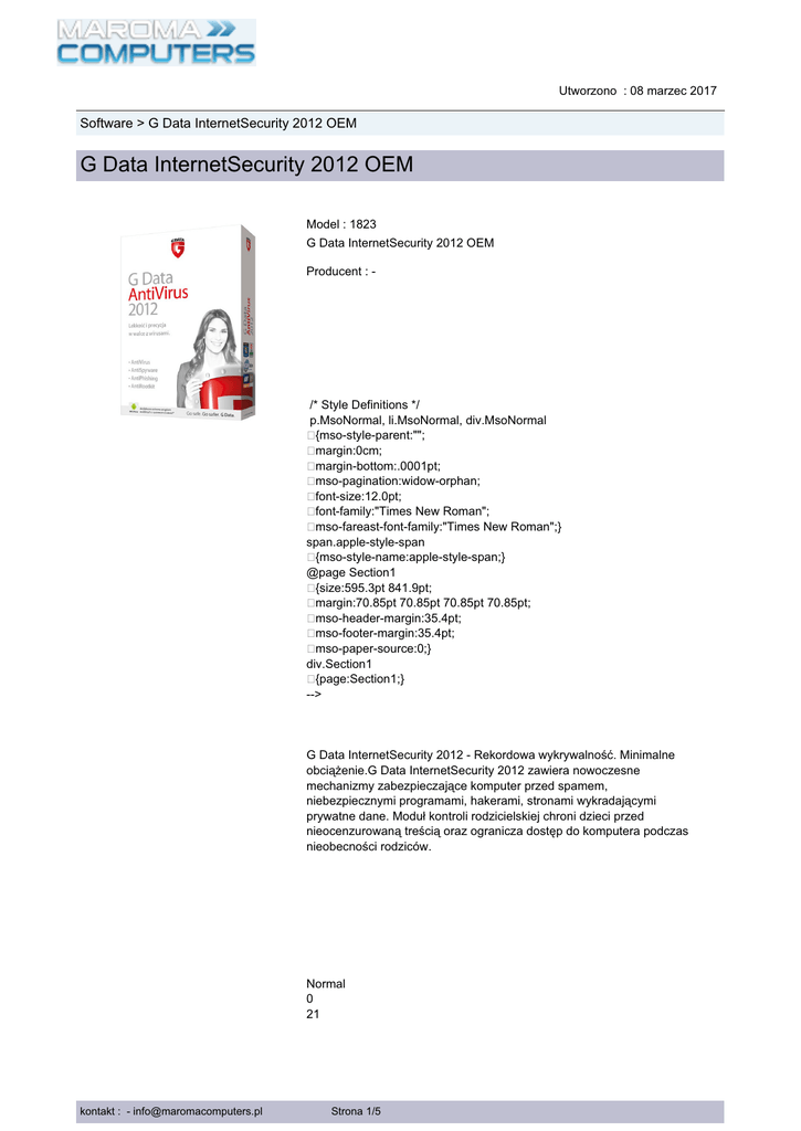 Utworzono : 08 marzec 2017 Software > G Data InternetSecurity 2012 OEM G Data InternetSecurity 2012 OEM Model : 1823 G Data InternetSecurity 2012 OEM s r te Producent : - C a m ro a M m o G Data InternetSecurity 2012 - Rekordowa wykrywalność. Minimalne obciążenie.G Data InternetSecurity 2012 zawiera nowoczesne mechanizmy zabezpieczające komputer przed spamem, niebezpiecznymi programami, hakerami, stronami wykradającymi prywatne dane. Moduł kontroli rodzicielskiej chroni dzieci przed nieocenzurowaną treścią oraz ogranicza dostęp do komputera podczas nieobecności rodziców. Normal 0 21 kontakt : - [email protected] u p /* Style Definitions */ p.MsoNormal, li.MsoNormal, div.MsoNormal {mso-style-parent:""; margin:0cm; margin-bottom:.0001pt; mso-pagination:widow-orphan; font-size:12.0pt; font-family:"Times New Roman"; mso-fareast-font-family:"Times New Roman";} span.apple-style-span {mso-style-name:apple-style-span;} @page Section1 {size:595.3pt 841.9pt; margin:70.85pt 70.85pt 70.85pt 70.85pt; mso-header-margin:35.4pt; mso-footer-margin:35.4pt; mso-paper-source:0;} div.Section1 {page:Section1;} --> Strona 1/5 Utworzono : 08 marzec 2017 Software > G Data InternetSecurity 2012 OEM G Data InternetSecurity 2012 OEM false false false MicrosoftInternetExplorer4 u p m ro a M kontakt : - [email protected] m o /* Style Definitions */ p.MsoNormal, li.MsoNormal, div.MsoNormal {mso-style-parent:""; margin:0cm; margin-bottom:.0001pt; mso-pagination:widow-orphan; font-size:12.0pt; font-family:"Times New Roman"; mso-fareast-font-family:"Times New Roman";} @page Section1 {size:595.3pt 841.9pt; margin:70.85pt 70.85pt 70.85pt 70.85pt; mso-header-margin:35.4pt; mso-footer-margin:35.4pt; mso-paper-source:0;} div.Section1 {page:Section1;} --> C a /* Style Definitions */ table.MsoNormalTable {mso-style-name:Standardowy; mso-tstyle-rowband-size:0; mso-tstyle-colband-size:0; mso-style-noshow:yes; mso-style-parent:""; mso-padding-alt:0cm 5.4pt 0cm 5.4pt; mso-para-margin:0cm; mso-para-margin-bottom:.0001pt; mso-pagination:widow-orphan; font-size:10.0pt; font-family:"Times New Roman"; mso-ansi-language:#0400; mso-fareast-language:#0400; mso-bidi-language:#0400;} Strona 2/5 s r te Utworzono : 08 marzec 2017 Software > G Data InternetSecurity 2012 OEM G Data InternetSecurity 2012 OEM Funkcje • Skuteczna ochrona przed wirusami, trojanami, rootkitami, spyware • Szybkie skanowanie plików - Fingerprinting i ParallelScan • Unikatowa technologia 2 skanerów antywirusowych - DoubleScan • Sprawdzanie zawartości danych HTTP - dodawanie wyjątków • Cichy tryb pracy - Silent Firewall • Niespotykana skuteczność rozpoznawania i eparacji spamu • Nadzór nad dostępem dziecka do komputera • Blokowanie stron o nieocenzurowanej treści • Rozpoznawanie spamu w 10 różnych językach u p s r te Nowości • OneClick - wszystkie najważniejsze funkcje w oknie głównym • Cichy firewall bez irytujących i wyskakujących komunikatów • Automatyczne wykonywanie wszystkich funkcji ochronnych w tle • Dynamiczne zakładki C a m ro a M m o Normal 0 21 false false false MicrosoftInternetExplorer4 /* Style Definitions */ p.MsoNormal, li.MsoNormal, div.MsoNormal {mso-style-parent:""; margin:0cm; margin-bottom:.0001pt; mso-pagination:widow-orphan; kontakt : - [email protected] Strona 3/5 Utworzono : 08 marzec 2017 Software > G Data InternetSecurity 2012 OEM G Data InternetSecurity 2012 OEM font-size:12.0pt; font-family:"Times New Roman"; mso-fareast-font-family:"Times New Roman";} @page Section1 {size:595.3pt 841.9pt; margin:70.85pt 70.85pt 70.85pt 70.85pt; mso-header-margin:35.4pt; mso-footer-margin:35.4pt; mso-paper-source:0;} div.Section1 {page:Section1;} --> C a m ro a M kontakt : - [email protected] u p m o /* Style Definitions */ table.MsoNormalTable {mso-style-name:Standardowy; mso-tstyle-rowband-size:0; mso-tstyle-colband-size:0; mso-style-noshow:yes; mso-style-parent:""; mso-padding-alt:0cm 5.4pt 0cm 5.4pt; mso-para-margin:0cm; mso-para-margin-bottom:.0001pt; mso-pagination:widow-orphan; font-size:10.0pt; font-family:"Times New Roman"; mso-ansi-language:#0400; mso-fareast-language:#0400; mso-bidi-language:#0400;} Wymagania programu: Windows 7, Vista, XP z SP2 (wersje 32/64-bit), 512 MB RAM UWAGA! Program dostępny wyłącznie przy zakupie komputera. Strona 4/5 s r te Utworzono : 08 marzec 2017 Software > G Data InternetSecurity 2012 OEM G Data InternetSecurity 2012 OEM Cena : 69,00 zł Brutto ( 56,56 zł Netto) C a m o Dostępność: Produkt dostępny w naszym sklepie od 11 październik 2010 m ro a M kontakt : - [email protected] Strona 5/5 u p s r te