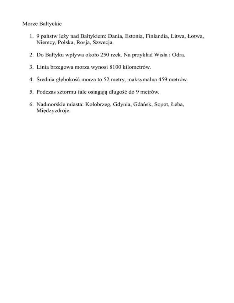 Morze Bałtyckie 1. 9 państw leży nad Bałtykiem: Dania, Estonia, Finlandia, Litwa, Łotwa, Niemcy, Polska, Rosja, Szwecja. 2. Do Bałtyku wpływa około 250 rzek. Na przykład Wisła i Odra. 3. Linia brzegowa morza wynosi 8100 kilometrów. 4. Średnia głębokość morza to 52 metry, maksymalna 459 metrów. 5. Podczas sztormu fale osiagają długość do 9 metrów. 6. Nadmorskie miasta: Kołobrzeg, Gdynia, Gdańsk, Sopot, Łeba, Międzyzdroje.