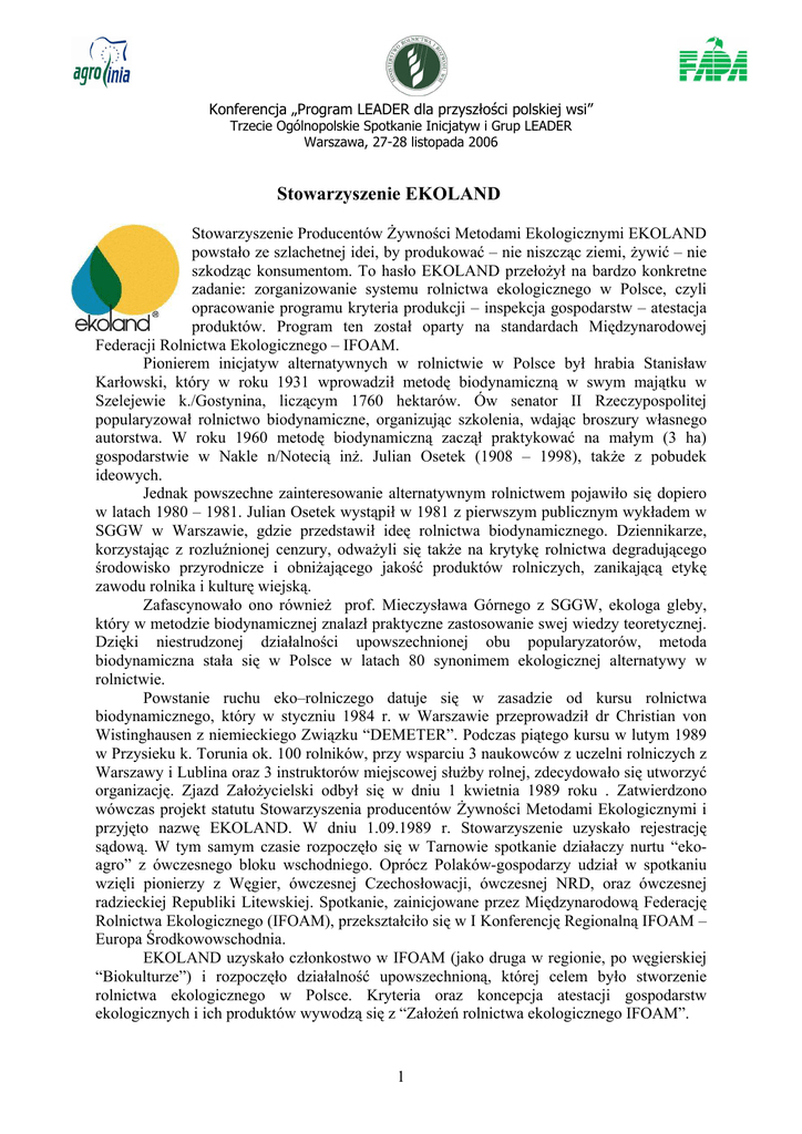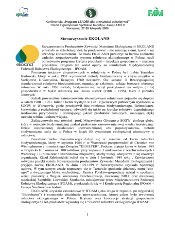 Konferencja „Program LEADER dla przyszłości polskiej wsi” Trzecie Ogólnopolskie Spotkanie Inicjatyw i Grup LEADER Warszawa, 27-28 listopada 2006 Stowarzyszenie EKOLAND Stowarzyszenie Producentów Żywności Metodami Ekologicznymi EKOLAND powstało ze szlachetnej idei, by produkować – nie niszcząc ziemi, żywić – nie szkodząc konsumentom. To hasło EKOLAND przełożył na bardzo konkretne zadanie: zorganizowanie systemu rolnictwa ekologicznego w Polsce, czyli opracowanie programu kryteria produkcji – inspekcja gospodarstw – atestacja produktów. Program ten został oparty na standardach Międzynarodowej Federacji Rolnictwa Ekologicznego – IFOAM. Pionierem inicjatyw alternatywnych w rolnictwie w Polsce był hrabia Stanisław Karłowski, który w roku 1931 wprowadził metodę biodynamiczną w swym majątku w Szelejewie k./Gostynina, liczącym 1760 hektarów. Ów senator II Rzeczypospolitej popularyzował rolnictwo biodynamiczne, organizując szkolenia, wdając broszury własnego autorstwa. W roku 1960 metodę biodynamiczną zaczął praktykować na małym (3 ha) gospodarstwie w Nakle n/Notecią inż. Julian Osetek (1908 – 1998), także z pobudek ideowych. Jednak powszechne zainteresowanie alternatywnym rolnictwem pojawiło się dopiero w latach 1980 – 1981. Julian Osetek wystąpił w 1981 z pierwszym publicznym wykładem w SGGW w Warszawie, gdzie przedstawił ideę rolnictwa biodynamicznego. Dziennikarze, korzystając z rozluźnionej cenzury, odważyli się także na krytykę rolnictwa degradującego środowisko przyrodnicze i obniżającego jakość produktów rolniczych, zanikającą etykę zawodu rolnika i kulturę wiejską. Zafascynowało ono również prof. Mieczysława Górnego z SGGW, ekologa gleby, który w metodzie biodynamicznej znalazł praktyczne zastosowanie swej wiedzy teoretycznej. Dzięki niestrudzonej działalności upowszechnionej obu popularyzatorów, metoda biodynamiczna stała się w Polsce w latach 80 synonimem ekologicznej alternatywy w rolnictwie. Powstanie ruchu eko–rolniczego datuje się w zasadzie od kursu rolnictwa biodynamicznego, który w styczniu 1984 r. w Warszawie przeprowadził dr Christian von Wistinghausen z niemieckiego Związku “DEMETER”. Podczas piątego kursu w lutym 1989 w Przysieku k. Torunia ok. 100 rolników, przy wsparciu 3 naukowców z uczelni rolniczych z Warszawy i Lublina oraz 3 instruktorów miejscowej służby rolnej, zdecydowało się utworzyć organizację. Zjazd Założycielski odbył się w dniu 1 kwietnia 1989 roku . Zatwierdzono wówczas projekt statutu Stowarzyszenia producentów Żywności Metodami Ekologicznymi i przyjęto nazwę EKOLAND. W dniu 1.09.1989 r. Stowarzyszenie uzyskało rejestrację sądową. W tym samym czasie rozpoczęło się w Tarnowie spotkanie działaczy nurtu “ekoagro” z ówczesnego bloku wschodniego. Oprócz Polaków-gospodarzy udział w spotkaniu wzięli pionierzy z Węgier, ówczesnej Czechosłowacji, ówczesnej NRD, oraz ówczesnej radzieckiej Republiki Litewskiej. Spotkanie, zainicjowane przez Międzynarodową Federację Rolnictwa Ekologicznego (IFOAM), przekształciło się w I Konferencję Regionalną IFOAM – Europa Środkowowschodnia. EKOLAND uzyskało członkostwo w IFOAM (jako druga w regionie, po węgierskiej “Biokulturze”) i rozpoczęło działalność upowszechnioną, której celem było stworzenie rolnictwa ekologicznego w Polsce. Kryteria oraz koncepcja atestacji gospodarstw ekologicznych i ich produktów wywodzą się z “Założeń rolnictwa ekologicznego IFOAM”. 1 Konferencja „Program LEADER dla przyszłości polskiej wsi” Trzecie Ogólnopolskie Spotkanie Inicjatyw i Grup LEADER Warszawa, 27-28 listopada 2006 Własne kryteria rolnictwa ekologicznego Stowarzyszenia EKOLAND zostały opublikowane w 1994 roku. Stowarzyszenie EKOLAND może poszczycić się wprowadzeniem rolnictwa ekologicznego – jako zbioru kryteriów i jako systemu organizacyjnego – do życia publicznego w Polsce. Działalność kluczowa dla wizerunku Stowarzyszenia: inspekcja i atestacja gospodarstw, były prowadzone po kosztach własnych. Pomocnym rozwiązaniem było więc uzyskanie funduszy na projekty, dotyczące upowszechniania, szkolenia i wydawnictw, realizowane we współpracy z niemieckimi fundacjami Heinricha Boella z Kolonii oraz Leben und Umwelt z Dolnej Saksonii. Stowarzyszenie EKOLAND stoi obecnie naprzeciw nowego wyzwania. Naszym zadaniem dziś już nie jest atestowanie gospodarstw, ponieważ wykonują to wyspecjalizowane jednostki. Teraz trzeba wskazać, że rolnictwo ekologiczne jest alternatywą dla polskiej wsi, oraz pomóc naszym rolnikom w znalezieniu miejsca w nowej rzeczywistości. Aby gospodarstwo uznane zostało za ekologiczne w świetle prawa wystarczy teraz spełnić wymagania ustawy, nie trzeba być członkiem Stowarzyszenia. Jednak w pojedynkę rolnicy nie zdziałają wiele. Poza tym Rolnicy, którzy uzyskali atest dla swojego gospodarstwa mają możliwość dobrowolnie dołączyć się do naszego Stowarzyszenia, co umożliwia im jednocześnie korzystanie z naszego logo, pierwszego rozpoznawanego przez konsumentów znaku kojarzonego z żywnością ekologiczną w Polsce. Według najnowszych danych znowu mamy około 6oo członków zrzeszonych w 10 regionalnych oddziałach. Adresy oddziałów, statut i aktualne informacje znajdziecie Państwo na stronie www.ekoland.org.pl opracowała Ewa Weremczuk Przewodnicząca Stowarzyszenia Ekoland 2