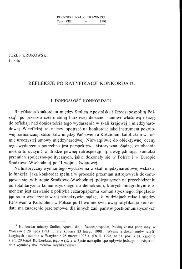 R O CZ N IK I Tom V II I NAUK PRAW NYCH - 1998 JÓ Z E F K R U K O W S K I L u b lin R E FL E K SJE PO R A T Y F IK A C JI K O N K O R D A T U I. D O N I O S Ł O Ś Ć K O N K O R D A T U Ratyfikacja konkordatu między Stolicą A postolską i R zecząpospolitą P o l s k ą1, po przeszło czteroletniej burzliwej debacie, stanowi w łaściw ą okazję do refleksji nad doniosłością tego wydarzenia w skali krajowej i m iędzyn aro dowej. W refleksji tej należy spojrzeć na konkordat jako instrum ent p o k o jo wej normalizacji stosunków między Państw em a Kościołem katolickim w for mie uroczystej umowy między naród wej. N iew ątpliw ie do obiektywnej oceny tego wydarzenia potrzebna jest perspektyw a historyczna. Sądzę, że obecnie można to uczynić w drodze pewnej retrospekcji, tj. uw zględniając kontekst przemian społeczno-politycznych, jak ie dokonały się w Polsce i w Europie Środkowo-W schodniej po II wojnie światowej. Na historyczny wymiar tego wydarzenia w skali m iędzynarodow ej w sk az u je funkcja, jak ą konkordat spełnia w procesie przem ian ustrojow ych do k o n u jących się w Europie Środkowo-W schodniej, polegających na przechodzeniu od totalitaryzmu komunistycznego do demokracji, których integralnym ele mentem jest zerwanie z polityką cezaropapizm u kom unistycznego. S p ogląda jąc na to wydarzenie w tej perpektywie, sądzę, iż w dziejach relacji m iędzy Państwem a Kościołem w Polsce po II wojnie światowej ratyfikacja k o n k o r datu ma znaczenie przełomowe, dla innych zaś państw postkom unistycznych 1 Konkordat m iędzy Stolicą A postolską i R zecząposp olitą P olską został podpisany w W arszawie 28 lipca 1993 r., ratyfikowany 23 lutego 1998 r. W ym iana dokum entów ratyfi kacyjnych nastąpiła w W atykanie 25 marca 1998 r. (D z.U . 1998, nr 31, poz. 318). Z godnie z art. 29 tegoż Konkordatu, jego w ejście w ży cie nastąpiło „po up ływ ie jed n ego m iesiąca od dnia wym iany dokum entów ratyfikacyjnych”. m a znaczenie modelowe. Z nam ienne jest, iż konkordat polski jest chronolo gicznie pierw szym konkordatem podpisanym przez Stolicę A postolską z pań stw em postkom unistycznym . M im o że wniosek o ratyfikację konkordatu przez kilka lat był blokowany, to je d n ak sam fakt podpisania konkordatu miał wpływ inspirujący na rządy innych państw tej części Europy. W ślad za Pol ską poszły bowiem takie państw a ja k Chorwacja, Węgry, Słowacja, Czechy, podejm ując negocjacje w celu uregulow ania swych stosunków z Kościołem katolickim w formie um ów m iędzynarodow ych ze Stolicą Apostolską. Co więcej, niektóre z tych państw, ja k C horwacja i W ęgry, wyprzedziły Polskę datą ich ratyfikacji. Istotne znacznie konkordatu w skali krajowej tkwi w konsekwencjach, jak ie wynikają z niego dla społeczeństwa polskiego, którego olbrzym ią więk szość stanowią katolicy. W sensie polityczno-prawnym ratyfikacja konkordatu kończy stan tym czasow ości w dziedzinie regulacji relacji między Państw em a Kościołem, jaki zaistniał w 1945 r., tj. w m om encie zerwania przez władze kom unistyczne konkordatu z 1925 r. Niew ątpliwie ju ż władze kom unistyczne zdawały sobie sprawę z tego, iż norm alizacja stosunków m iędzy państw em i Kościołem katolickim w Polsce powinna nastąpić w formie konwencji międzynarodowej ze Stolicą Apostolską. Dlatego w 1974 r. nawiązały prow izoryczne stosunki dyplom atyczne ze Stolicą A postolską i podjęły negocjacje w ramach tzw. dw óch zespołów roboczych. Jednakże dośw iadczenia historyczne dowiodły, iż w ładze kom unistyczne - z pow odu przywiązaniu do swych założeń ideolo gicznych - okazały się niezdolne do zawarcia konkordatu. Znam ienną rzeczą jest, iż podobną niezdolnością wykazał się - zdom inowany przez ugrupow a nia postkom unistyczne - Sejm III Rzeczypospolitej w latach 1993-1997. N astępnie istotnym skutkiem ratyfikacji konkordatu w skali krajowej jest wyższy stopień stabilizacji w stosunkach P a ń stw o -K o śc ió ł aniżeli na podsta wie regulacji wyłącznie ustawowych. Dlatego ratyfikacja konkordatu rodzi po stronie większości społeczeństwa polskiego poczucie bezpieczeństw a i więk szej pew ności prawnej co do m ożliwości uzewnętrzniania swych przekonań w życiu publicznym. Ratyfikując konkordat suwerenne władze III Rzeczypo spolitej zobow iązały się bowiem , iż w przyszłości nie będą jednostronie do konyw ać takich zmian w sytuacji prawnej Kościoła, a zw łaszcza nie będą w prow adzać takich ograniczeń w dziedzinie wolności religijnej, które byłyby sprzeczne z treścią konkordatu. R atyfikacja konkordatu jest w yrazem woli definitywnego zerwania przez Państw o z - narzuconym przez ZS R R i pozostające na jeg o usługach władze P R L - system em separacji wrogiej i potwierdzenia woli kontynuacji procesu wprowadzania systemu separacji skoordynow anej2, ukształtow anego znacznie wcześniej w państwach dem okratycznych Europy Zachodniej (Niemcy, H isz pania, Włochy), a zainicjownego w Polsce w 1989 r. Przedmiotem norm wpisanych do konkordatu są przede w szystkim g w aran cje wolności religijnej w zakresie uzew nętrzniania swych przekonań religij nych i światopoglądowych w życiu publicznym . Dlatego skutkiem ratyfikacji konkordatu jest po stronie społeczeństwa poczucie pew ności prawnej co do możliwości realizacji tej wolności przez wszystkich ludzi odczuw ających potrzeby religijne, a nie tylko przez stosunkowo wąską grupę ludzi n iew ierzą cych, jak to miało miejsce w okresie kom unistycznym . Poczucie pewności wynika z natury zobow iązań prawnych, jak ie podjęte zostały przez dwa podmioty publicznego praw a m iędzynarodow ego - Stolicę Apostolską i najwyższe organy Państwa Polskiego. W pisane do konkordatu zobowiązania nie m ogą być jednostronnie zm ienione przez je d n ą z dwóch stron, czyli wyłącznie na drodze ustawowej. Nie nal