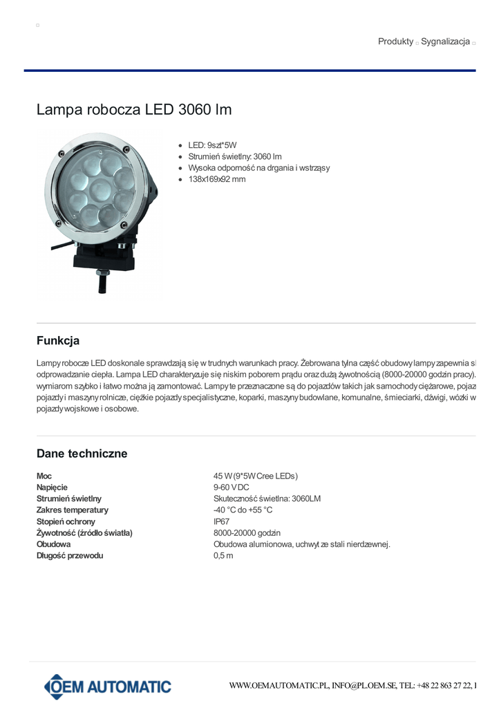 Produkty Sygnalizacja Lampa robocza LED 3060 lm LED: 9szt*5W Strumień świetlny: 3060 lm Wysoka odporność na drgania i wstrząsy 138x169x92 mm Funkcja Lampy robocze LED doskonale sprawdzają się w trudnych warunkach pracy. Żebrowana tylna część obudowy lampy zapewnia skuteczn odprowadzanie ciepła. Lampa LED charakteryzuje się niskim poborem prądu oraz dużą żywotnością (8000-20000 godzin pracy). Dzięki n wymiarom szybko i łatwo można ją zamontować. Lampy te przeznaczone są do pojazdów takich jak samochody ciężarowe, pojazdy spec pojazdy i maszyny rolnicze, ciężkie pojazdy specjalistyczne, koparki, maszyny budowlane, komunalne, śmieciarki, dźwigi, wózki widłowe, pojazdy wojskowe i osobowe. Dane techniczne Moc Napięcie Strumień świetlny Zakres temperatury Stopień ochrony Żywotność (źródło światła) Obudowa Długość przewodu 45 W (9*5W Cree LEDs) 9-60 V DC Skuteczność świetlna: 3060LM -40 °C do +55 °C IP67 8000-20000 godzin Obudowa alumionowa, uchwyt ze stali nierdzewnej. 0,5 m WWW.OEMAUTOMATIC.PL, [email protected], TEL: +48 22 863 27 22, FAX: +4 Wymiary 169x140x92 mm Dane do zamówienia Numer produktu 18085450L3060LM Opis Lampa robocza LED Napiecie 9-60 V DC Moc 45 W (9*5W LED) WWW.OEMAUTOMATIC.PL, [email protected], TEL: +48 22 863 27 22, FAX: +4