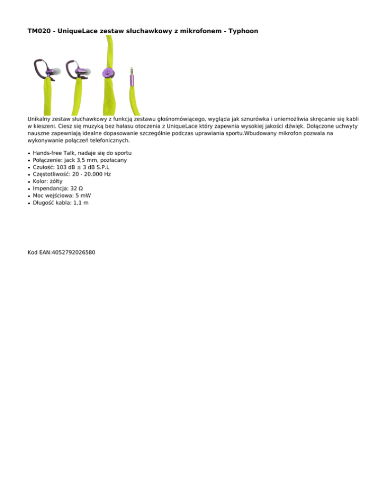 TM020 - UniqueLace zestaw słuchawkowy z mikrofonem - Typhoon Unikalny zestaw słuchawkowy z funkcją zestawu głośnomówiącego, wygląda jak sznurówka i uniemożliwia skręcanie się kabli w kieszeni. Ciesz się muzyką bez hałasu otoczenia z UniqueLace który zapewnia wysokiej jakości dźwięk. Dołączone uchwyty nauszne zapewniają idealne dopasowanie szczególnie podczas uprawiania sportu.Wbudowany mikrofon pozwala na wykonywanie połączeń telefonicznych. ● ● ● ● ● ● ● ● Hands-free Talk, nadaje się do sportu Połączenie: jack 3,5 mm, pozłacany Czułość: 103 dB ± 3 dB S.P.L Częstotliwość: 20 - 20.000 Hz Kolor: żółty Impendancja: 32 Ω Moc wejściowa: 5 mW Długość kabla: 1,1 m Kod EAN:4052792026580