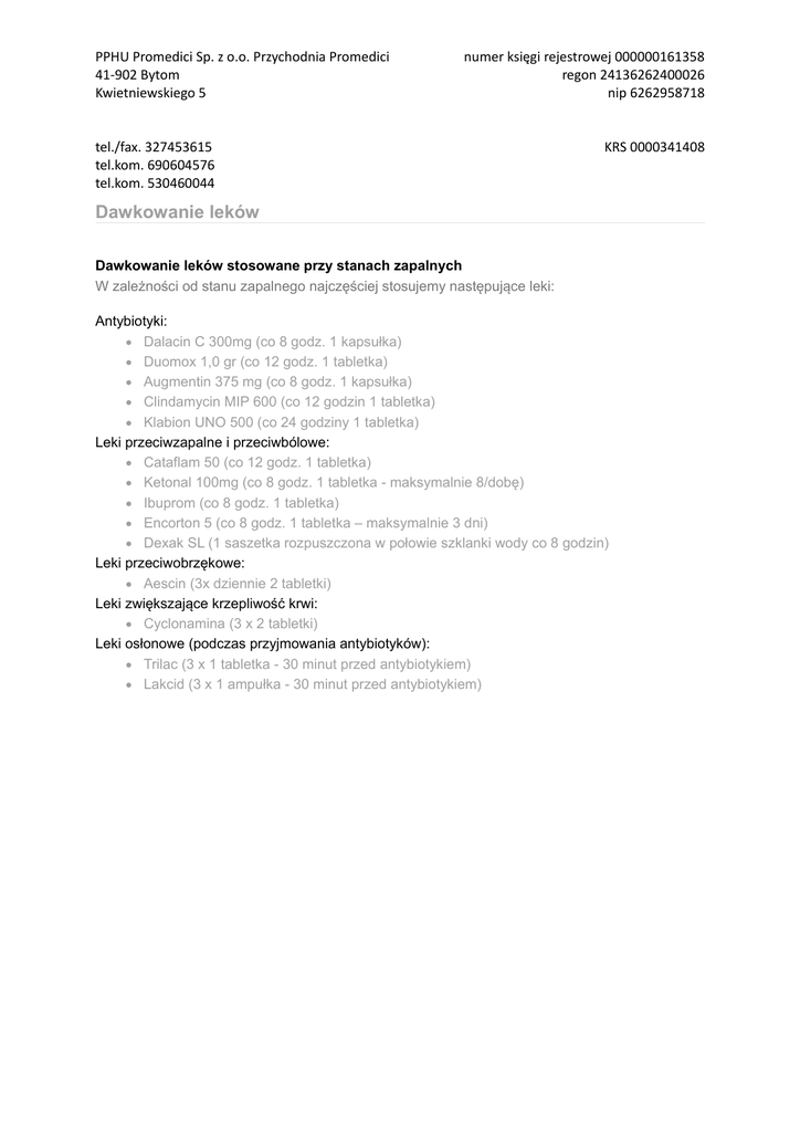 PPHU Promedici Sp. z o.o. Przychodnia Promedici 41-902 Bytom Kwietniewskiego 5 numer księgi rejestrowej 000000161358 regon 24136262400026 nip 6262958718 tel./fax. 327453615 tel.kom. 690604576 tel.kom. 530460044 KRS 0000341408 Dawkowanie leków Dawkowanie leków stosowane przy stanach zapalnych W zależności od stanu zapalnego najczęściej stosujemy następujące leki: Antybiotyki: Dalacin C 300mg (co 8 godz. 1 kapsułka) Duomox 1,0 gr (co 12 godz. 1 tabletka) Augmentin 375 mg (co 8 godz. 1 kapsułka) Clindamycin MIP 600 (co 12 godzin 1 tabletka) Klabion UNO 500 (co 24 godziny 1 tabletka) Leki przeciwzapalne i przeciwbólowe: Cataflam 50 (co 12 godz. 1 tabletka) Ketonal 100mg (co 8 godz. 1 tabletka - maksymalnie 8/dobę) Ibuprom (co 8 godz. 1 tabletka) Encorton 5 (co 8 godz. 1 tabletka – maksymalnie 3 dni) Dexak SL (1 saszetka rozpuszczona w połowie szklanki wody co 8 godzin) Leki przeciwobrzękowe: Aescin (3x dziennie 2 tabletki) Leki zwiększające krzepliwość krwi: Cyclonamina (3 x 2 tabletki) Leki osłonowe (podczas przyjmowania antybiotyków): Trilac (3 x 1 tabletka - 30 minut przed antybiotykiem) Lakcid (3 x 1 ampułka - 30 minut przed antybiotykiem)