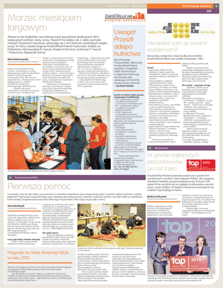 Informacje lokalne 1 | ArcelorMittal Poland | Marzec 2013 Marzec miesiącem targowym Wiosna to dla studentów czas intensywnych poszukiwań atrakcyjnych ofert wakacyjnych praktyk, staży i pracy. Nasza firma kolejny rok z rzędu wychodzi młodym inżynierom naprzeciw, spotykając się z nimi podczas uczelnianych targów pracy. W marcu stoiska targowe ArcelorMittal Poland można było znaleźć na Politechnice Wrocławskiej (5 marca), Akademii Górniczo-Hutniczej (7 marca) i Politechnice Śląskiej (8 marca). ostatni. Zaskoczyła mnie liczba studentów odwiedzających targi [email protected] aktywnie poszukujących informacji o pracodawcach. Szczególnie ucieszyło mnie, że Każdy, kto odwiedził nasze coraz więcej osób rozpoznaje stoisko, miał okazję nie tylko naszą firmę i świetnie zna jej bliżej poznać profil ArcelorMittal profil produkcji - mówi Grzegorz Poland i oferty programu Penkaty, kierownik wsparcia ds. stażowego firmy, ale również informatyzacji procesów HR, zapoznać się z inicjatywami, które który rozmawiał ze studentami podejmujemy w ramach Politechniki Śląskiej. działalności programu Spotkanie ze studentami edukacyjnego ZainSTALuj się. podczas uczelnianych targów - Zespół rekrutacji pracy było również doskonałą wspierałem na targach pracy po okazją do przekazania im raz pierwszy i na pewno nie zaproszenia na ArcelorMittal Marta Marczewska Poland Day - organizowane przez firmę konferencje o tematyce technologicznej i karierowej. Dwa całodzienne spotkania zaplanowane zostały na 20 i 22 marca i odbędą się na naszych uczelniach partnerskich - Politechnice Śląskiej i Akademii Górniczo-Hutniczej. Będzie to już druga edycja tego wydarzenia - w ArcelorMittal Poland Day w 2012 roku w sumie na obu uczelniach udział wzięło ponad 250 studentów. Uwaga! Przyszli Nie jesteś sam ze swoimi adepci problemami! hutnictwa Skorzystaj z programu wsparcia dla pracowników Biuro Rozwoju Pracowników i Rekrutacji ArcelorMittal Poland wspólnie z Zespołem Szkół Technicznych w Dąbrowie Górniczej od nowego roku szkolnego 2013/2014 otwiera nowy kierunek - technik hutnik. Uczeń w trakcie nauki uzyska następujące kwalifikacje: • M.6. użytkowanie maszyn i urządzeń stosowanych w procesach metalurgicznych • M.7. użytkowanie maszyn i urządzeń do obróbki plastycznej metali • M.38. organizacja i prowadzenie procesów metalurgicznych oraz obróbki plastycznej metali Absolwent jest przygotowany do kontynuowania nauki na kierunkach: • metalurgia, • materiałoznawstwo, • zarządzanie i inżynieria produkcji, • inżynieria materiałowa, inżynieria mechaniczna i materiałowa, • mechanika i budowa maszyn • ceramika, wirtotechnologia. Rekrutacja na rok szkolny 2013/2014 odbywać się będzie od 13 maja do 23 czerwca 2013 roku. Osoby zainteresowane proszone są o kontakt z Zespołem Szkół Technicznych w Dąbrowie Górniczej, ul. Królowej Jadwigi 12; tel., fax: 32 262-29-01, www.zst-dg.pl Ze studentami Politechniki Śląskiej rozmawiał Grzegorz Penkaty > HR Pierwsza pomoc Czy każdy z nas wie, jak należy się zachować w momencie zagrożenia życia drugiej osoby, jakie czynności należy wykonać i w jakiej kolejności? Najnowsze wytyczne dotyczące udzielania pierwszej pomocy mieliśmy możliwość poznać i utrwalić sobie na szkoleniach, które zostały zorganizowane przez Biuro Rozwoju Pracowników i Rekrutacji na początku marca. w obawie, że zrobimy to źle, wręcz zaszkodzimy, a nie pomożemy. Instruktorzy starali się obalić ten mit i pokazać, że udzielanie pierwszej pomocy to zadanie, które może Szkolenia prowadzone były przez wykonać każdy, trzeba jedynie czynnych ratowników medycznych, pokonać barierę psychiczną. którzy współpracują z firmą Podczas udzielania pomocy osobie „Rescue” z Chorzowa. Firmę oraz jej poszkodowanej ważna jest każda instruktorów mieliśmy już okazję sekunda, której nie możemy tracić poznać podczas prowadzonych od zastanawiając się, czy damy radę, kilku lat szkoleń tego typu oraz Dni czy nie - podkreślają instruktorzy. BHP organizowanych w ArcelorMittal Poland w latach Nie tylko teoria ubiegłych. Podczas szkolenia uczestnicy poznawali nie tylko teorię, ale mieli Liczy się każdy ułamek sekundy przede wszystkim możliwość Wielu z nas ma opory przed przećwiczenia całej „akcji” udzielania udzielaniem pierwszej pomocy pomocy na fantomach. Co ciekawe, Anna Bochenek > Nie czekaj - zapytaj o drogę Zadzwoń i umów się na konkretny termin spotkania z konsultantem lub przyjdź bezpośrednio do Ośrodka „DROGA”. Konsultanci są dostępni: • w Krakowie – Budynek „Z” pok. 40 - każdy czwartek - godz. 10.00 – 15.00 oraz w Ośrodku „DROGA” cały tydzień po wcześniejszym umówieniu się przez telefon; • w Dąbrowie Górniczej, Świętochłowicach, Sosnowcu, Chorzowie – w Ośrodku „DROGA” od poniedziałku do piątku bezpośrednio lub po wcześniejszym umówieniu się przez telefon. Można także kierować zapytania mailem na adres: [email protected] lub przez formularz ze strony internetowej www.eap-zapytajodroge.pl - zakładka „zapytaj o drogę”. Wyróżnienia W gronie najlepszych pracodawców po raz trzeci Barbara Schramel [email protected] Badane organizacje zostały ocenione w następujących obszarach: świadczenia podstawowe, świadczenia dodatkowe i warunki pracy, [email protected] Wzorem lat ubiegłych również za ten rok przyznana zostanie nagroda za osiągnięcie wskaźników absencji, które nie przekraczają określonego pułapu. Na rok bieżący cel został ustalony na poziomie 3,6 procent. Podziału funduszu premiowego dokona dyrektor generalny, według ustalonych przez siebie zasad - nagrodzone zostaną trzy zakłady, pięć linii produkcyjnych i jedno biuro. Jeżeli: • poprawiasz sobie nastrój alkoholem, lekarstwami lub narkotykami. Masz z tym coraz większe problemy i chciałbyś to zmienić; • masz problemy z 