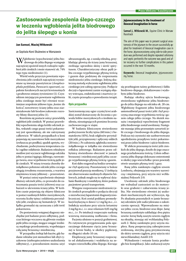 Prace kliniczne i kazuistyczne Zastosowanie zespolenia ślepo-czczego w leczeniu wgłobienia jelita biodrowego do jelita ślepego u konia Jan Samsel, Maciej Witkowski ze Szpitala Koni Służewiec w Warszawie W głobienie (wpochwienie) jelita biodrowego do jelita ślepego występuje najczęściej spośród innych rodzajów wgłobień jelit cienkich i może stanowić ok. 74% tego typu niedrożności (1). Wśród wielu przyczyn powstania wpochwienia jelit cienkich najczęściej wymieniane są inwazje pasożytnicze (Anoplocephala perfoliata, Parascaris equorum), zapalenie krezkowych naczyń krwionośnych i gwałtowne zmiany żywieniowe (1). Czynnikiem inicjującym powstanie wgłobienia jelita cienkiego może być również wcześniejsze zespolenie jelitowe typu „koniec do końca”, nowotwory ściany jelita oraz ziarniniakowate lub brodawczakowate rozrosty błony śluzowej jelita (1). Rozróżnia się postacie ostrą i przewlekłą wgłobień jelit cienkich. W postaci przewlekłej wpochwieniu ulega krótki odcinek jelita, wskutek czego pasaż treści pokarmowej jest spowolniony, ale nie zatrzymany całkowicie. W takich przypadkach u koni pojawiają się nawrotowe bóle morzyskowe (zwłaszcza po posiłku), spadek apetytu, wychudzenie, podwyższona temperatura ciała i ogólne osłabienie. Badaniem rektalnym możliwe jest wyczucie wgłobionego odcinka jelita w postaci tęgiego, tkliwego, rurowatego tworu, oraz wypełnione treścią pętle jelit cienkich. W miarę trwania choroby dożołądkowo położone odcinki jelita czczego ulegają trwałemu rozszerzeniu, a warstwa mięśniowa ściany jelitowej – przerostowi. W postaci ostrej wpochwienie obejmuje dłuższy odcinek jelita, co prowadzi do zatrzymania pasażu treści jelitowej oraz zaburzeń w ukrwieniu ściany jelita. W krótkim czasie pojawiają się objawy kliniczne w postaci nasilonych bólów morzyskowych, wzrostu liczby tętna i osłabienia perystaltyki jelit; zwiększa się hematokryt. W żołądku gromadzi się zarzucana z jelit treść pokarmowa. Do postawienia wstępnej diagnozy niezbędne jest badanie przez odbytnicę, podczas którego wyczuwa się głównie rozdęte pętle jelita czczego, mogące osiągać średnicę męskiego przedramienia, wypełniające całą jamę brzuszną i miedniczną. W przypadku źrebiąt lub kuców, gdy badanie rektalne jest niemożliwe lub zbyt ryzykowne (niebezpieczeństwo uszkodzenia odbytnicy), z powodzeniem można użyć Życie Weterynaryjne • 2010 • 85(8) ultrasonografu, np. z sondą rektalną, przykładając głowicę do ściany jamy brzusznej, zwilżając uprzednio skórę i sierść spirytusem. Charakterystyczny obraz pętli jelita czczego wypełnionego płynną treścią i gazem daje podstawę do rozpoznania niedrożności jelita cienkiego. Jedyną skuteczną metodą wyleczenia wgłobienia jelita cienkiego jest zabieg operacyjny. Podjęcie decyzji o laparotomii zanim wystąpią objawy wstrząsu, endotoksemii i martwicy jelit, często przesądza o powodzeniu terapii. Opis przypadku Sześciomiesięczny ogier czystej krwi arabskiej został dostarczony do leczenia z powodu bólów morzyskowych o średnim nasileniu, nieustępujących pomimo leczenia zachowawczego w stajni. W badaniu klinicznym stwierdzono podwyższenie liczby tętna (60/min.) i hematokrytu (45%), brak odgłosów perystaltyki jelit, przyspieszony i spłycony oddech (20/min.). Po założeniu zgłębnika nosowożołądkowego w żołądku nie stwierdzono refluksu jelitowego. Badaniem przez odbytnicę stwierdzono obecność w jamach brzusznej i miednicznej pętli jelita czczego wypełnionego płynną treścią i gazem. Koń słabo reagował na bodźce zewnętrzne i był apatyczny. Pozostawiony w boksie przyjmował pozycję mostkową. U źrebięcia nie obserwowano nasilonych objawów bólowych, jednak mogło na to wpływać działanie fluniksyny i romifidyny, które podano pacjentowi przed transportem. Wstępne rozpoznanie niedrożności jelit cienkich przesądziło o podjęciu decyzji o niezwłocznej laparotomii diagnostycznoleczniczej. Koń został poddany premedykacji ksylazyną w dawce 1,1 mg/kg m.c., i.v. Indukcję uzyskano przy użyciu ketaminy 2 mg/kg m.c. i.v. oraz relanium 0,05 mg/kg m.c., i.v. Po intubacji rozpoczęto narkozę wziewną mieszaniną izofluranu i tlenu. Pacjenta ułożono w pozycji grzbietowej. Po rutynowym przygotowaniu pola operacyjnego dokonano cięcia jamy brzusznej w kresie białej, w okolicy pępkowej, na długości około 10 cm. Eksplorację jamy brzusznej rozpoczęto od zlokalizowania i wydobycia na zewnątrz wierzchołka jelita ślepego. Kierując Jejunocecostomy in the treatment of ileocecal invagination in horse Samsel J., Witkowski M., Equine Clinic in Warsaw Racetrack The aim of this paper was to present surgical anastomosis of the jejunum to the cecum successfully applied for treatment of ileocecal invagination case in the horse. Jejunocecostomy using side-to-side procedure was performed and despite repeated celiotomy and septic peritonitis the outcome was good and after recovery no further complications in this patient occurred in the next 10 months. Keywords: ileocecal invagination, jejunocecostomy, horse. się przebiegiem taśmy grzbietowej i fałdu biodrowo-ślepego, zlokalizowano i wydobyto jelito biodrowe. Badając okolicę ujścia biodrowego, stwierdzono wgłobienie jelita biodrowego do jelita ślepego na odcinku ok. 20 cm. Wgłobiony fragment jelita biodrowego uniemożliwiał pasaż treści jelit i był przyczyną znacznego wypełnienia treścią i gazem całego jelita czczego. Na skutek masażu i manipulacji wpochwiony fragment jelita biodrowego został uwolniony. Następnie masując jelita przesunięto zawartość jelit czczego i biodrowego do jelita ślepego. Podczas tej czynności nie zaobserwowano upośledzenia przepływu treści pokarmowej przez jelito biodrowe i ujście biodrowe. W efekcie przesunięcia treści jelit cienkich do jelita ślepego, doszło do jego znacznego przeł