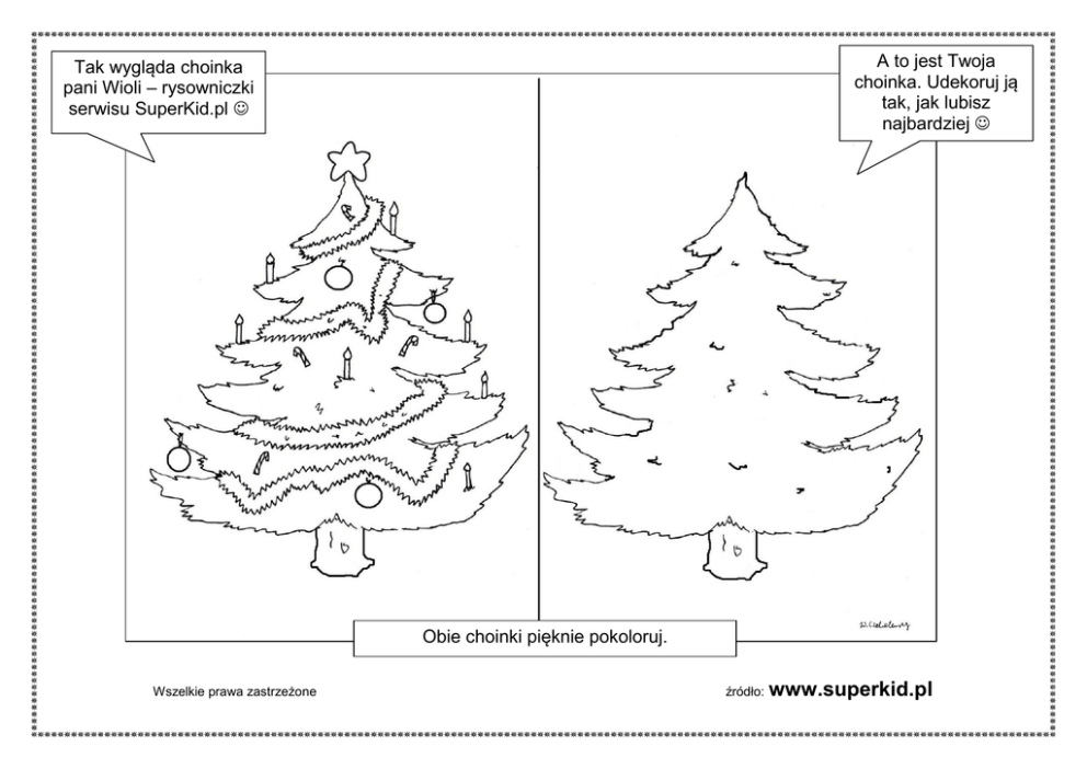 A to jest Twoja choinka. Udekoruj ją tak, jak lubisz najbardziej Tak wygląda choinka pani Wioli – rysowniczki serwisu SuperKid.pl Obie choinki pięknie pokoloruj. Wszelkie prawa zastrzeżone źródło: www.superkid.pl