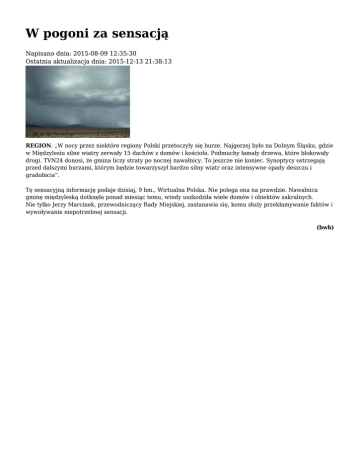 W pogoni za sensacją Napisano dnia: 2015-08-09 12:35:30 Ostatnia aktualizacja dnia: 2015-12-13 21:38:13 REGION. „W nocy przez niektóre regiony Polski przetoczyły się burze. Najgorzej było na Dolnym Śląsku, gdzie w Międzylesiu silne wiatry zerwały 15 dachów z domów i kościoła. Podmuchy łamały drzewa, które blokowały drogi. TVN24 donosi, że gmina liczy straty po nocnej nawałnicy. To jeszcze nie koniec. Synoptycy ostrzegają przed dalszymi burzami, którym będzie towarzyszył bardzo silny wiatr oraz intensywne opady deszczu i gradobicia”. Tę sensacyjną informację podaje dzisiaj, 9 bm., Wirtualna Polska. Nie polega ona na prawdzie. Nawałnica gminę międzyleską dotknęła ponad miesiąc temu, wtedy uszkodziła wiele domów i obiektów sakralnych. Nie tylko Jerzy Marcinek, przewodniczący Rady Miejskiej, zastanawia się, komu służy przekłamywanie faktów i wywoływanie niepotrzebnej sensacji. (bwb)