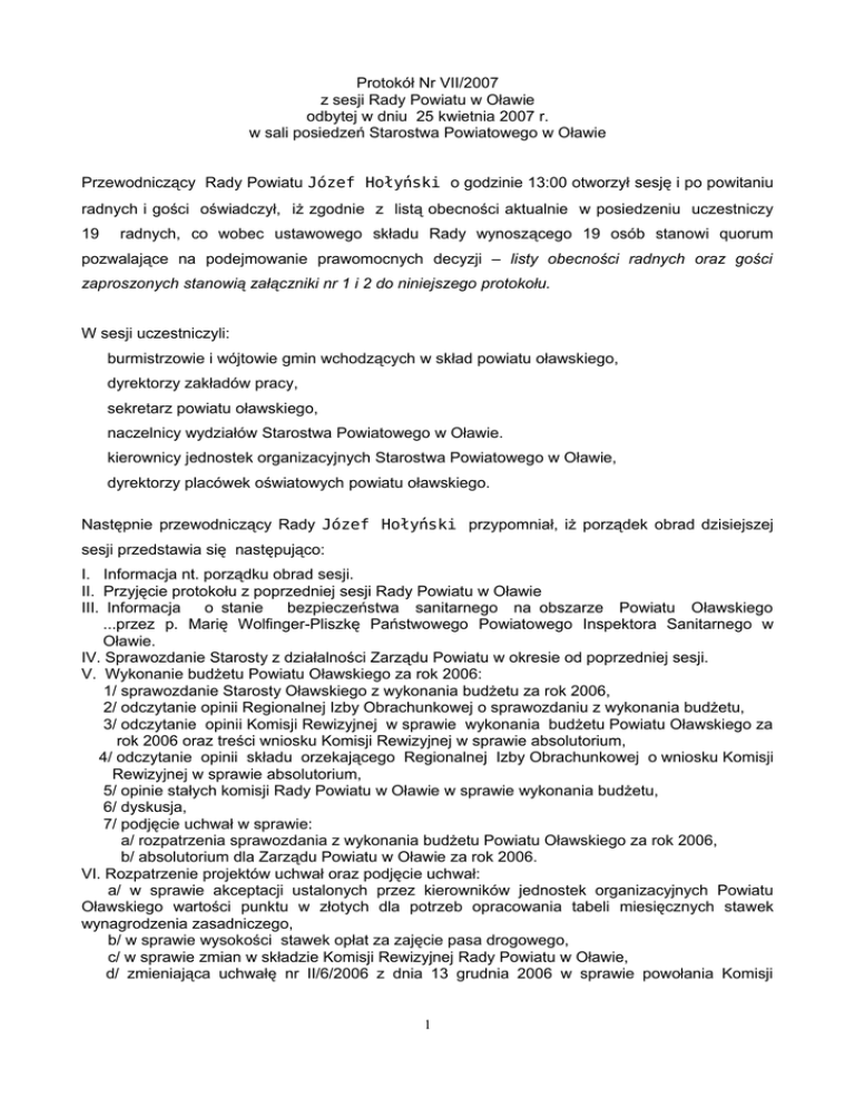 Protokół Nr VII/2007 z sesji Rady Powiatu w Oławie odbytej w dniu 25 kwietnia 2007 r. w sali posiedzeń Starostwa Powiatowego w Oławie Przewodniczący Rady Powiatu Józef Hołyński o godzinie 13:00 otworzył sesję i po powitaniu radnych i gości oświadczył, iż zgodnie z listą obecności aktualnie w posiedzeniu uczestniczy 19 radnych, co wobec ustawowego składu Rady wynoszącego 19 osób stanowi quorum pozwalające na podejmowanie prawomocnych decyzji – listy obecności radnych oraz gości zaproszonych stanowią załączniki nr 1 i 2 do niniejszego protokołu. W sesji uczestniczyli: burmistrzowie i wójtowie gmin wchodzących w skład powiatu oławskiego, dyrektorzy zakładów pracy, sekretarz powiatu oławskiego, naczelnicy wydziałów Starostwa Powiatowego w Oławie. kierownicy jednostek organizacyjnych Starostwa Powiatowego w Oławie, dyrektorzy placówek oświatowych powiatu oławskiego. Następnie przewodniczący Rady Józef Hołyński przypomniał, iż porządek obrad dzisiejszej sesji przedstawia się następująco: I. Informacja nt. porządku obrad sesji. II. Przyjęcie protokołu z poprzedniej sesji Rady Powiatu w Oławie III. Informacja o stanie bezpieczeństwa sanitarnego na obszarze Powiatu Oławskiego ...przez p. Marię Wolfinger-Pliszkę Państwowego Powiatowego Inspektora Sanitarnego w Oławie. IV. Sprawozdanie Starosty z działalności Zarządu Powiatu w okresie od poprzedniej sesji. V. Wykonanie budżetu Powiatu Oławskiego za rok 2006: 1/ sprawozdanie Starosty Oławskiego z wykonania budżetu za rok 2006, 2/ odczytanie opinii Regionalnej Izby Obrachunkowej o sprawozdaniu z wykonania budżetu, 3/ odczytanie opinii Komisji Rewizyjnej w sprawie wykonania budżetu Powiatu Oławskiego za rok 2006 oraz treści wniosku Komisji Rewizyjnej w sprawie absolutorium, 4/ odczytanie opinii składu orzekającego Regionalnej Izby Obrachunkowej o wniosku Komisji Rewizyjnej w sprawie absolutorium, 5/ opinie stałych komisji Rady Powiatu w Oławie w sprawie wykonania budżetu, 6/ dyskusja, 7/ podjęcie uchwał w sprawie: a/ rozpatrzenia sprawozdania z wykonania budżetu Powiatu Oławskiego za rok 2006, b/ absolutorium dla Zarządu Powiatu w Oławie za rok 2006. VI. Rozpatrzenie projektów uchwał oraz podjęcie uchwał: a/ w sprawie akceptacji ustalonych przez kierowników jednostek organizacyjnych Powiatu Oławskiego wartości punktu w złotych dla potrzeb opracowania tabeli miesięcznych stawek wynagrodzenia zasadniczego, b/ w sprawie wysokości stawek opłat za zajęcie pasa drogowego, c/ w sprawie zmian w składzie Komisji Rewizyjnej Rady Powiatu w Oławie, d/ zmieniająca uchwałę nr II/6/2006 z dnia 13 grudnia 2006 w sprawie powołania Komisji 1 Rewizyjnej Rady Powiatu w Oławie, e/ w sprawie wyboru członka Zarządu Powiatu w Oławie, f/ w sprawie zmiany w uchwale Rady Powiatu w Oławie nr V/29/2007 z dnia 27 lutego 2007 r., w sprawie uchwalenia budżetu Powiatu Oławskiego na rok 2007, VII. Interpelacje, zapytania wnioski i oświadczenia radnych. Przed przystąpieniem do realizacji porządku obrad sesji, przewodniczący Rady zapytał, czy ktoś z radnych chciałby zgłosić uwagi do przedstawionego porządku obrad? Nikt z radnych nie zgłosił uwag do porządku obrad sesji, po czym przewodniczący Rady przeszedł do jego realizacji. Ad II Przyjęcie protokołu z poprzedniej sesji Rady Powiatu w Oławie. Rada Powiatu przyjęła protokół z poprzedniej sesji przez aklamację. Ad III O przedstawienie informacji o stanie bezpieczeństwa sanitarnego na obszarze Powiatu Oławskiego przewodniczący poprosił p. Marię Wolfinger-Pliszkę Państwowego Powiatowego Inspektora Sanitarnego w Oławie – załącznik nr 3 do niniejszego protokołu. Po przedstawieniu informacji, przewodniczący Rady otworzył dyskusję, a następnie odnośnie informacji o przekroczeniu w niektórych wodociągach żelaza i manganu zapytał, czy te ujęcia będą dalej eksploatowane? W odpowiedzi Inspektor potwierdziła, iż ujęcia będą eksploatowane, natomiast w myśl nowego rozporządzenia właściciele wodociągów będą mogli występować do PSSE o derogację na okres 3 miesięcy, następnie 6 miesięcy oraz 1 roku. W sytuacji niespełnienia wymagań nałożonych decyzjami, będą zmuszeni zrezygnować z prowadzenia wodociągu, bądź zastosować nowe procesy technologiczne zmierzające do uzyskania wody dobrej jakości. Kolejno wystąpił radny Stanisław Pławski, który prosił o rozszerzenie informacji dotyczącej złego stanu boisk i urządzeń sportowych przyszkolnych. Czy któreś z boisk zostało zakwalifikowane do zamknięcia? Inspektor wyjaśniła, iż żadne z boisk nie zostało zakwalifikowane do zamknięcia. Ponownie zabrał głos radny Stanisław Pławski, który w imieniu nauczycieli wychowania fizycznego, pytał, kto będzie ponosił odpowiedzialność w przypadku zaistnienia jakiegoś wypadku na terenie boiska, mając na uwadze zły stan boisk. Inspektor tłumaczyła radnemu, iż w takim przypadku wina się rozkłada, natomiast jest świadoma tego, iż remonty boisk są niezbędne z uwagi na bezpieczeństwo dzieci i młodzieży. W tym celu uczestniczy w rozmowach z dyrektorami placówek oświatowych w tej sprawie. Radny Zdzisław Brezdeń był zainteresowany sprawą dzikich wysypisk występujących na terenie naszego powiatu, w kwestii której pytał, czy prowadzone są ze strony Inspektoratu jakieś działania? Inspektor wyjaśniła, iż PSSE w Oławie nie prowadzi nadzoru nad dzikimi wysypiskami, ponieważ w myśl ustawy o utrzymaniu czystości i porządku, zadania te należą do kompetencji samorządów. 2 Z uwagi na brak dalszych pytań i uwag do niniejszego sprawozdania przewodniczący Rady zamknął dyskusję, dziękując Inspektorowi za przedstawienie sprawozdania. Ad IV Sprawozdanie Starosty z działalności Zarządu Powiatu w okresie od poprzedniej sesji zostało przedstawione przez starostę Marka Szponara – załącznik nr 4 do niniejszego protokołu. Przewodnicząc