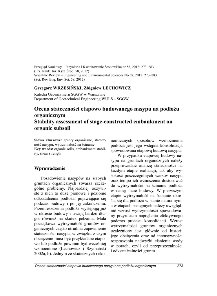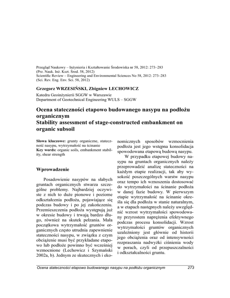 Przegląd Naukowy – Inżynieria i Kształtowanie Środowiska nr 58, 2012: 273–283 (Prz. Nauk. Inż. Kszt. Środ. 58, 2012) Scientific Review – Engineering and Environmental Sciences No 58, 2012: 273–283 (Sci. Rev. Eng. Env. Sci. 58, 2012) Grzegorz WRZESIŃSKI, Zbigniew LECHOWICZ Katedra Geoinżynierii SGGW w Warszawie Department of Geotechnical Engineering WULS – SGGW Ocena stateczności etapowo budowanego nasypu na podłożu organicznym Stability assessment of stage-constructed embankment on organic subsoil Słowa kluczowe: grunty organiczne, stateczność nasypu, wytrzymałość na ścinanie Key words: organic soils, embankment stability, shear strength Wprowadzenie Posadowienie nasypów na słabych gruntach organicznych stwarza szczególne problemy. Najbardziej oczywiste z nich to duże pionowe i poziome odkształcenia podłoża, pojawiające się podczas budowy i po jej zakończeniu. Przemieszczenia podłoża występują już w okresie budowy i trwają bardzo długo, również na skutek pełzania. Mała początkowa wytrzymałość gruntów organicznych często utrudnia zapewnienie stateczności nasypu, w związku z czym obciążenie musi być przykładane etapowo lub podłoże powinno być wcześniej wzmocnione (Lechowicz i Szymański 2002a, b). Jednym ze skutecznych i eko- nomicznych sposobów wzmocnienia podłoża jest jego wstępna konsolidacja spowodowana etapową budową nasypu. W przypadku etapowej budowy nasypu na gruntach organicznych należy przeprowadzić analizę stateczności na każdym etapie realizacji, tak aby wysokość poszczególnych warstw nasypu oraz tempo ich wznoszenia dostosować do wytrzymałości na ścinanie podłoża w danej fazie budowy. W pierwszym etapie wytrzymałość na ścinanie określa się dla podłoża w stanie naturalnym, a w etapach następnych należy uwzględnić wzrost wytrzymałości spowodowany przyrostem naprężenia efektywnego podczas procesu konsolidacji. Wzrost wytrzymałości gruntów organicznych uzależniony jest głównie od historii jego obciążenia oraz od intensywności rozpraszania nadwyżki ciśnienia wody w porach, czyli od przepuszczalności i odkształcalności gruntu. Ocena stateczności etapowo budowanego nasypu na podłożu organicznym 273 Analiza stateczności nasypu prowadzona przy zastosowaniu naprężeń całkowitych w kolejnych etapach budowy wymaga prognozy zmiany wytrzymałości na ścinanie, wywołanej częściową konsolidacją podłoża organicznego. Do obliczeń wzrostu wytrzymałości na ścinanie konieczna jest znajomość zmiany stanu naprężenia efektywnego w procesie konsolidacji. Prognoza przebiegu konsolidacji podłoża organicznego powinna uwzględniać nieliniowość konsolidacyjnych charakterystyk, jak również duże zmiany geometrii podłoża (Szymański 1991). Właściwe oszacowanie wzrostu wytrzymałości na ścinanie podłoża organicznego podczas etapowego wznoszenia nasypu jest czynnikiem decydującym o poprawnej ocenie jego stateczności. Istnieje wiele sposobów, mniej lub bardziej skomplikowanych, określania i późniejszego uwzględniania w analizie stateczności wzrostu wytrzymałości na ścinanie bez odpływu. Metody prognozy wzrostu wytrzymałości na ścinanie można podzielić na trzy grupy (Lechowicz 1992). Pierwszą i drugą stanowią metody, w których przebieg procesu konsolidacji opisany jest w jednowymiarowym stanie odkształcenia, a stan naprężenia efektywnego reprezentowany jest przez składową pionową naprężenia efektywnego. Wydzielenie drugiej grupy metod wynika z dodatkowego uwzględnienia wpływu historii naprężenia na zmianę wytrzymałości na ścinanie. Trzecią grupę stanowią metody, w których przebieg procesu konsolidacji opisany jest w dwuwymiarowym stanie odkształcenia, a stan naprężenia efektywnego reprezentowany jest przez składową pionową i poziomą naprężenia efektyw274 nego. Wyboru metody prognozy wzrostu wytrzymałości na ścinanie dokonuje się na podstawie analizy czynników decydujących o charakterze przebiegu procesu wzmocnienia, występujących w terenie w rozpatrywanym przypadku. Przy posadowieniu wysokich nasypów na podłożu organicznym o znacznej miąższości (szczególnie przy wieloetapowej budowie nasypu) przyjęcie jednakowego przebiegu procesu wzmocnienia wzdłuż całego nasypu jest zbyt dużym uproszczeniem. Wyniki analizy numerycznej wykazują, że obciążenie podłoża organicznego nasypem powoduje powstanie w podłożu stref o znacznym zróżnicowaniu zakresu i przebiegu zmiany naprężenia oraz ciśnienia wody w porach. Wzdłuż potencjalnej powierzchni poślizgu następuje istotna zmiana kierunków naprężeń głównych, a tym samym wywoływany jest różny mechanizm zniszczenia (rys. 1). Każdej z wyszczególnionych stref wzdłuż potencjalnej powierzchni zniszczenia odpowiada inny kąt obrotu kierunków naprężeń głównych (α) – Zdravković i inni (2002). Prowadząc obliczenia wzrostu wytrzymałości na ścinanie, zaleca się wydzielenie w podłożu organicznym pionowych stref, dla których będą prowadzone obliczenia w jednowymiarowym stanie odkształcenia. Aby uzyskać poprawne wyniki, należy zwrócić uwagę na właściwy dobór wartości wywołanych obciążeń oraz wartości parametrów wzrostu wytrzymałości na ścinanie dla każdej warstwy obliczeniowej, które powinny odpowiadać zachowaniu się podłoża w analizowanej strefie. W artykule, ze względu na złożony charakter zjawiska oraz trudności okreG. Wrzesiński, Z. Lechowicz RYSUNEK 1. Mechanizmy zniszczenia podłoża w poszczególnych strefach potencjalnej powierzchni zniszczenia (Zdravković i in. 2002) FIGURE 1. Subsoil failure mechanisms in different zones of potential failure surface (Zdravkovići et al. 2002) ślenia wzmocnienia podłoża organicznego przed kolejnym etapem obciążenia, przeprowadzono analizę stateczności nasypu metodą równowagi granicznej na podstawie prognozowanej wytrzymałości na ścinanie bez 